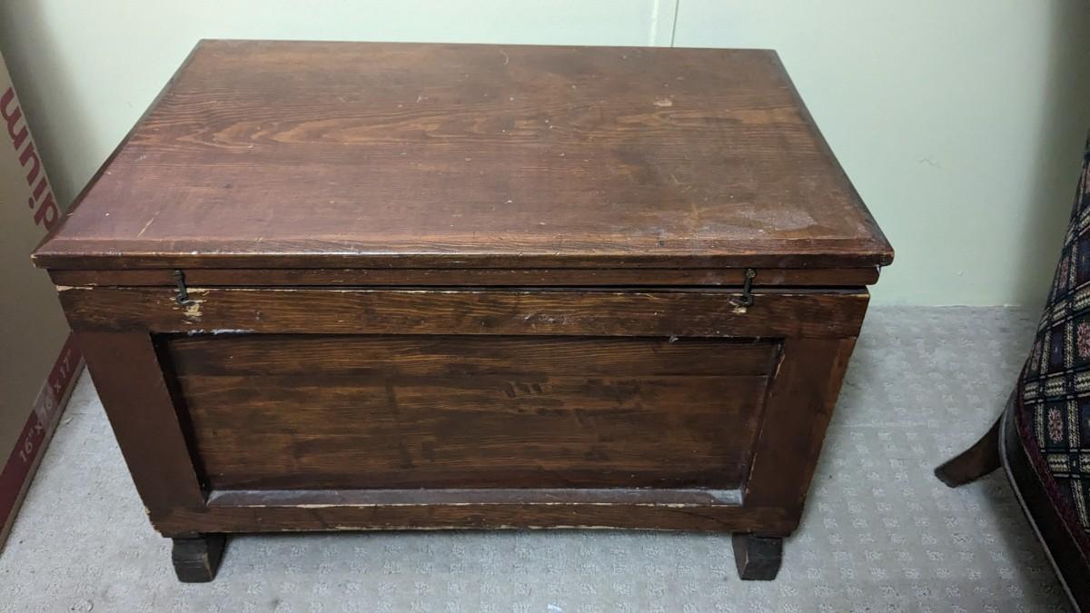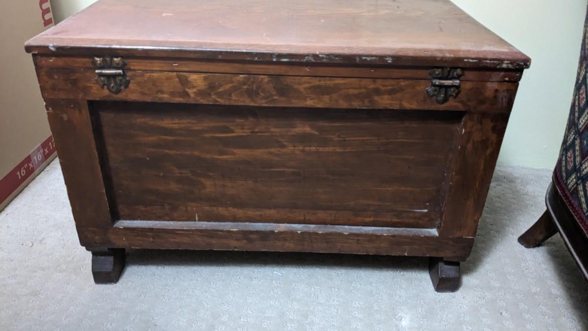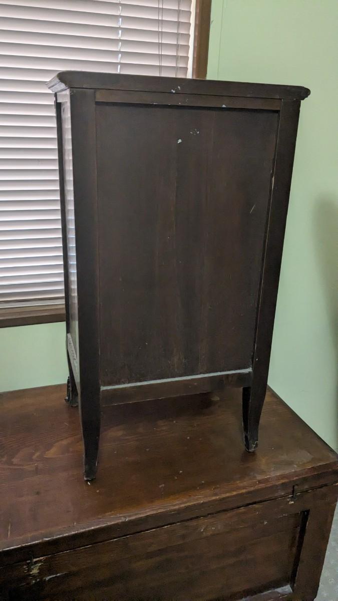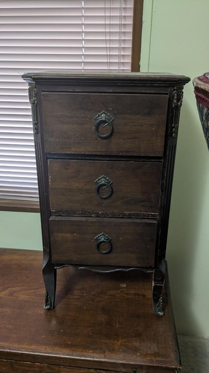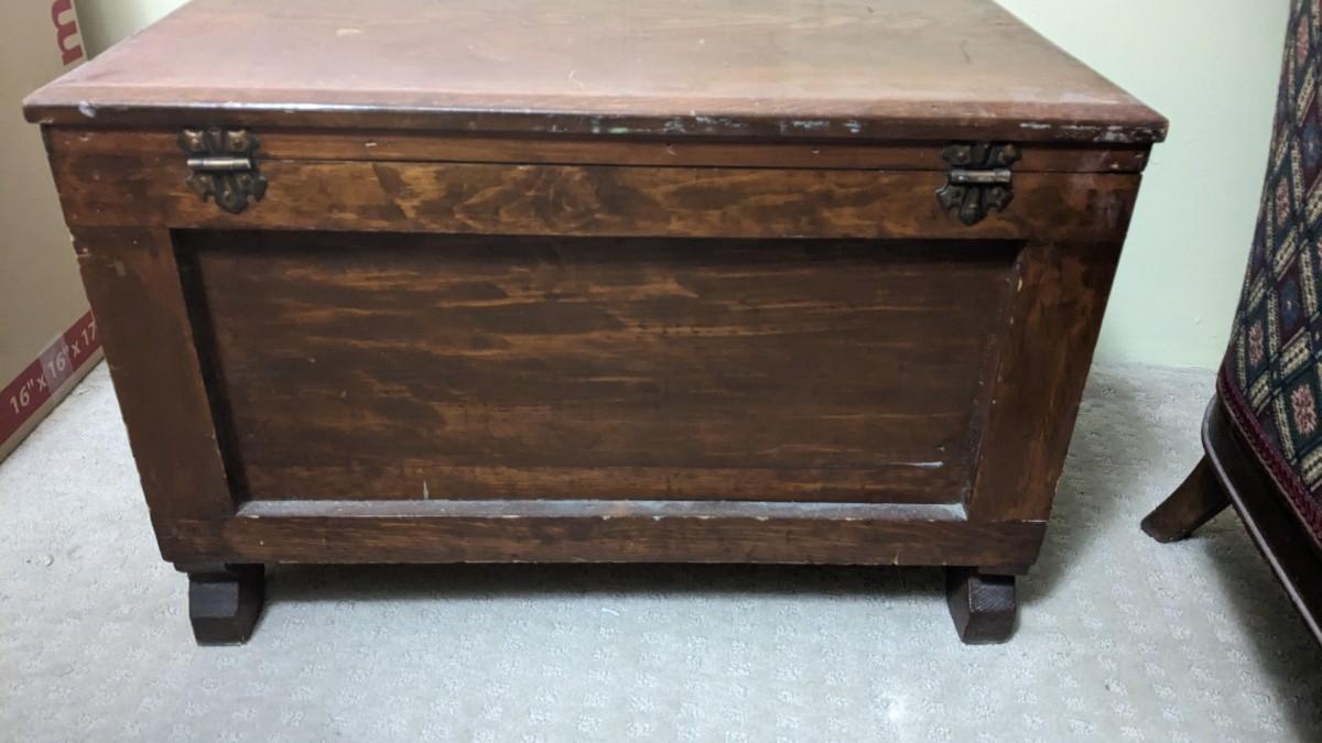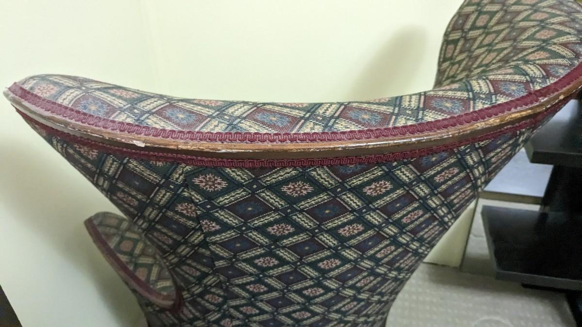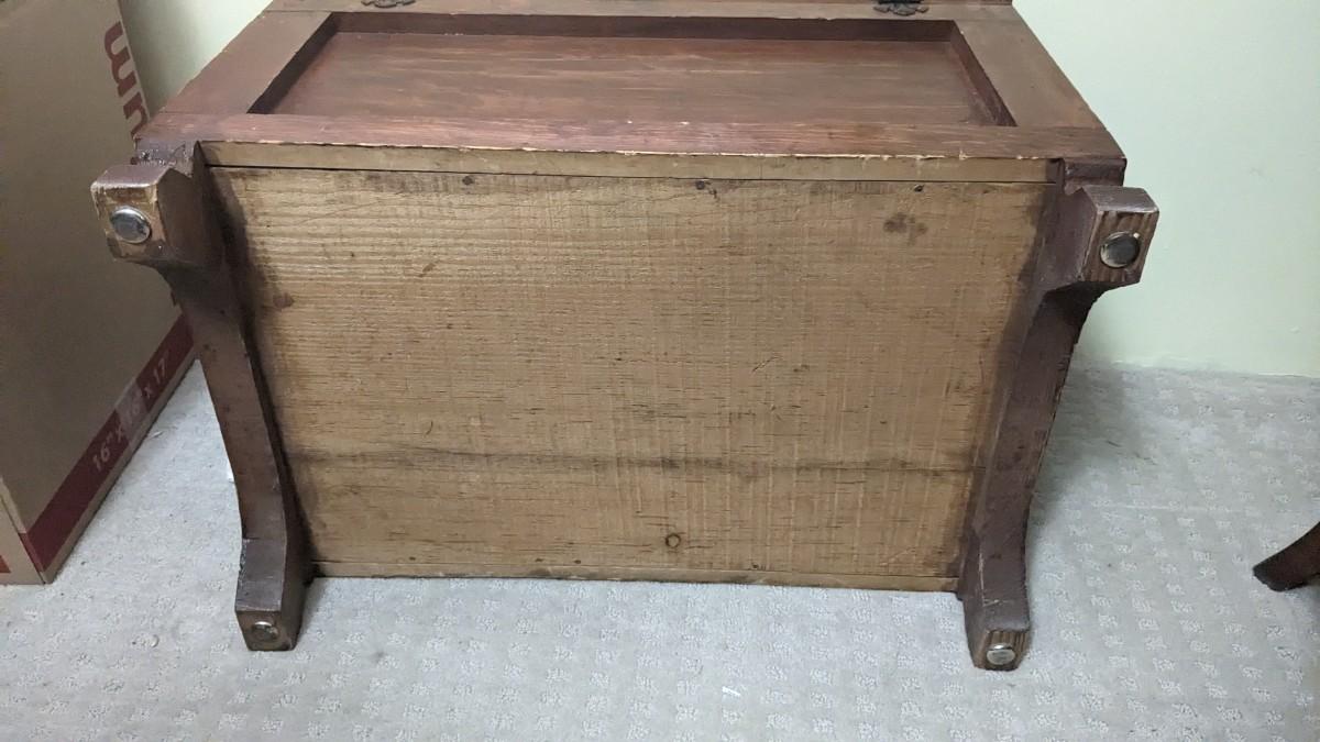 includes a stunning and ridiculously comfortable 37"x 21"x 42" wood frame wingback chair with hand carved embellishments where seat meets feet, seat sits14" from ground, with a lovely jewel tone upholstery job. Also includes a very nice mission style solid wood 26.75"x 17.25"x 17" storage chest, and a beautiful 10 5/8"x14.25"x 25" (3) drawer parlor table with stunning embellishments. Wear found to each piece, nothing that is structural-all cosmetic. No shipping. Winning bidder responsible for removal of all pieces. bdrm1