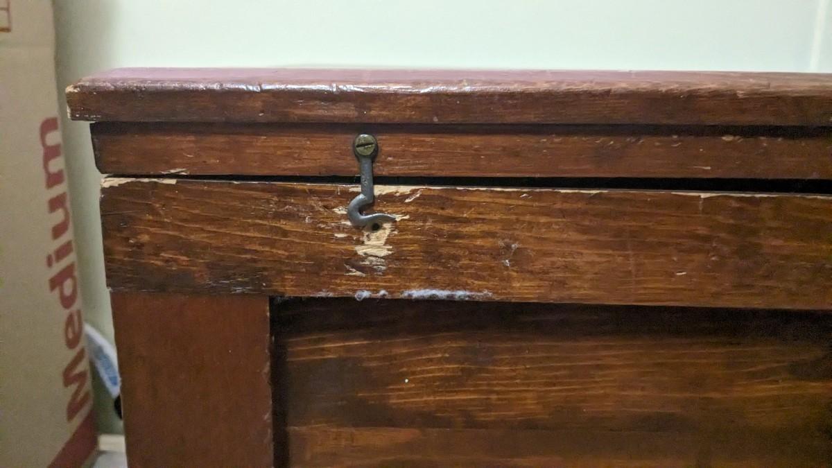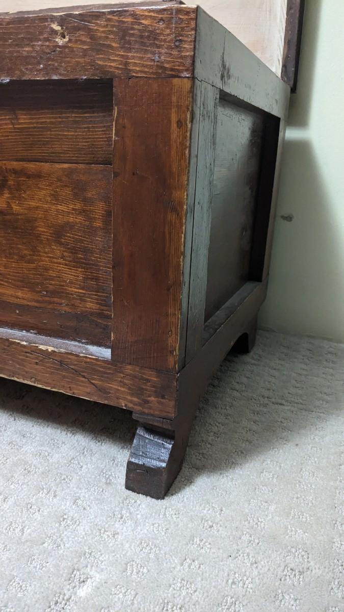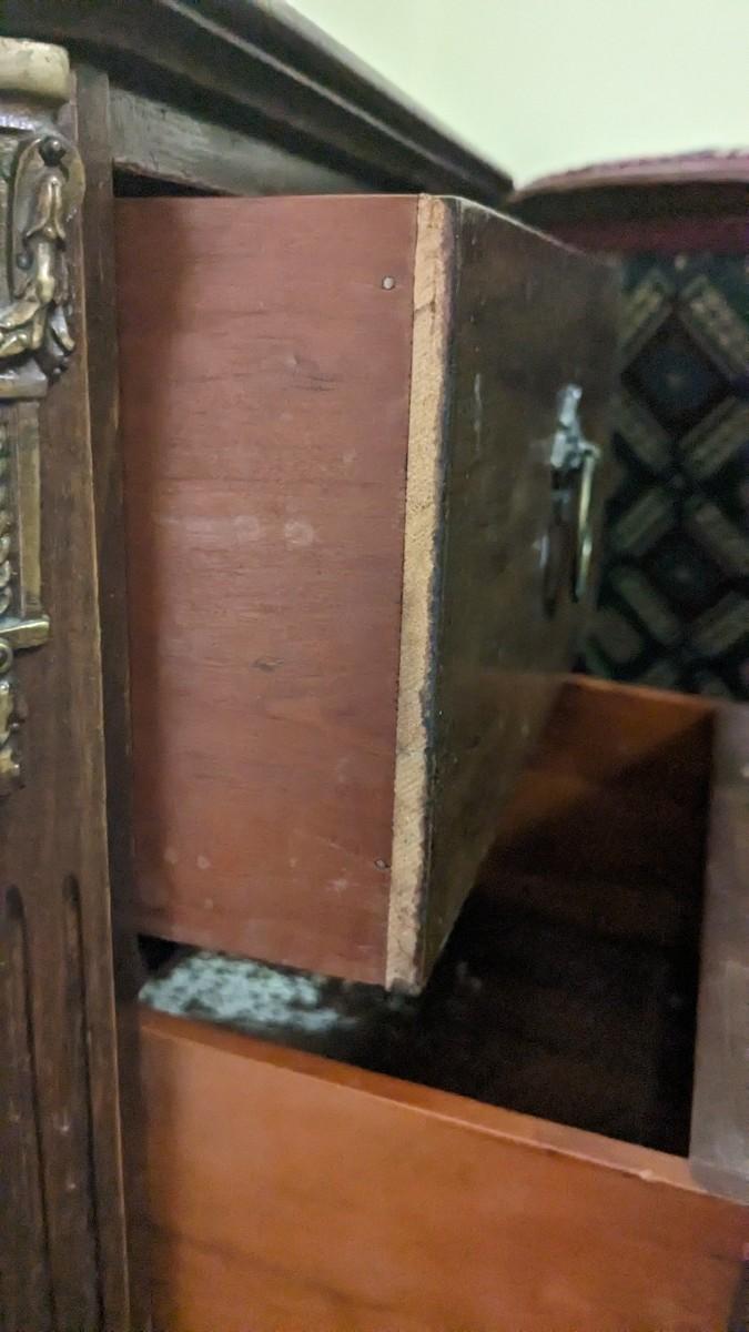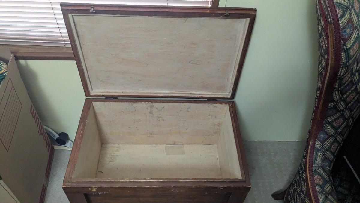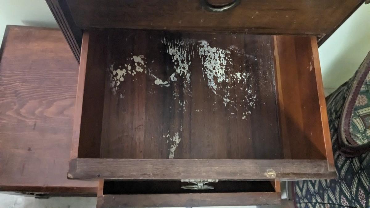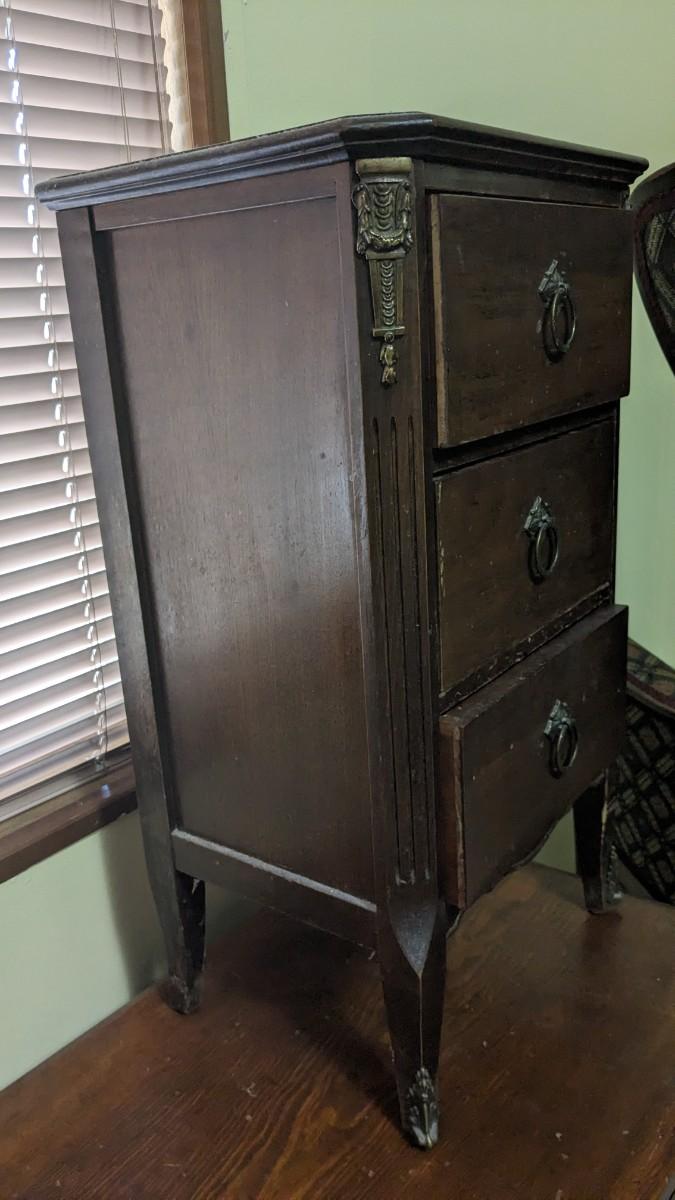 includes a stunning and ridiculously comfortable 37"x 21"x 42" wood frame wingback chair with hand carved embellishments where seat meets feet, seat sits14" from ground, with a lovely jewel tone upholstery job. Also includes a very nice mission style solid wood 26.75"x 17.25"x 17" storage chest, and a beautiful 10 5/8"x14.25"x 25" (3) drawer parlor table with stunning embellishments. Wear found to each piece, nothing that is structural-all cosmetic. No shipping. Winning bidder responsible for removal of all pieces. bdrm1