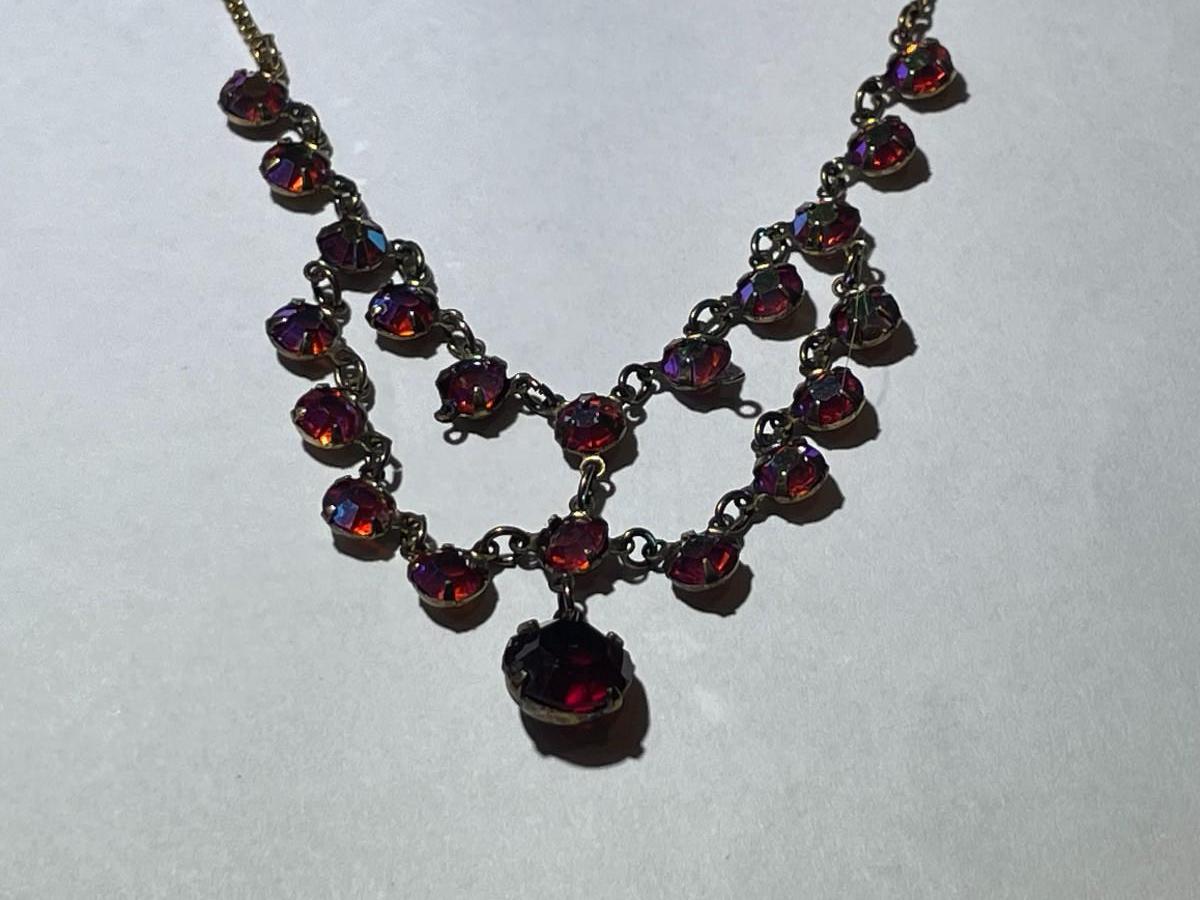 Antique Garnet Colored Rhinestone Dainty Necklace 16" in Very Good Preowned Condition.
