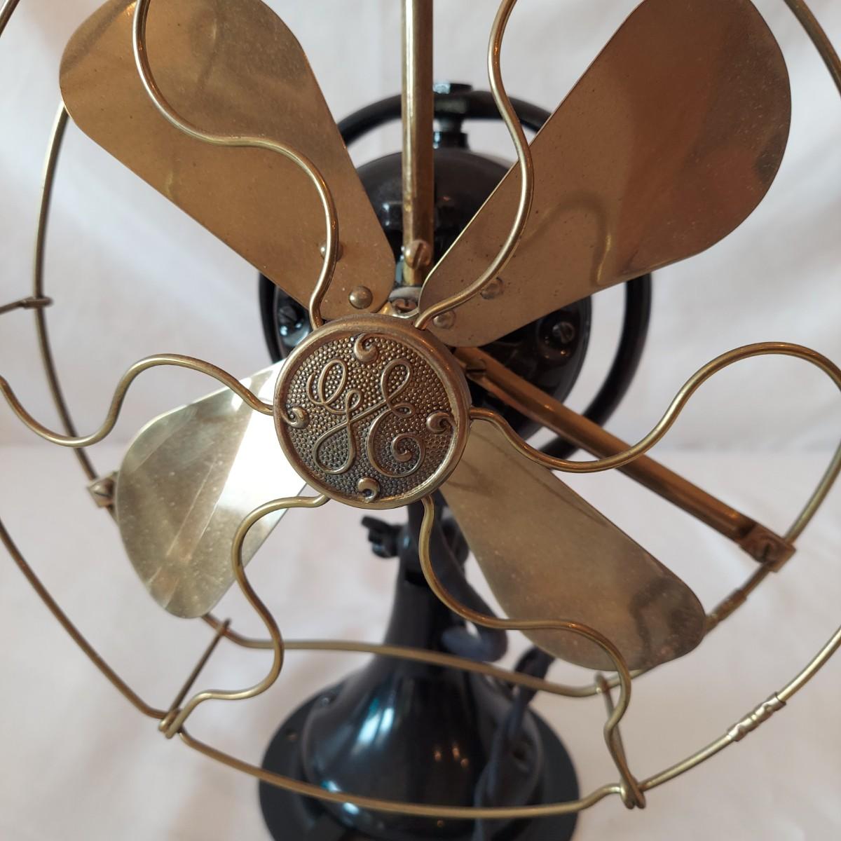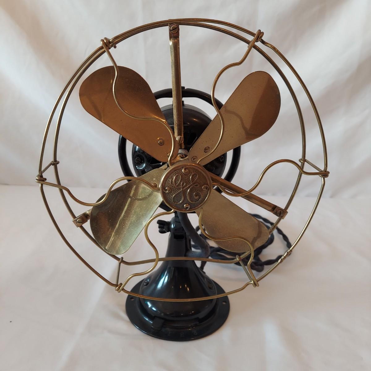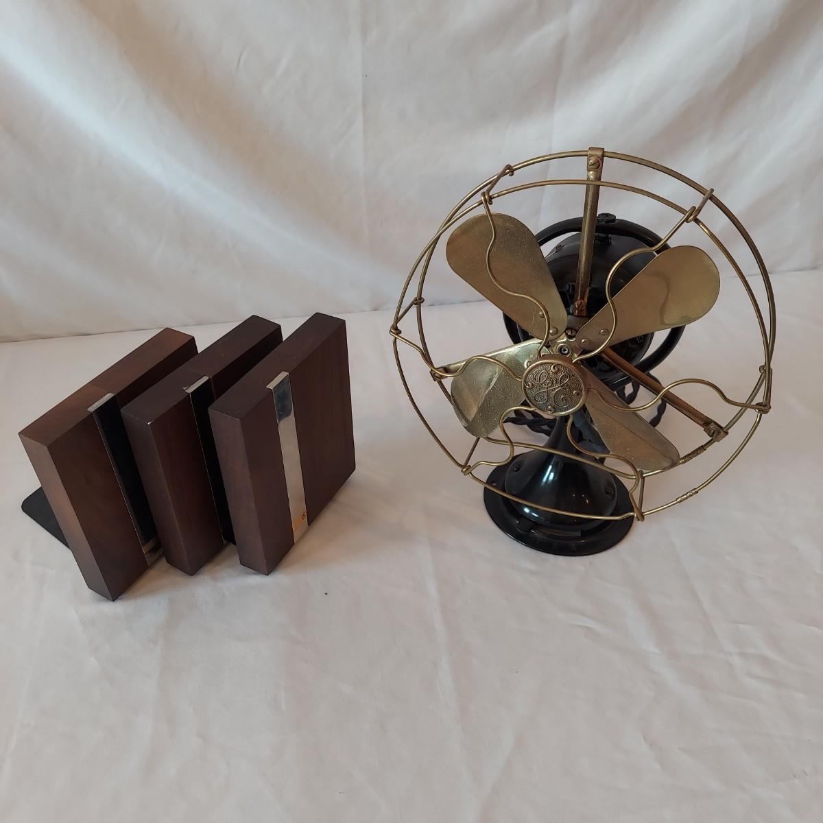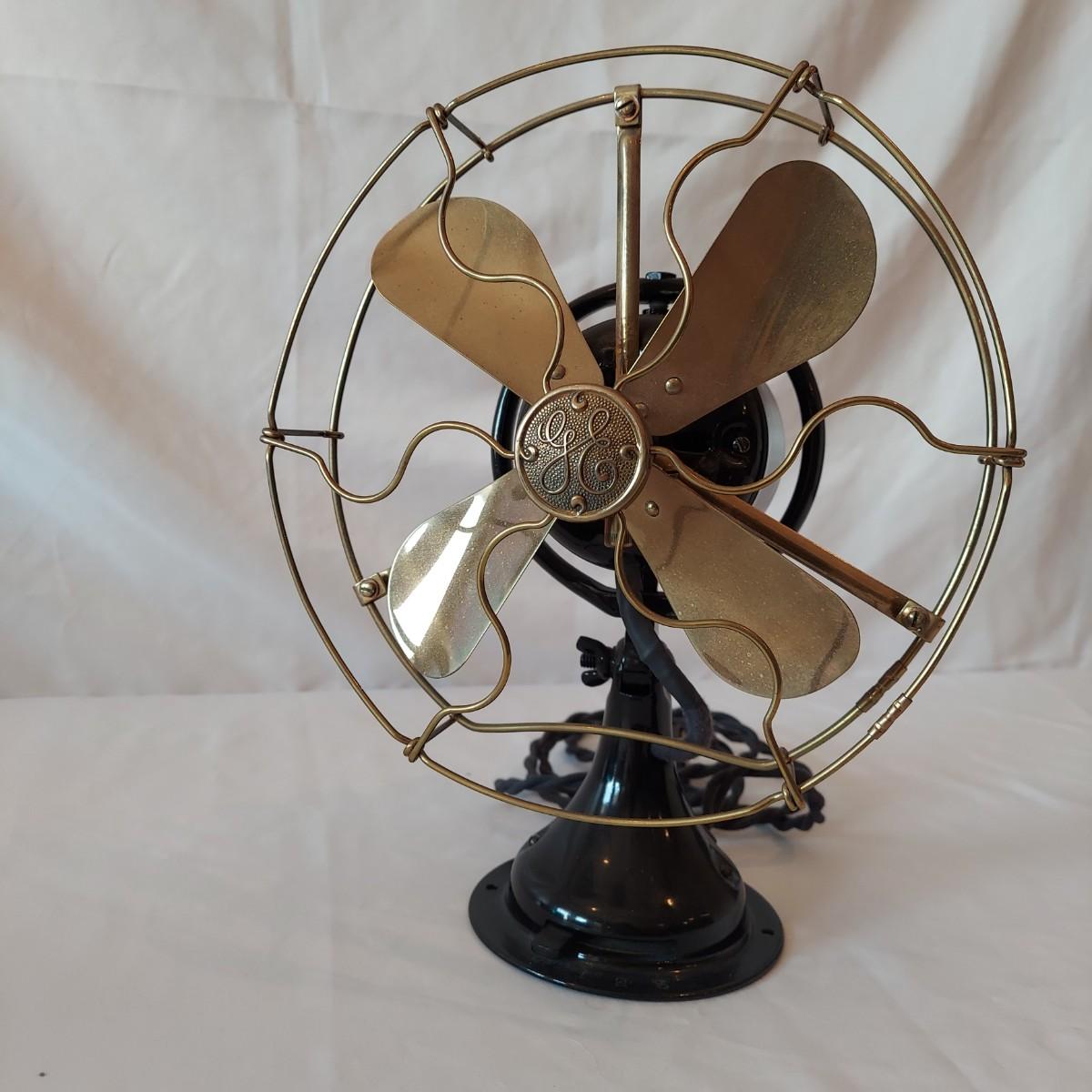 Early 1900s General Electric oscillating desk fan with brass blades and cage. Heavy metal base. Still wired. Plugged in and turned on but it did need the blades primed to begin spinning. Also included are three GE branded keepsake bookends. They are 5" x 6" x 6"H. The fan measures approximately 9" x 7" x 12"H. Shipping available