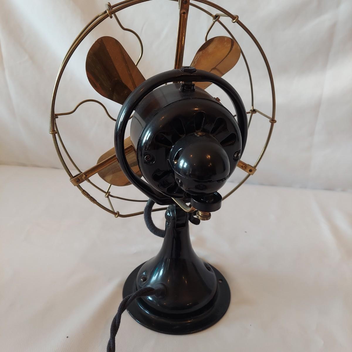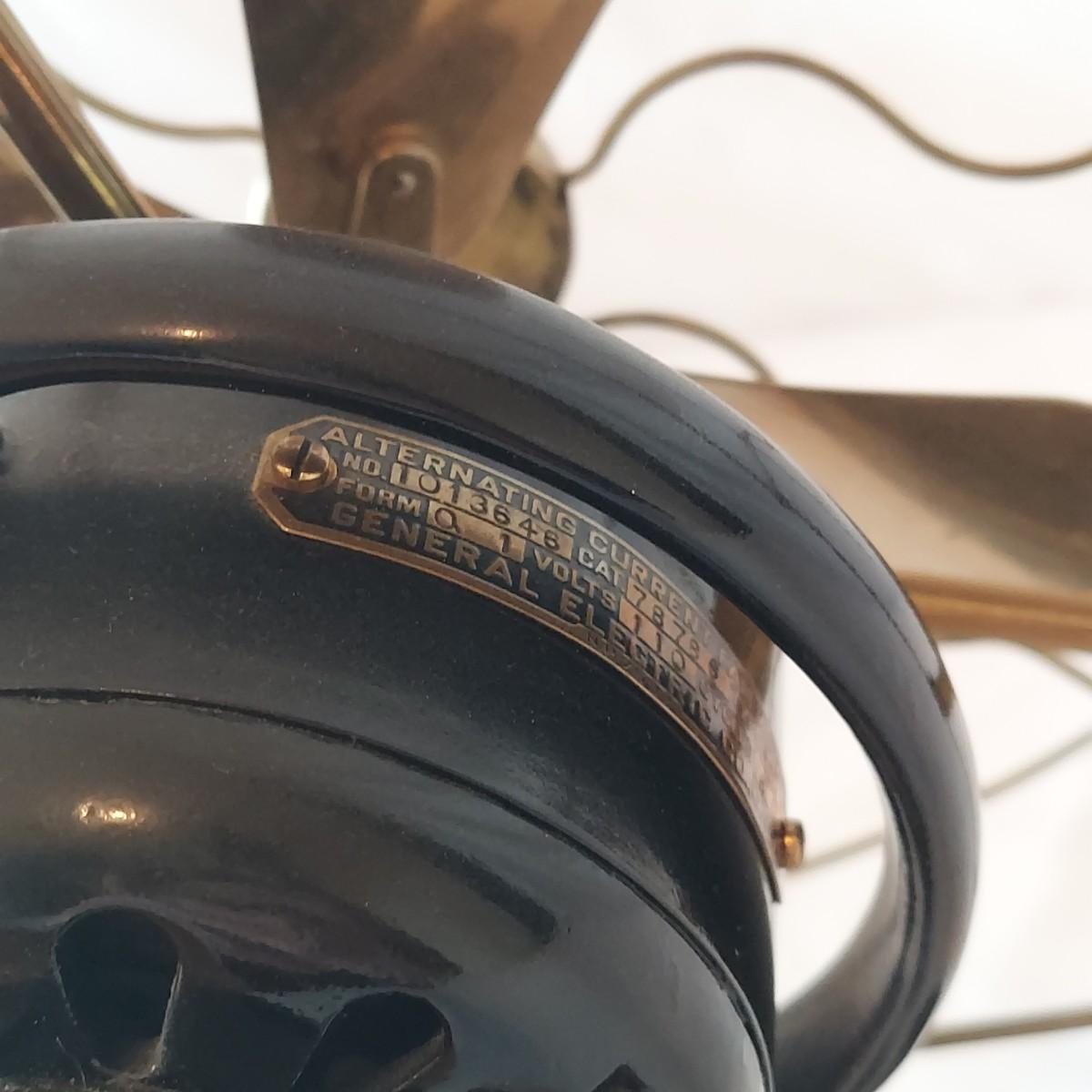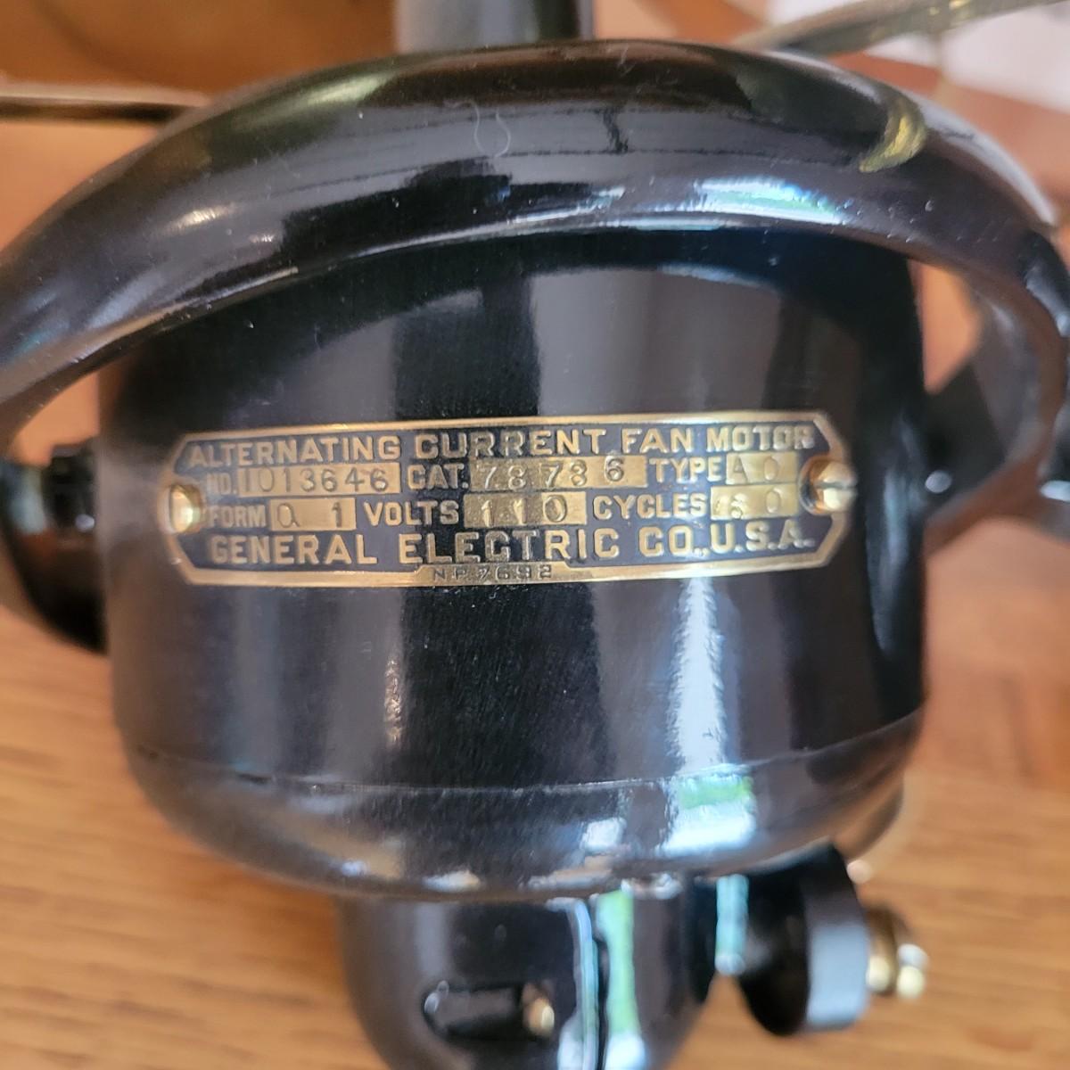 Early 1900s General Electric oscillating desk fan with brass blades and cage. Heavy metal base. Still wired. Plugged in and turned on but it did need the blades primed to begin spinning. Also included are three GE branded keepsake bookends. They are 5" x 6" x 6"H. The fan measures approximately 9" x 7" x 12"H. Shipping available