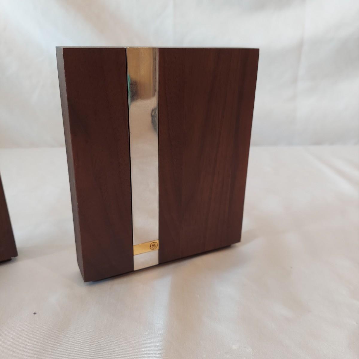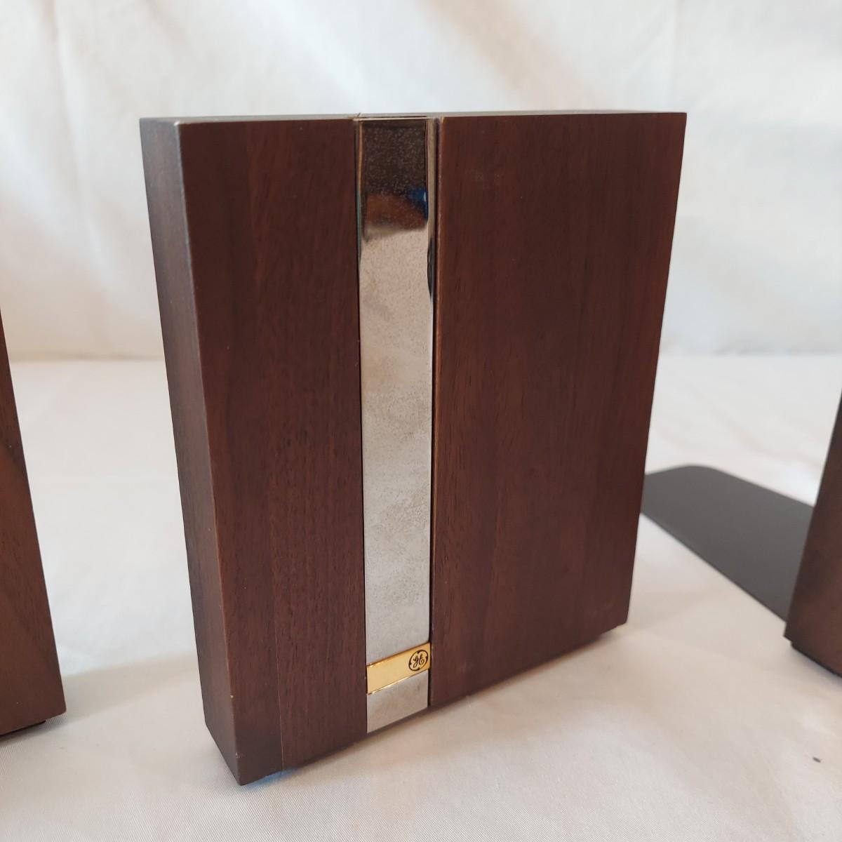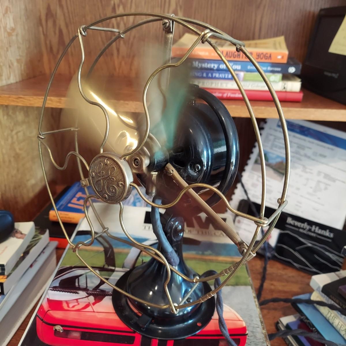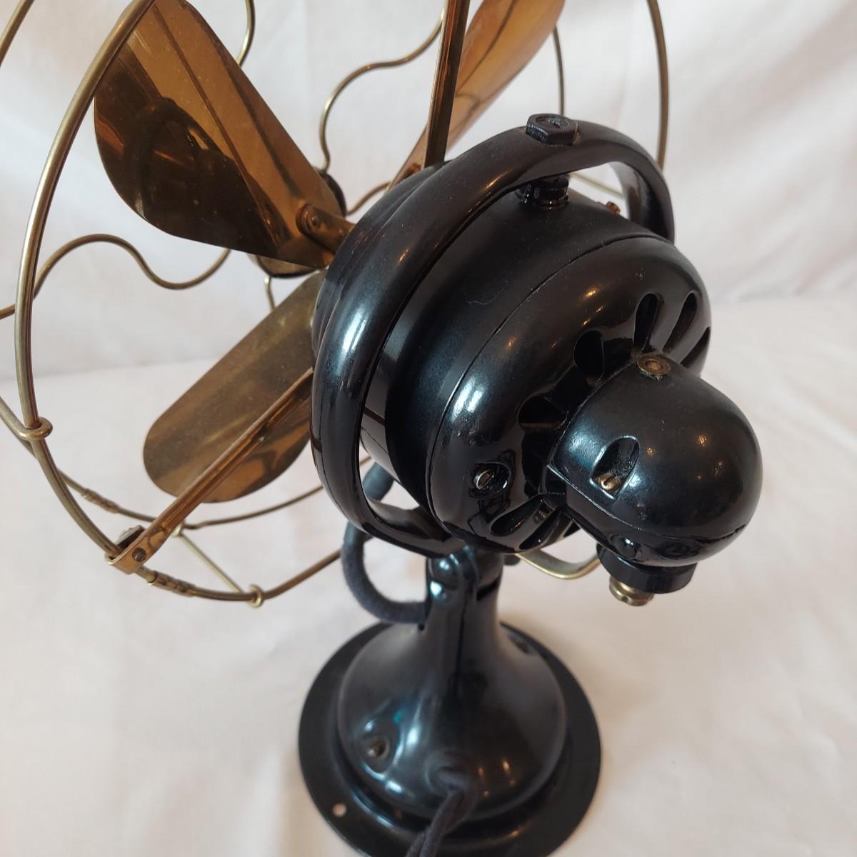 Early 1900s General Electric oscillating desk fan with brass blades and cage. Heavy metal base. Still wired. Plugged in and turned on but it did need the blades primed to begin spinning. Also included are three GE branded keepsake bookends. They are 5" x 6" x 6"H. The fan measures approximately 9" x 7" x 12"H. Shipping available