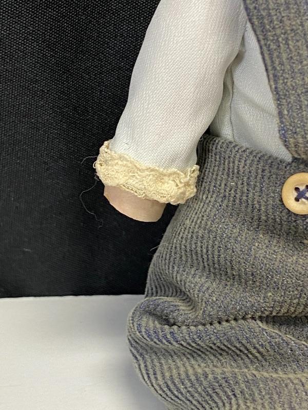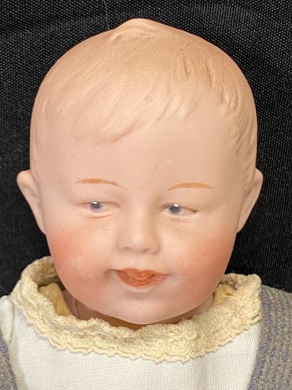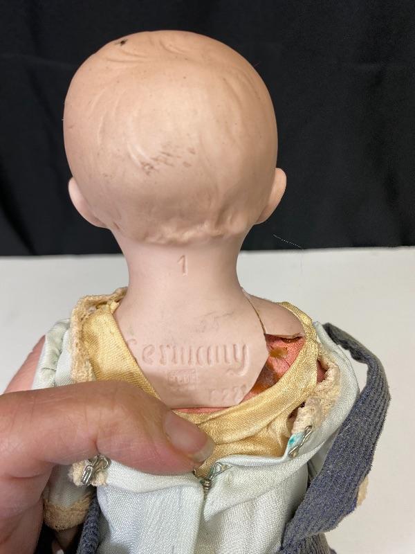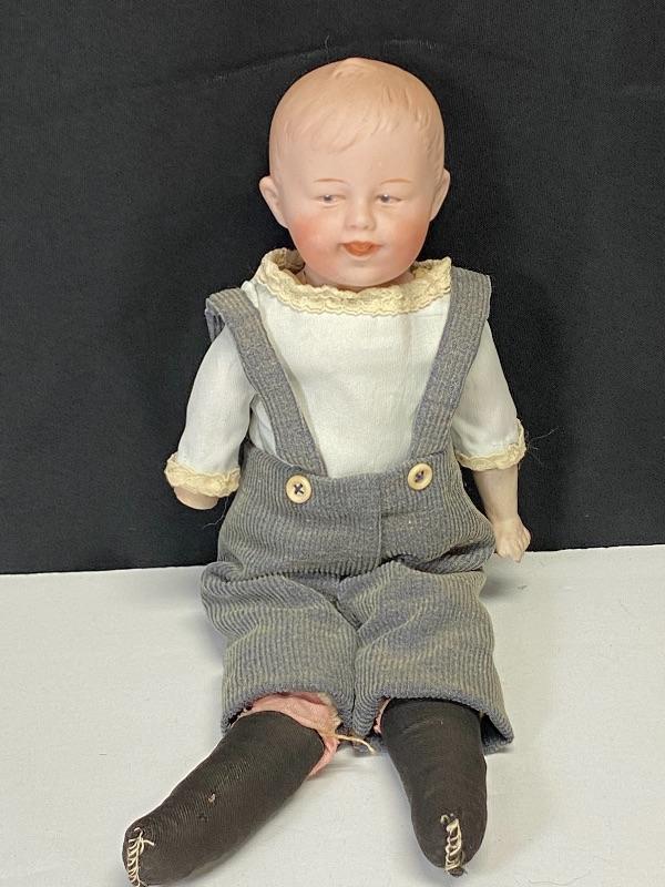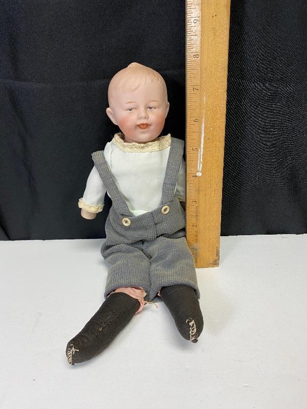 Antique Gebruder Heubach #1 bisque shoulder head doll. Boy doll with a happy face. He is marked on neck. Unfortunately he has some issues. Part of the shoulder plate has broken and been repaired, unseen because of clothes. He is also missing one arm. He seems to have a bisque head, composite arms and cloth body and legs which similar dolls this age did. The number on neck is 8991 I believe. About 12" size.
