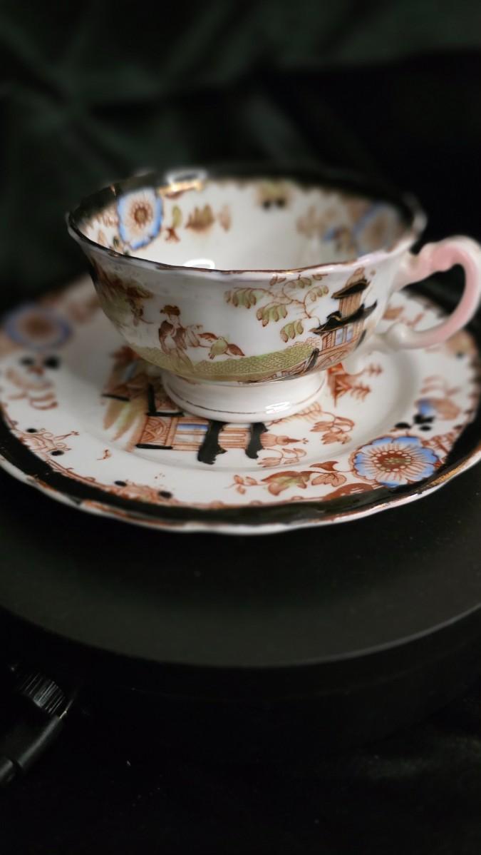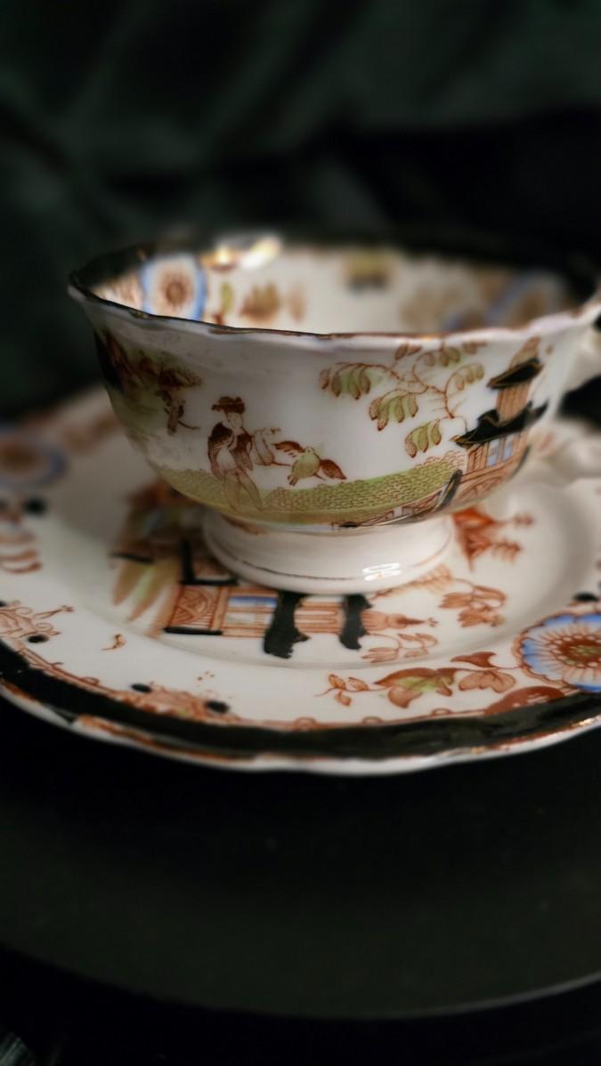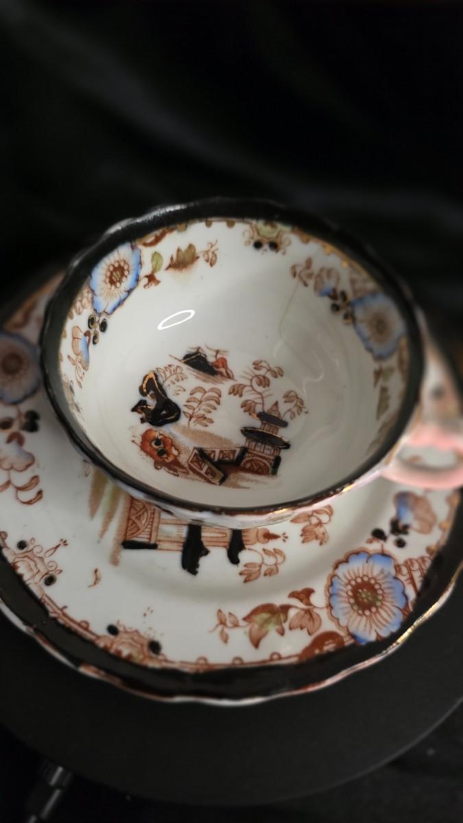 Antique Georgian Chinoiserie Teacup & Saucer — Kepple, Clare Street Bristol (Hand-Painted, Black Rim)