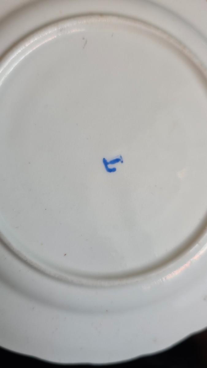 The cup’s gently flared form sits atop a raised foot, perfectly balanced on a matching scalloped saucer that continues the same garden scene in full. Inside the bowl, the imagery repeats—an immersive touch seen only in fine hand-painted wares of this era. Beneath the base, a discreet underglaze blue “L” mark may denote its originating pottery. Minor wear to gilding and enamel reflects its age with honesty, not flaw—evidence of over a century of careful admiration.