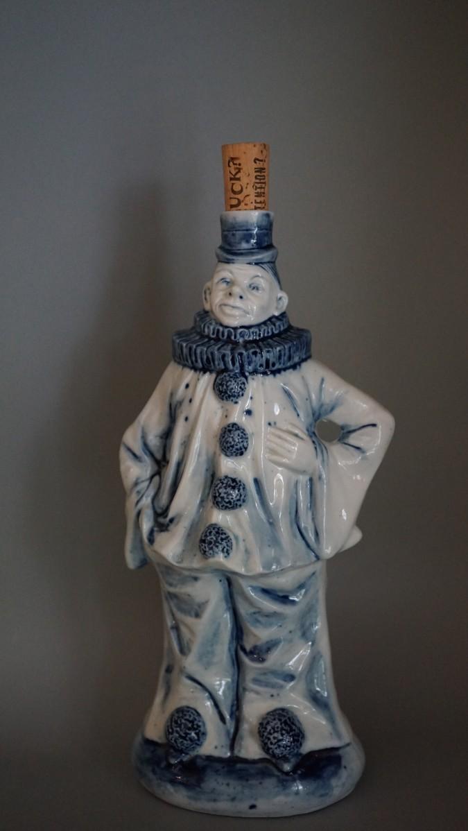 ANTIQUE GERMAN BLUE & WHITE PORCELAIN CHARACTER LIQUOR FLASK /CLOWN CHARACTER 12 1/2"