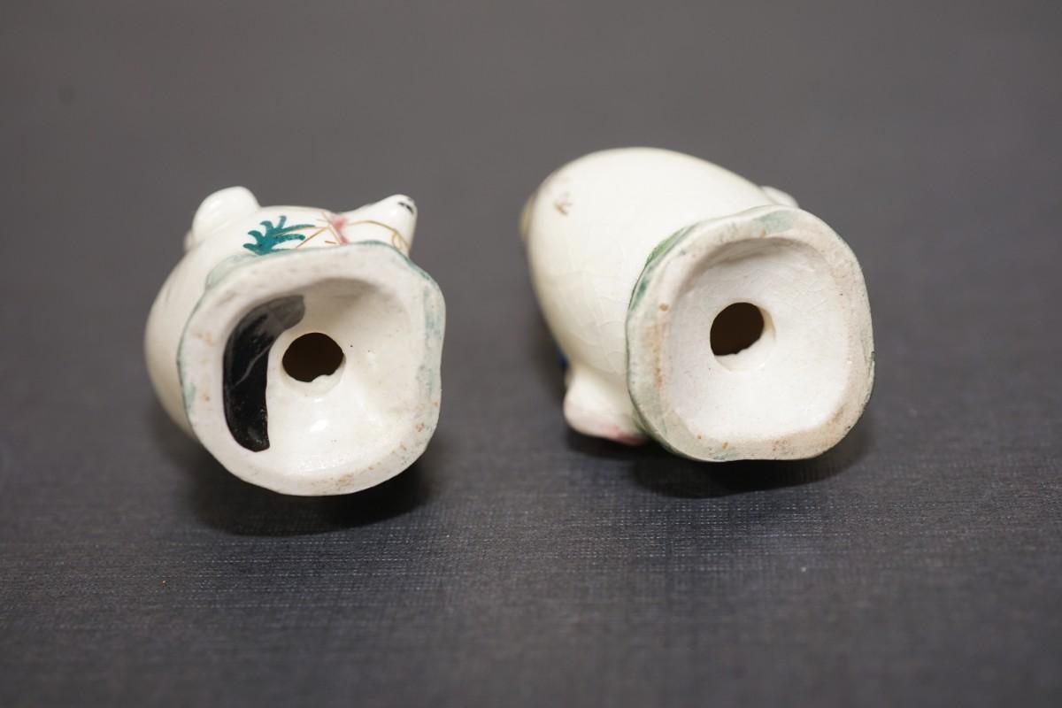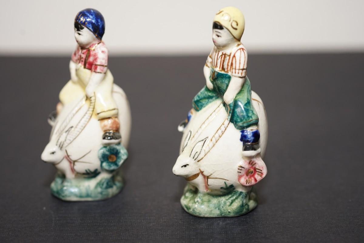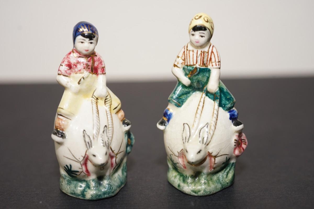 hand painted salt and pepper shakers. rabbits egg shaped, hand painted characters riding the backs