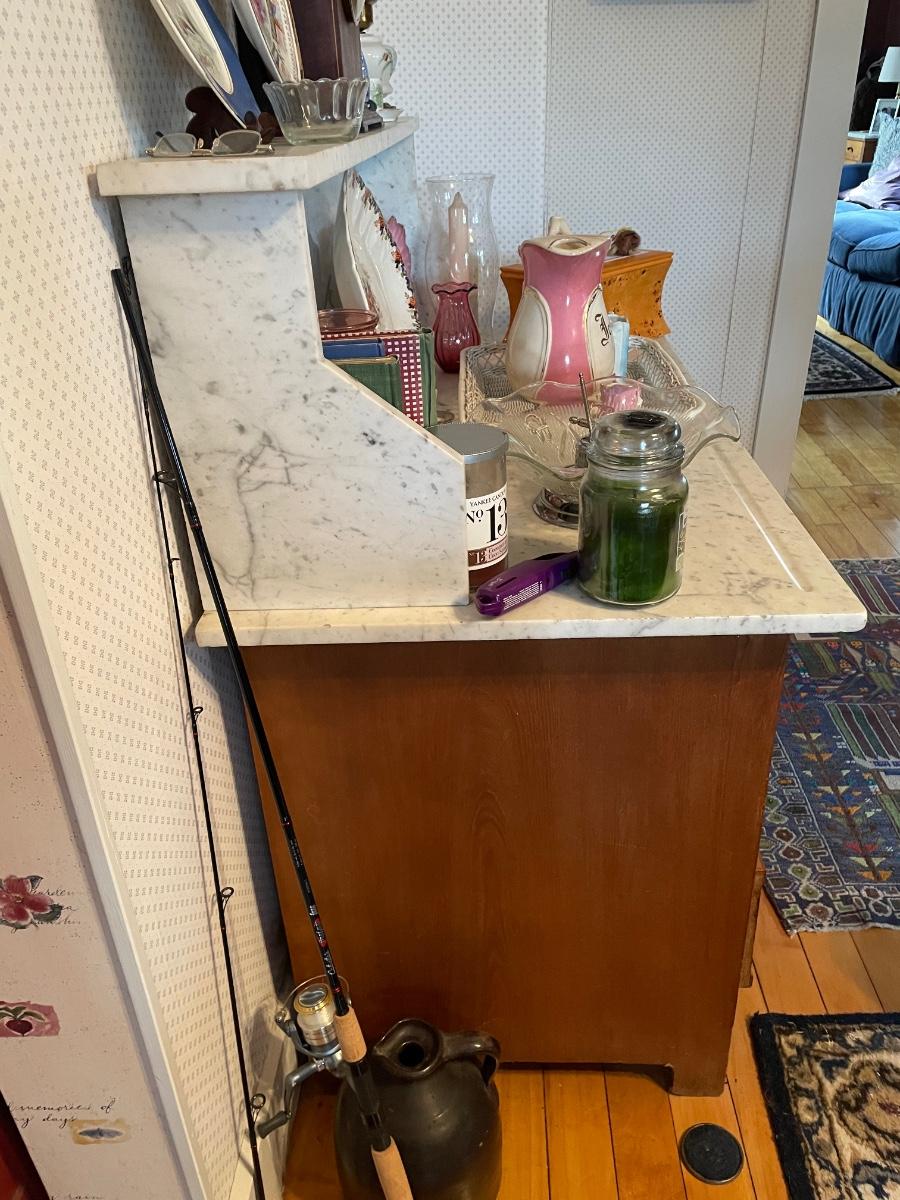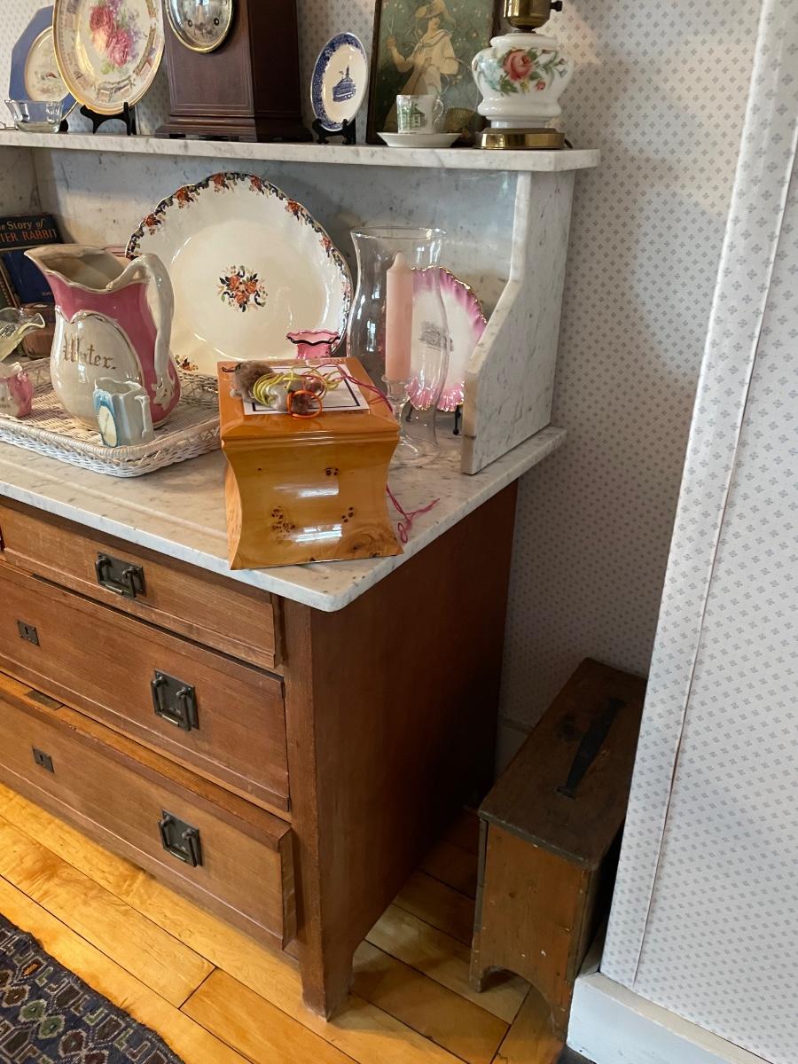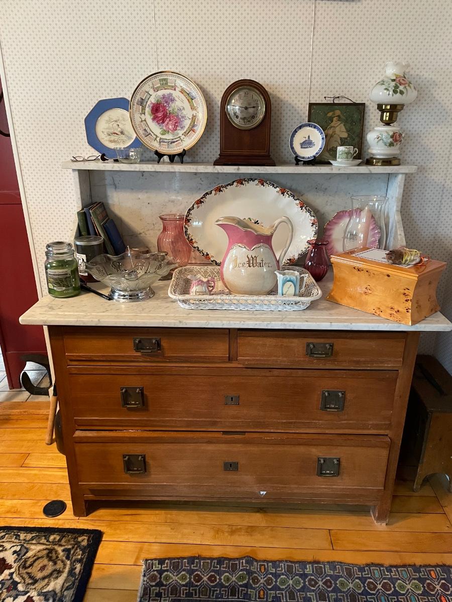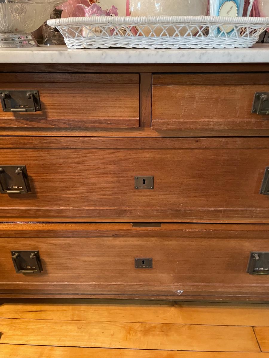 Beautiful piece brought from Germany many years ago. Measures 23.5” deep x 47” wide x 45” high. Some small chips on marble edge. Brass hardware. Bottom draw sticks and isn’t closing properly. Heavy, two people needed to move.