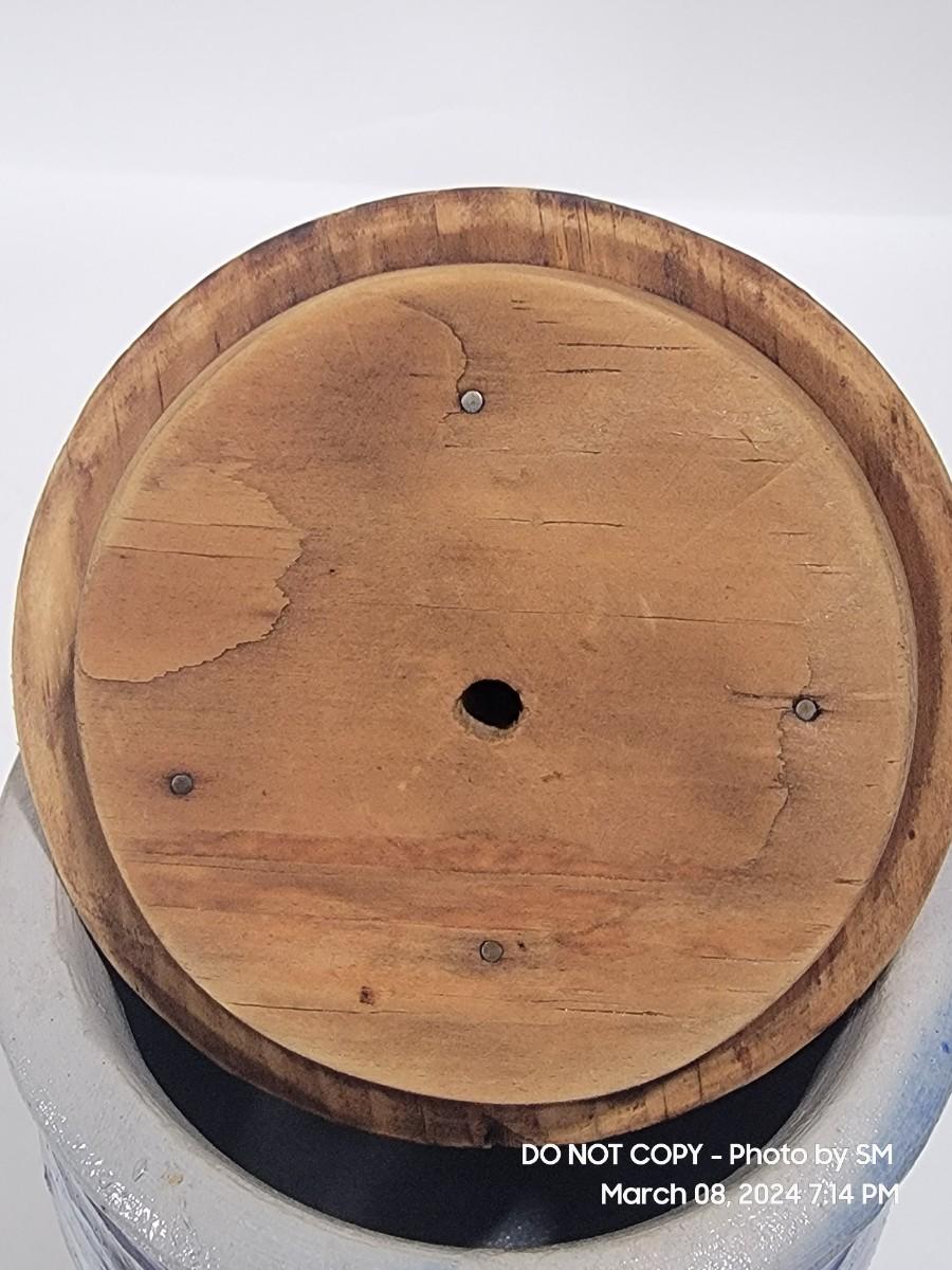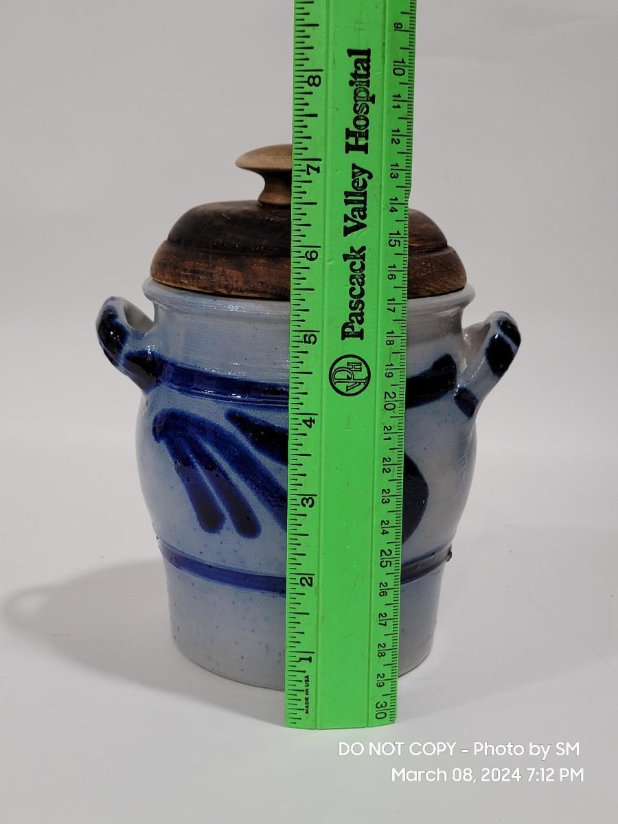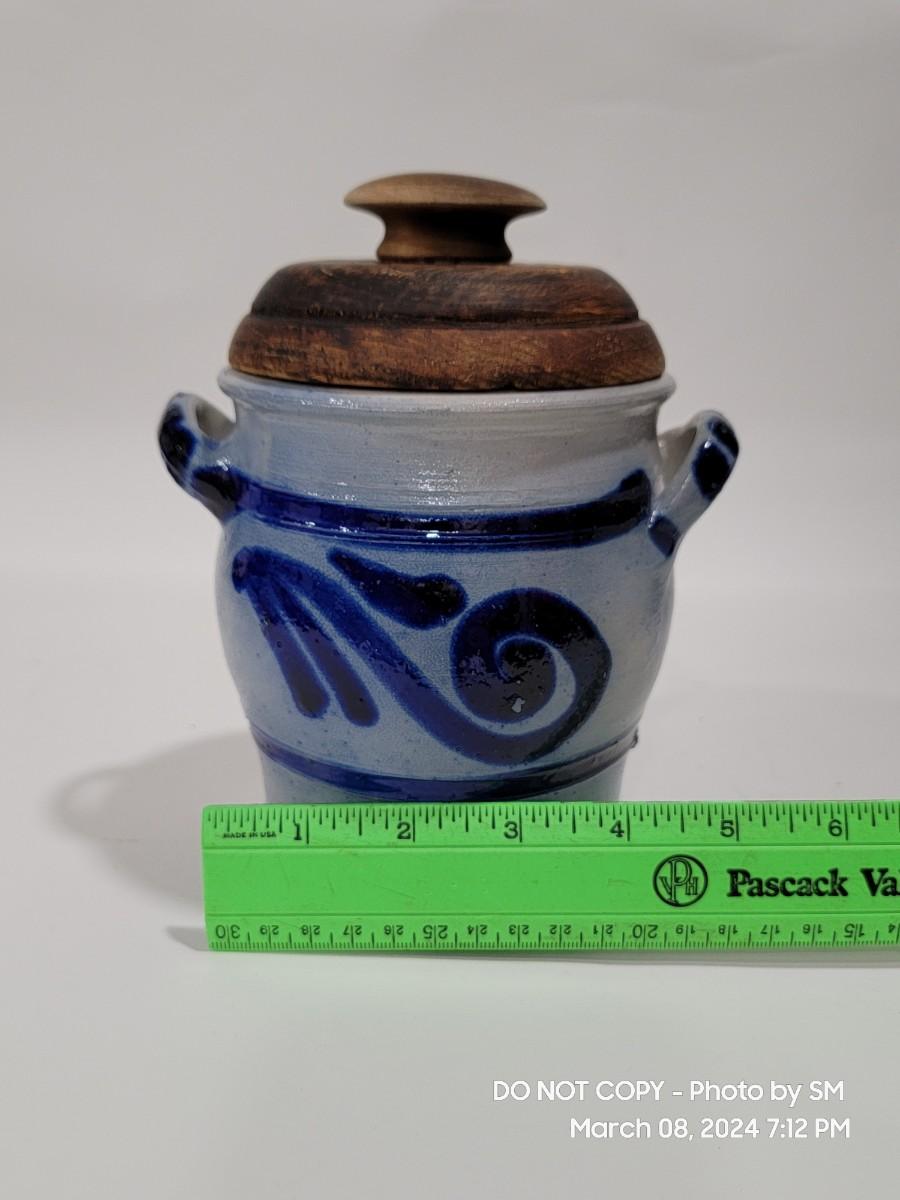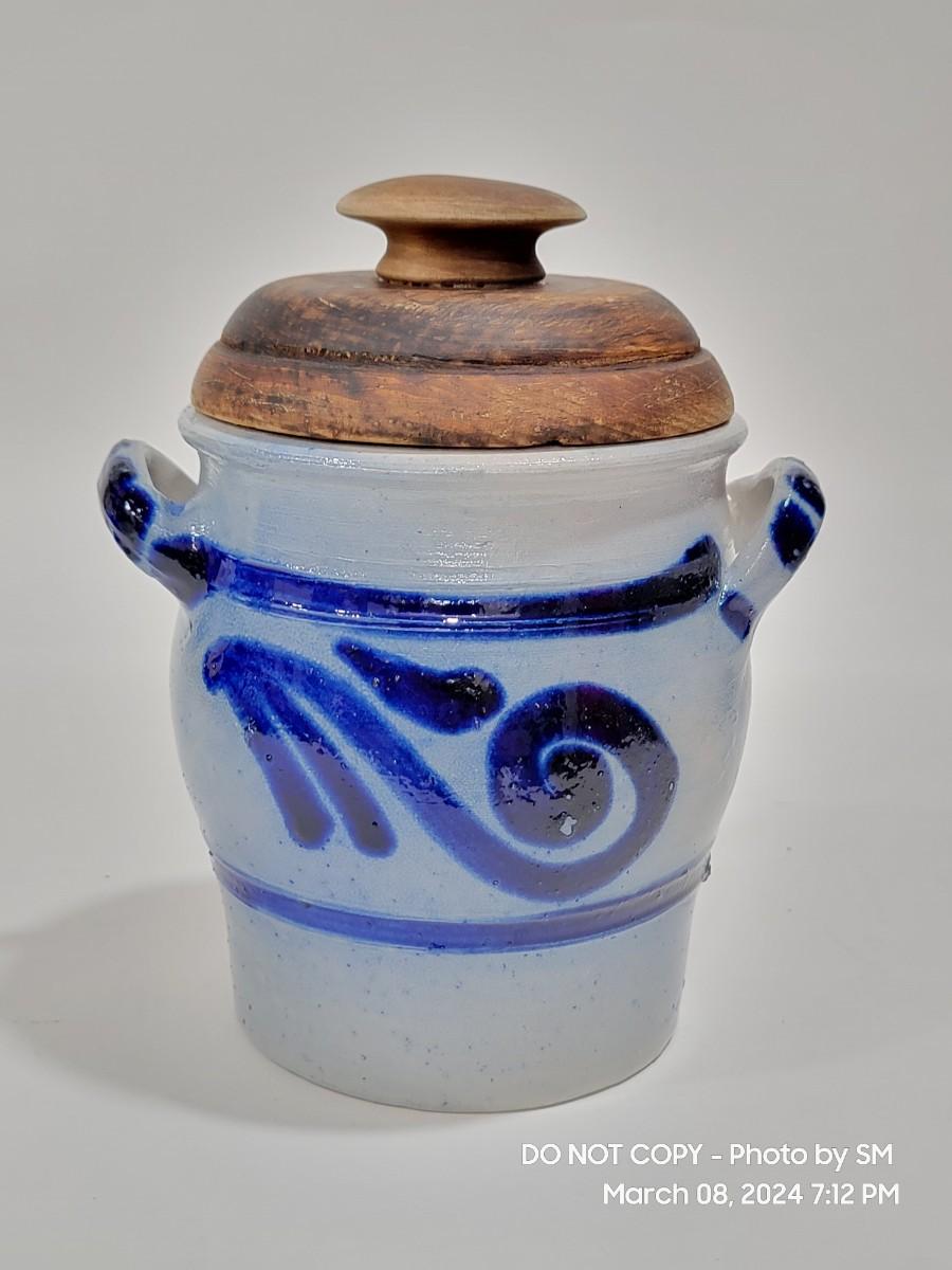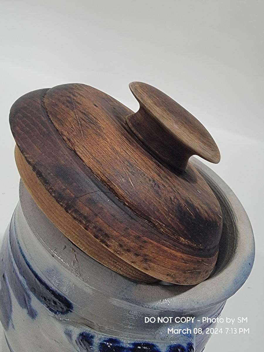 This comes from Germany and was in the family for three generations (my client was in her 40s agewise, this was her grandmothers). Unsure of exact age but it came from Germany and based on the age of the fa.ily generations this is approximately 100 years old give or take. It is a small wood covered crock or maybe a salt well / holder. The wood lid has nails, see photos... that tells you more about age. I think its perfect, but if you dont like handmade, non uniform patterns than this is not for you. No cracks no chips. Its heavy.