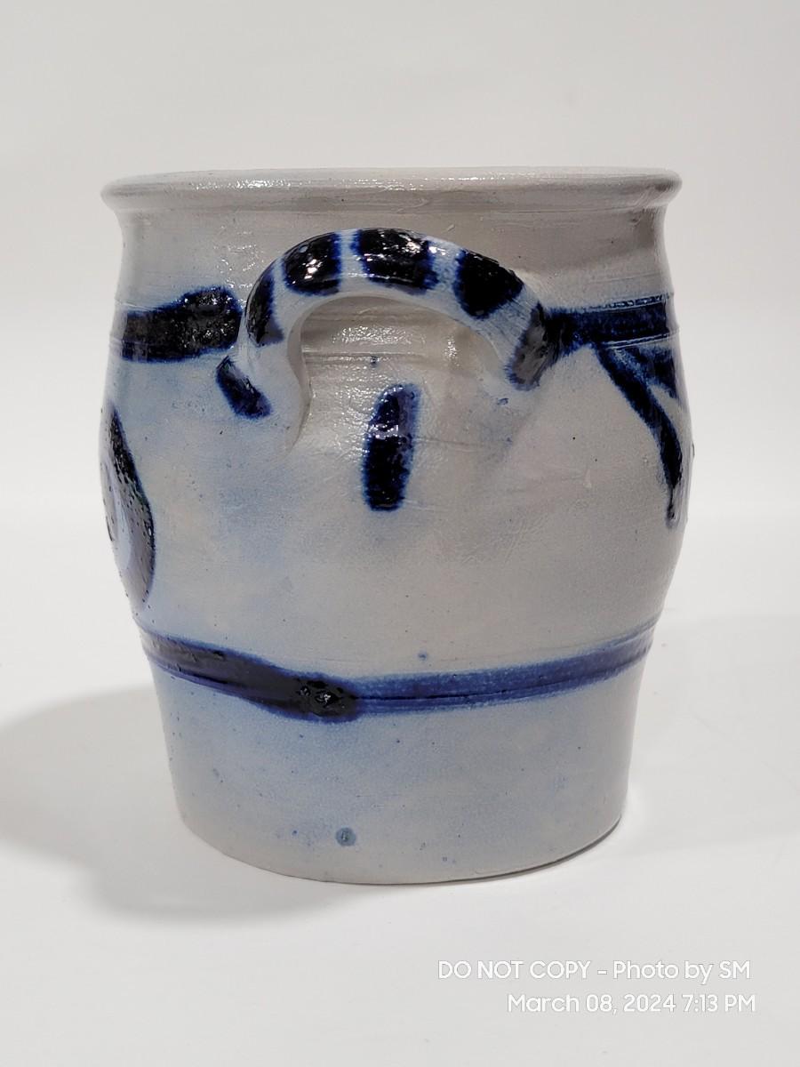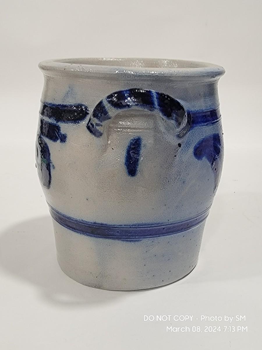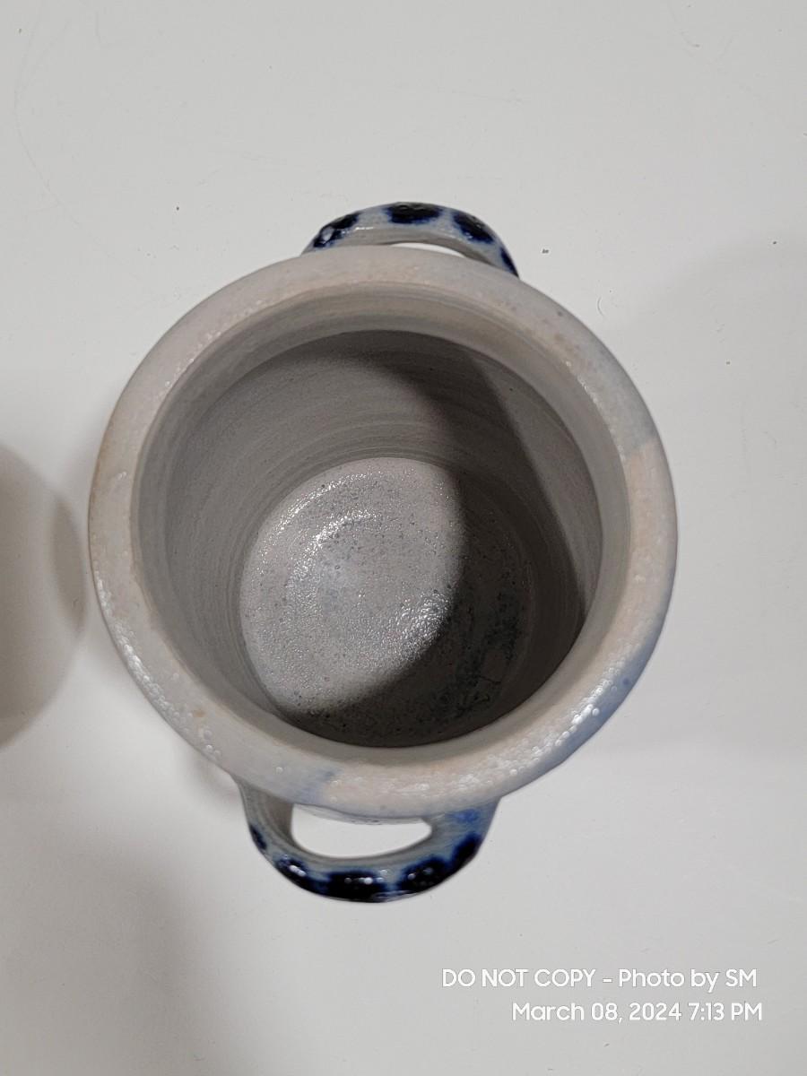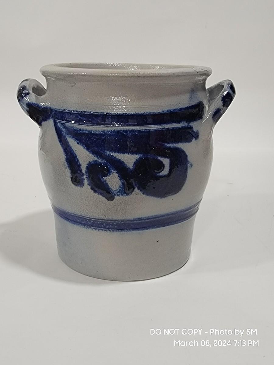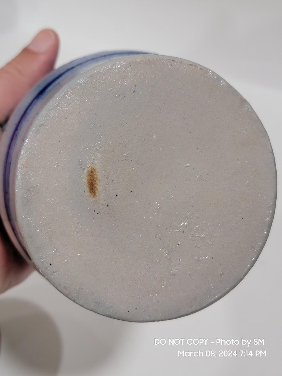 This comes from Germany and was in the family for three generations (my client was in her 40s agewise, this was her grandmothers). Unsure of exact age but it came from Germany and based on the age of the fa.ily generations this is approximately 100 years old give or take. It is a small wood covered crock or maybe a salt well / holder. The wood lid has nails, see photos... that tells you more about age. I think its perfect, but if you dont like handmade, non uniform patterns than this is not for you. No cracks no chips. Its heavy.
