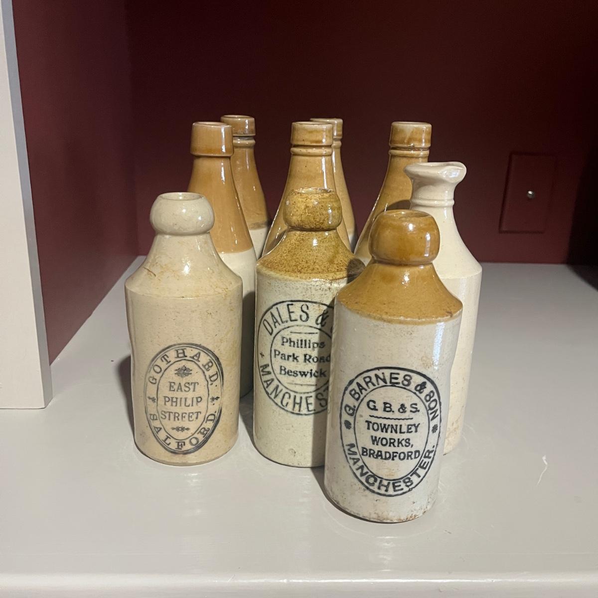 Lot contains a collection of ten antique-style ginger beer stoneware bottles with the largest bottles measuring 3”D x 8.5”H.