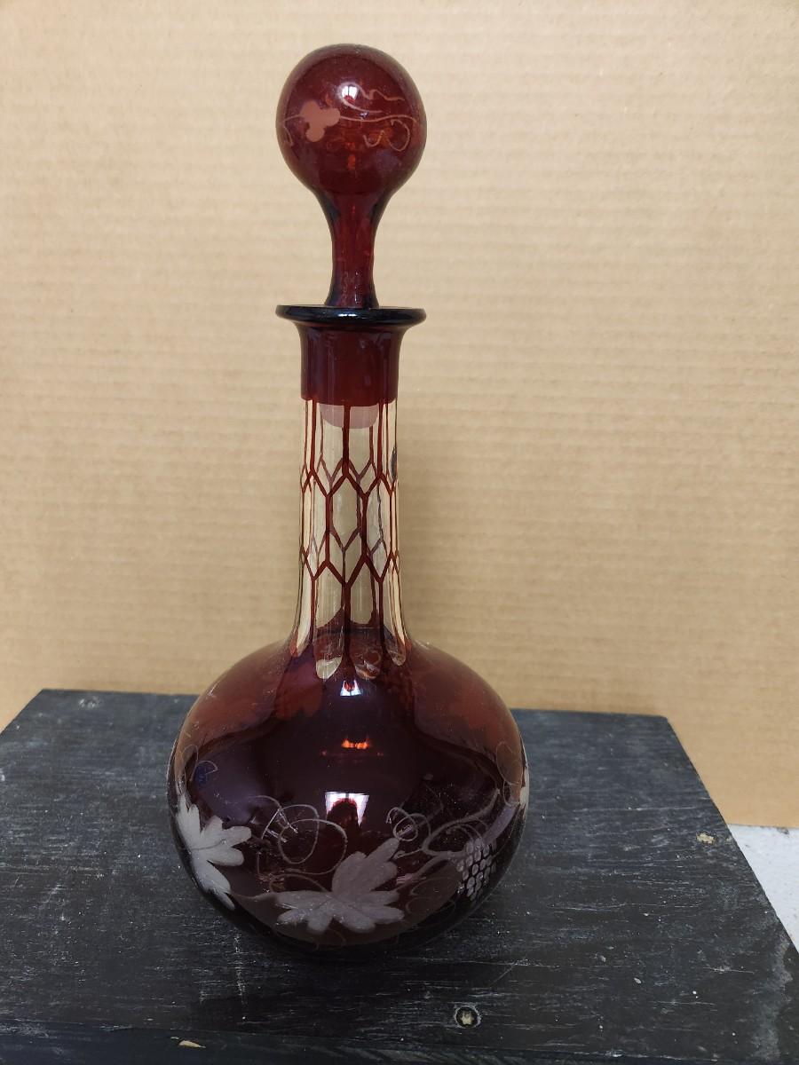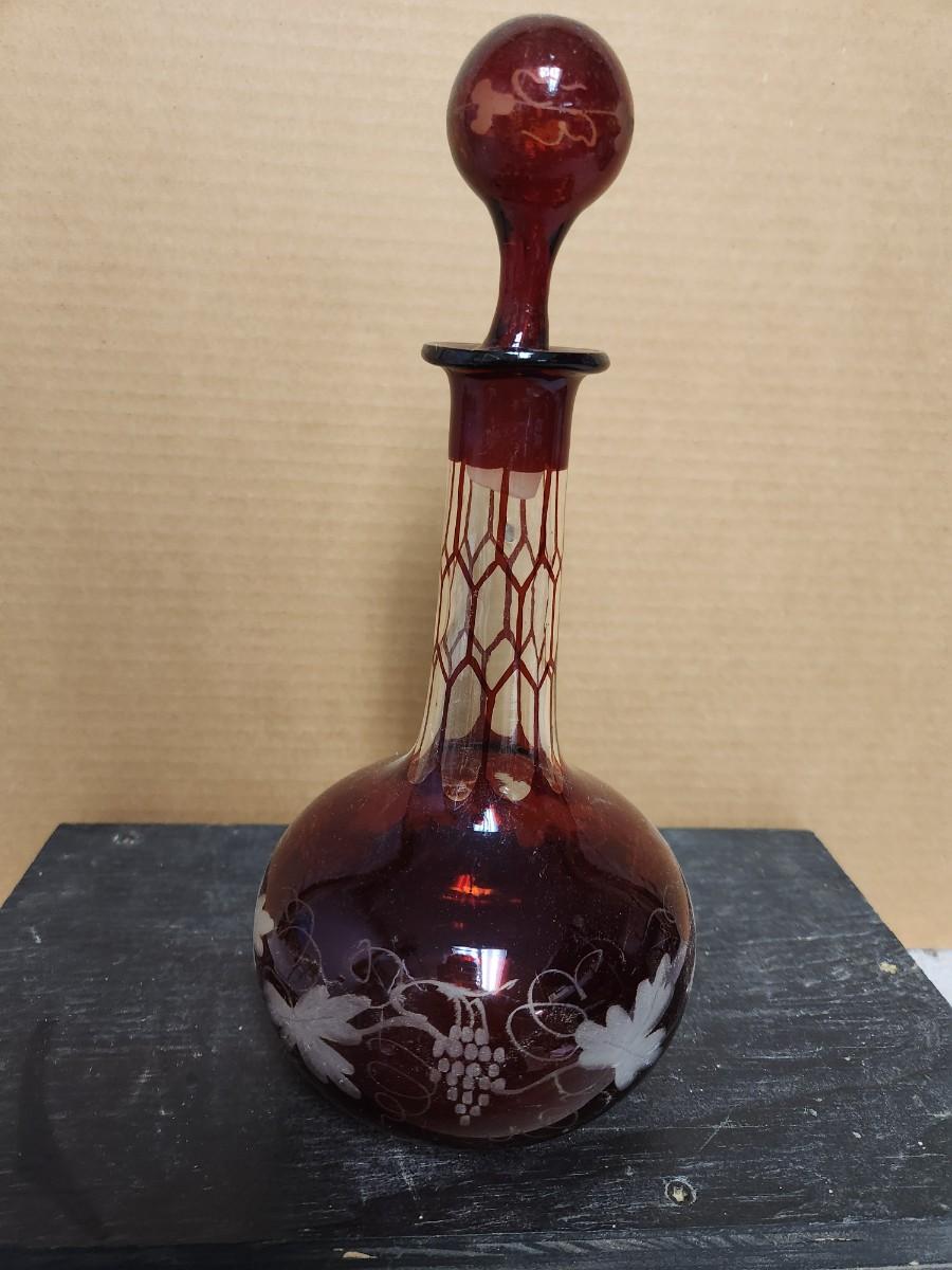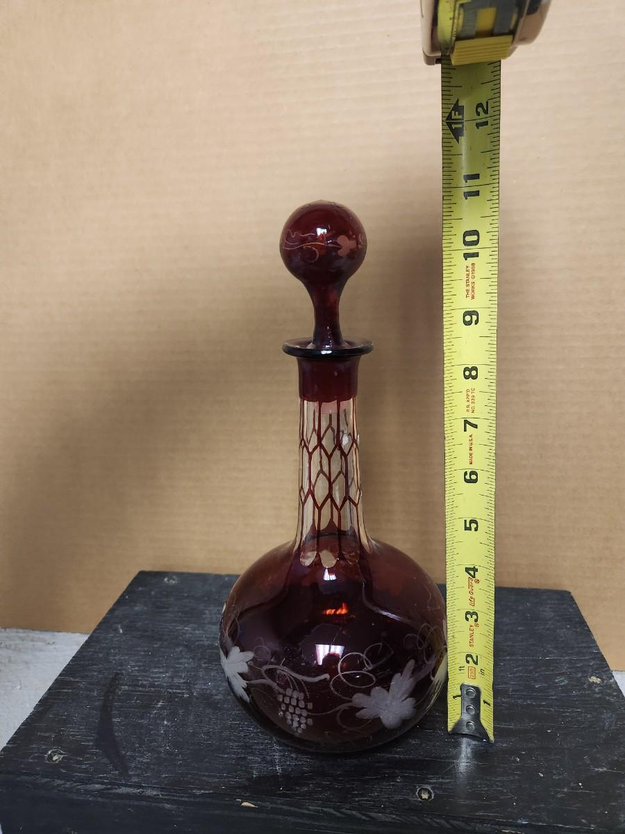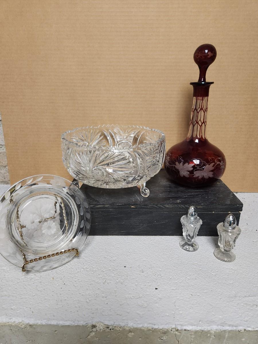 Ruby flashed and etched decanter with original etched stopper, crystal salt and pepper shakers, cut crystal 3 toed bowl and small etched dish.