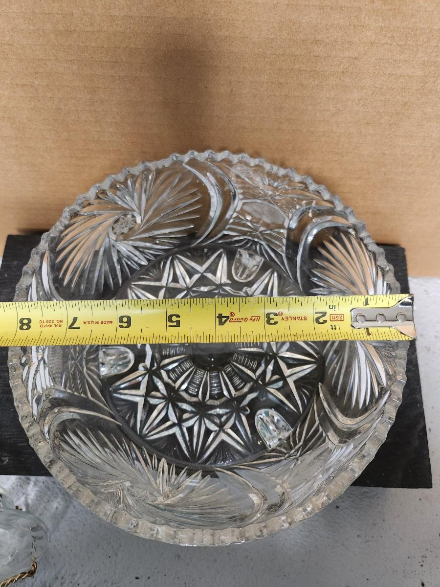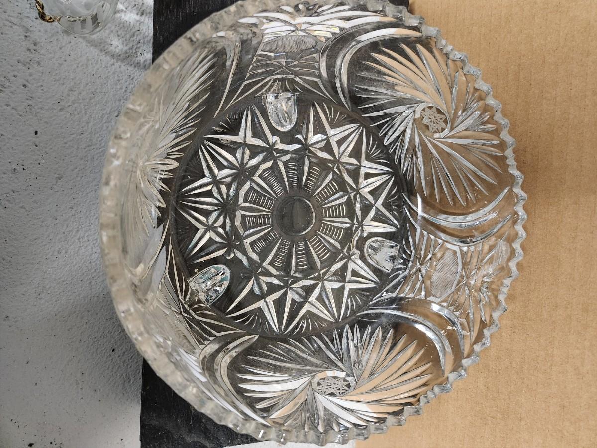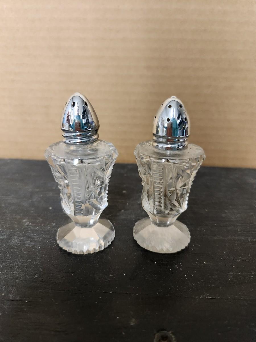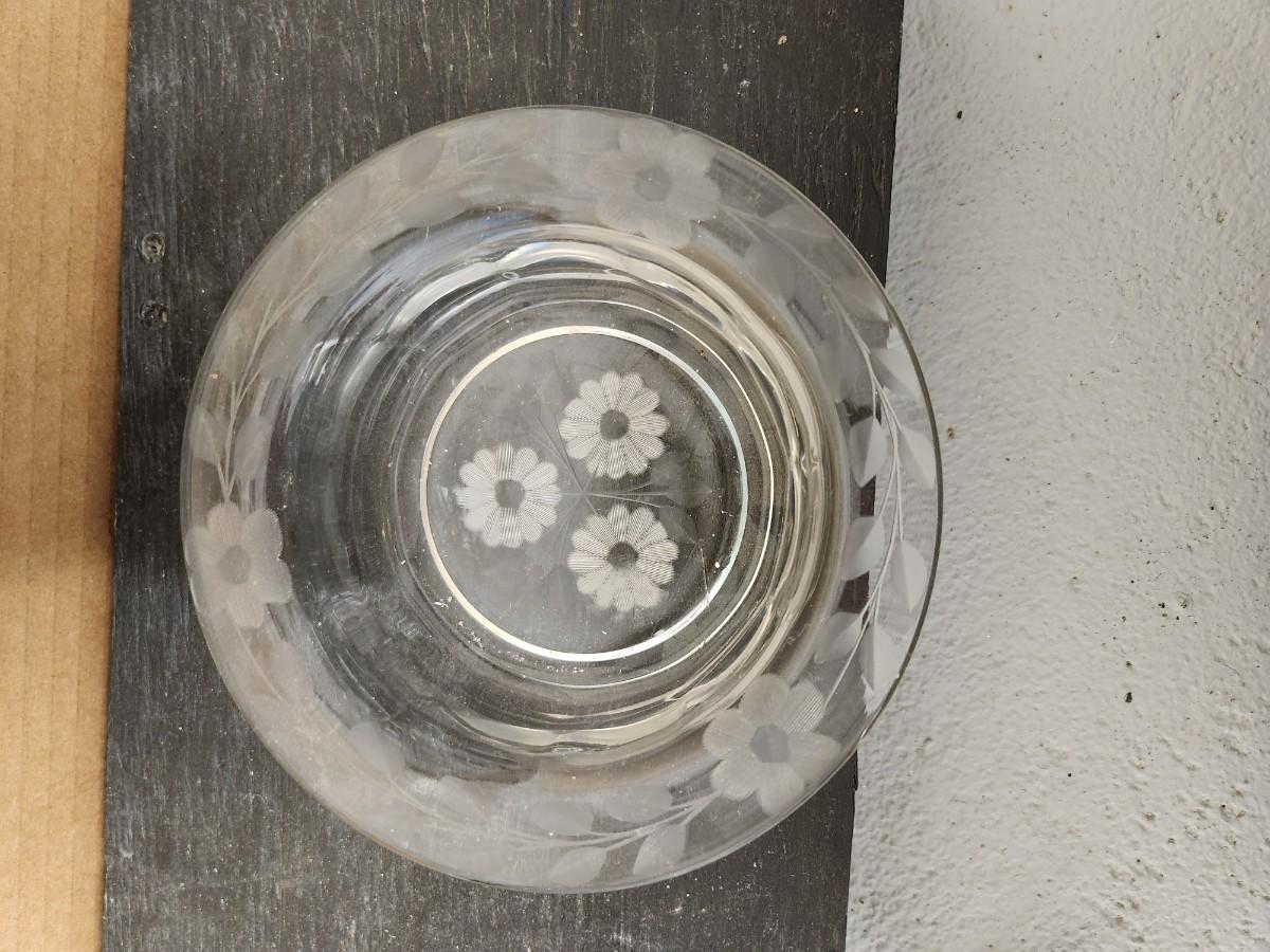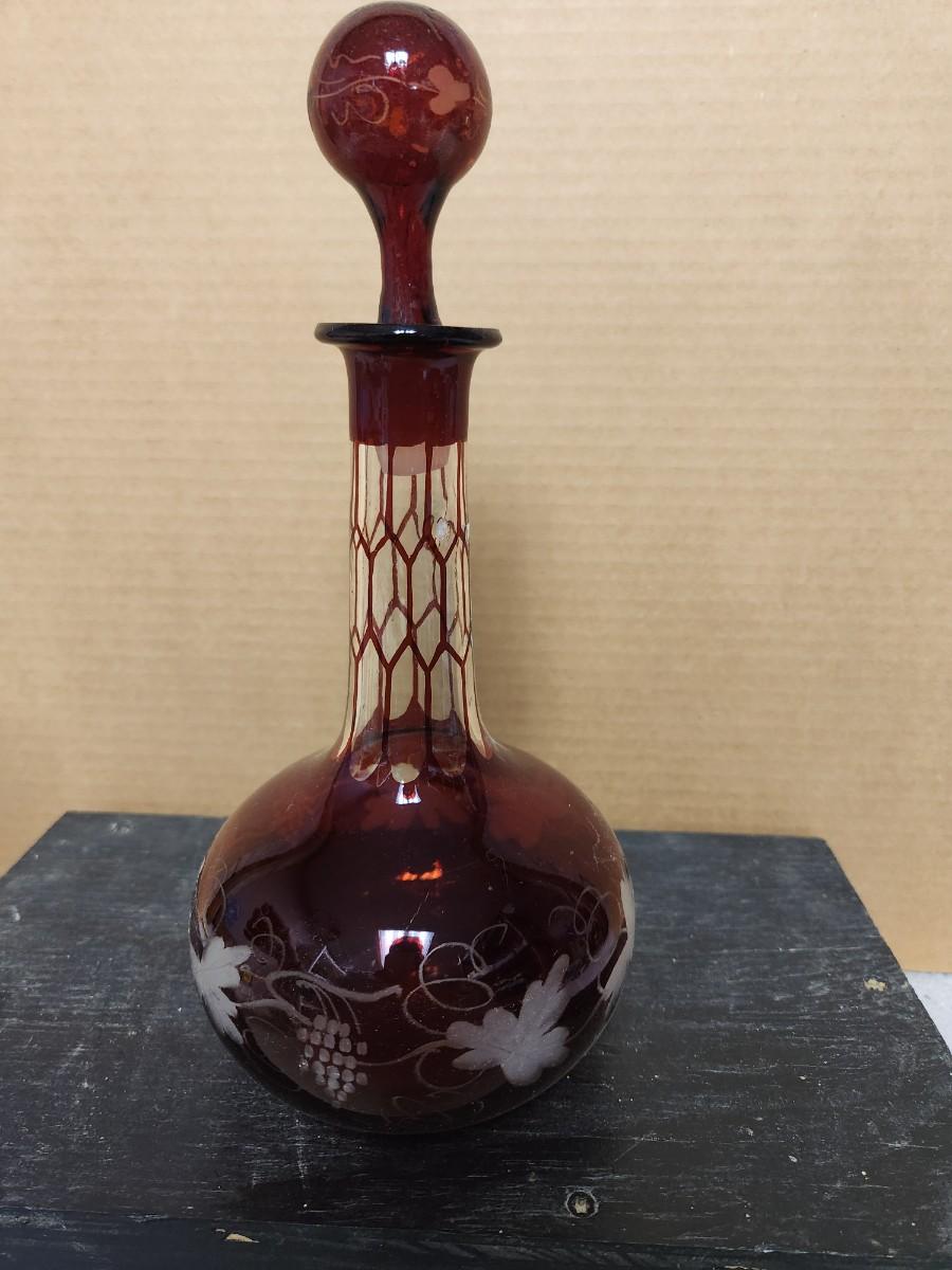 Ruby flashed and etched decanter with original etched stopper, crystal salt and pepper shakers, cut crystal 3 toed bowl and small etched dish.