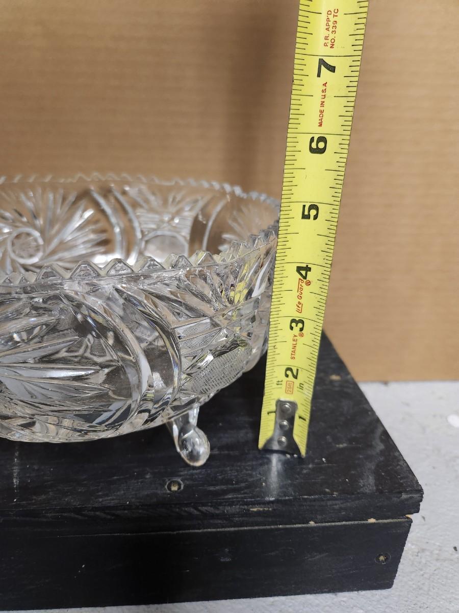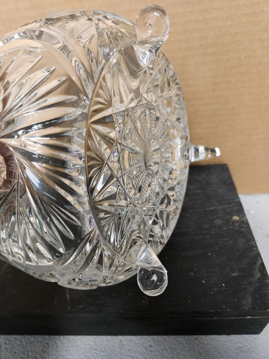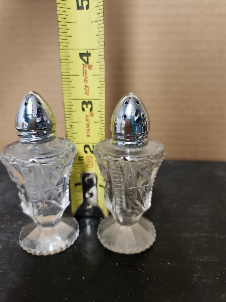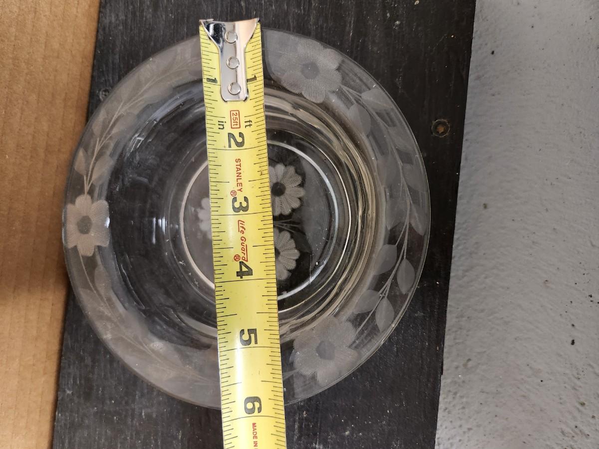 Ruby flashed and etched decanter with original etched stopper, crystal salt and pepper shakers, cut crystal 3 toed bowl and small etched dish.