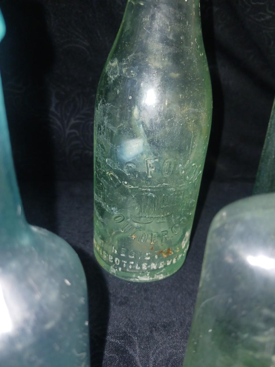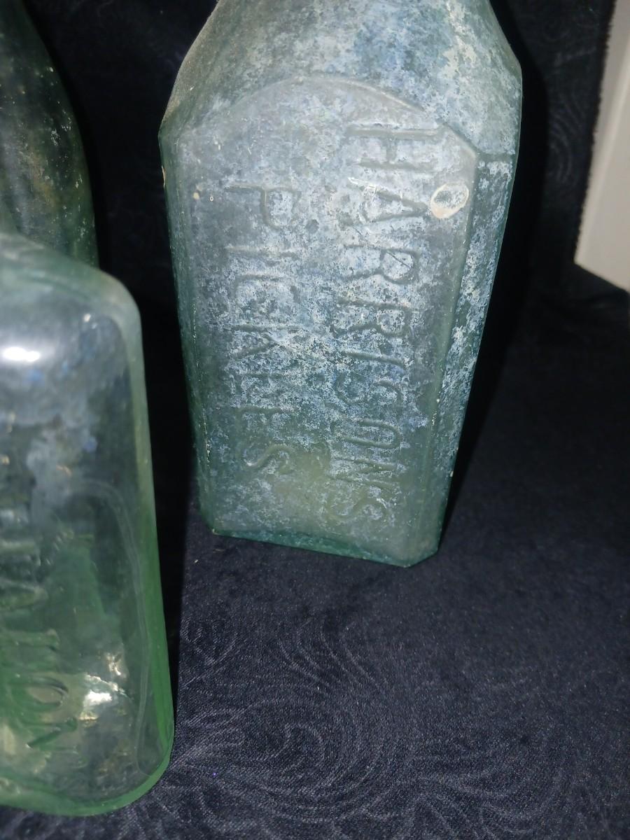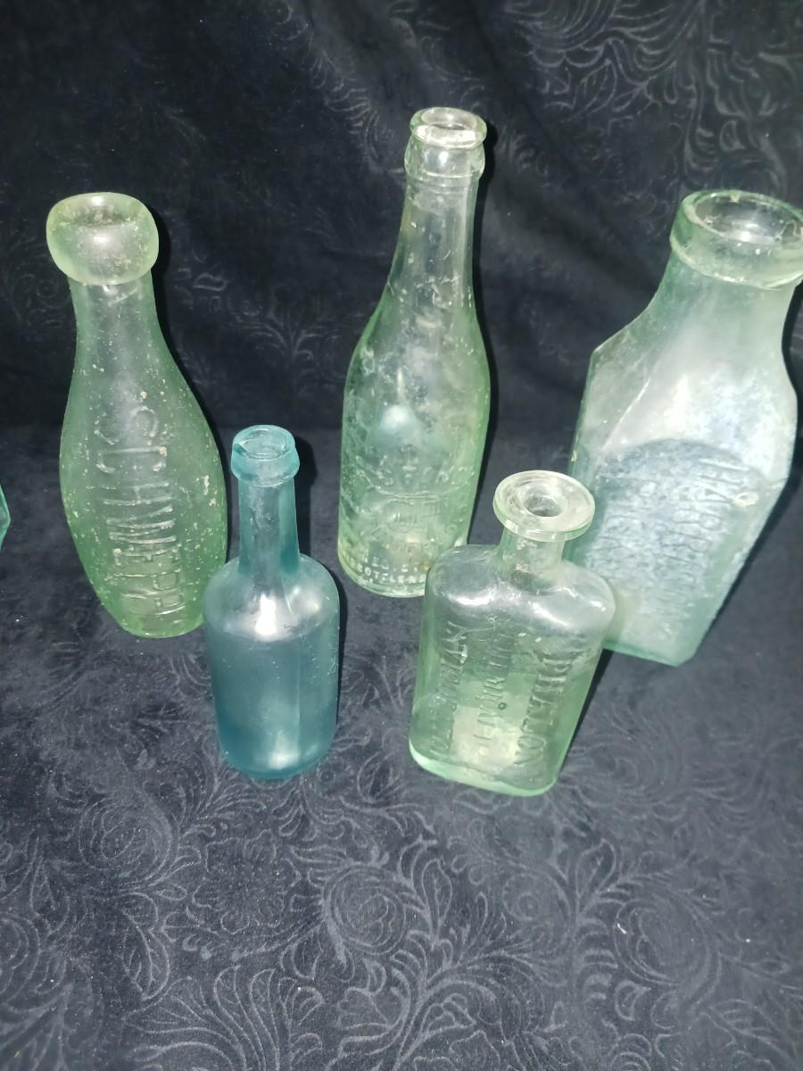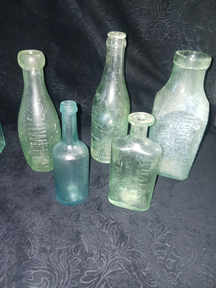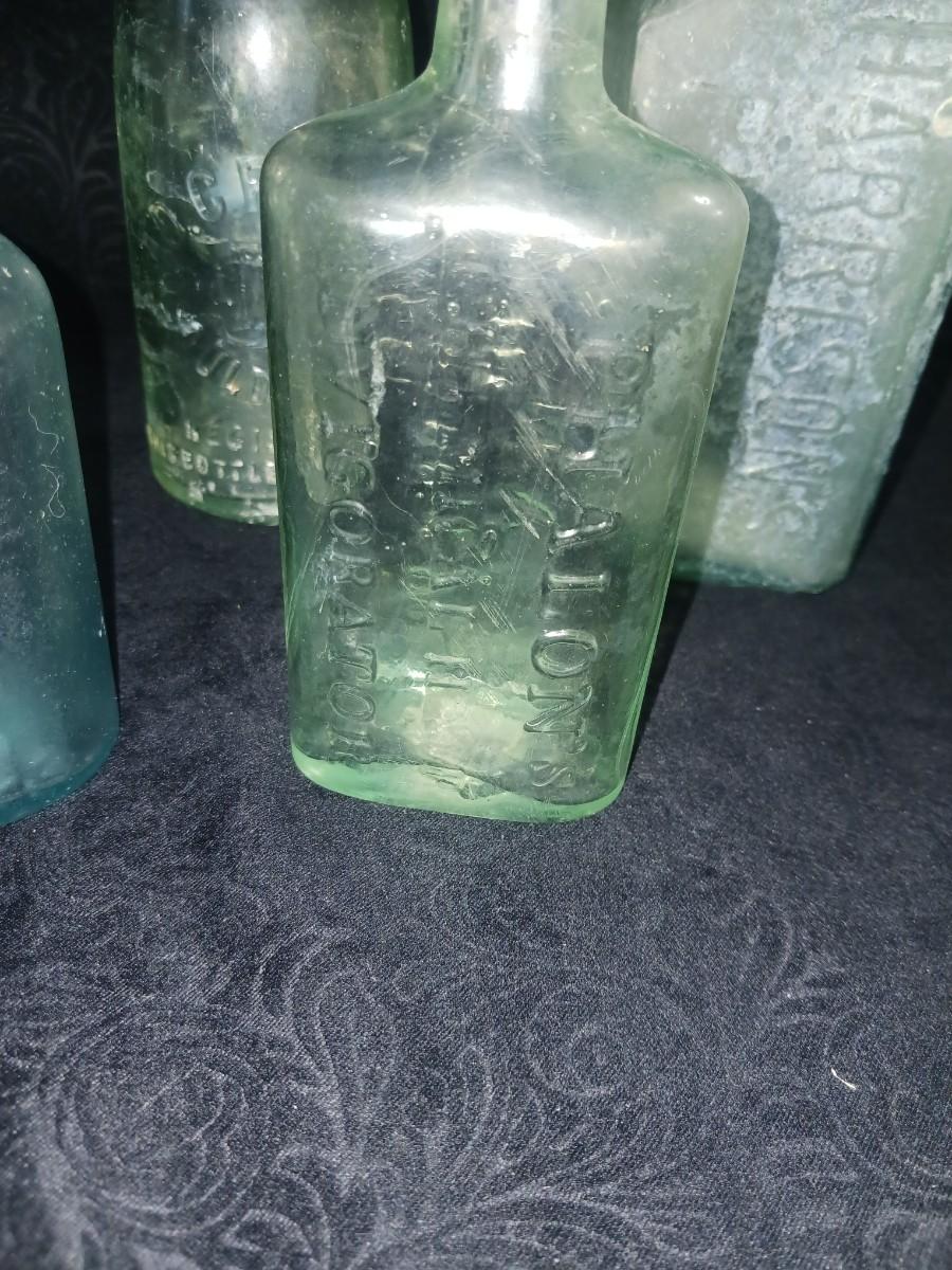 ANTIQUE GLASS BOTTLES WITH RAISED LETTERING