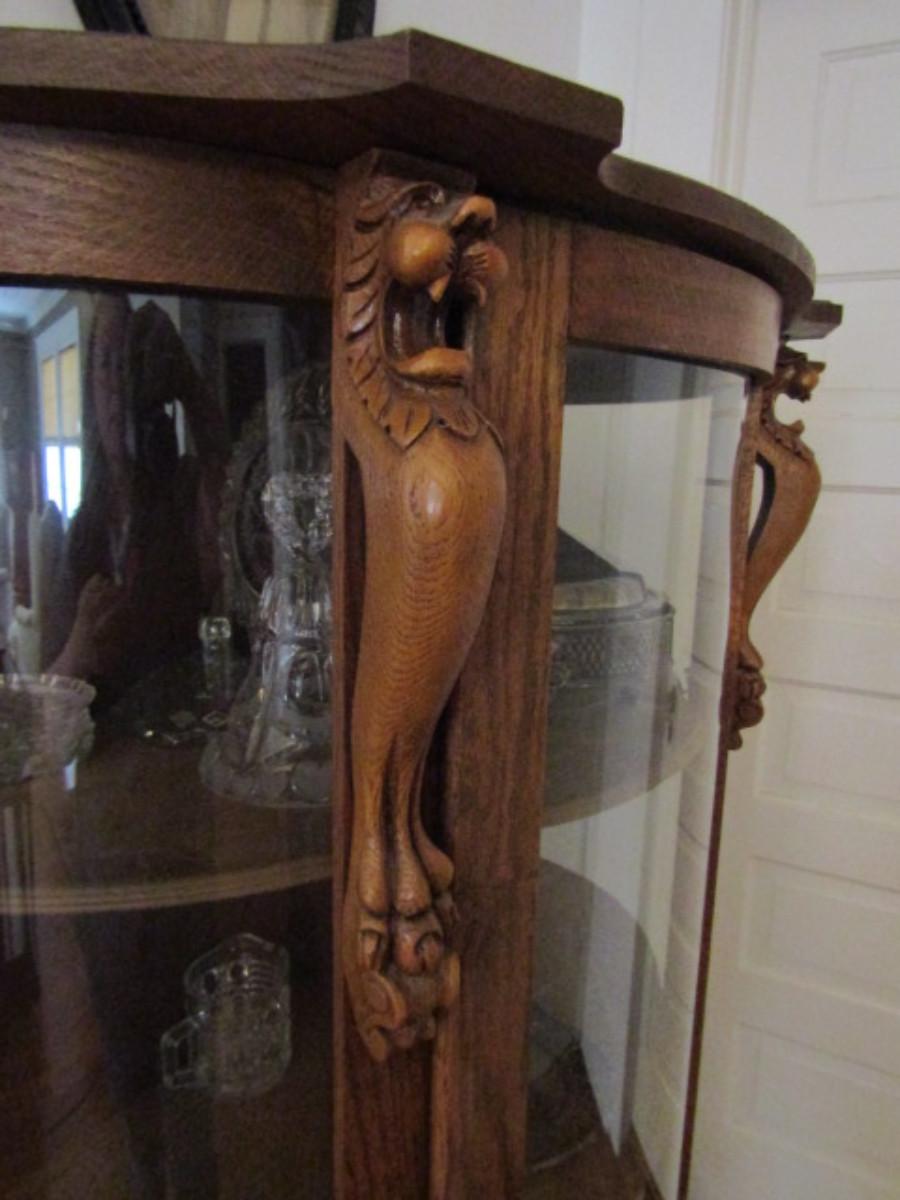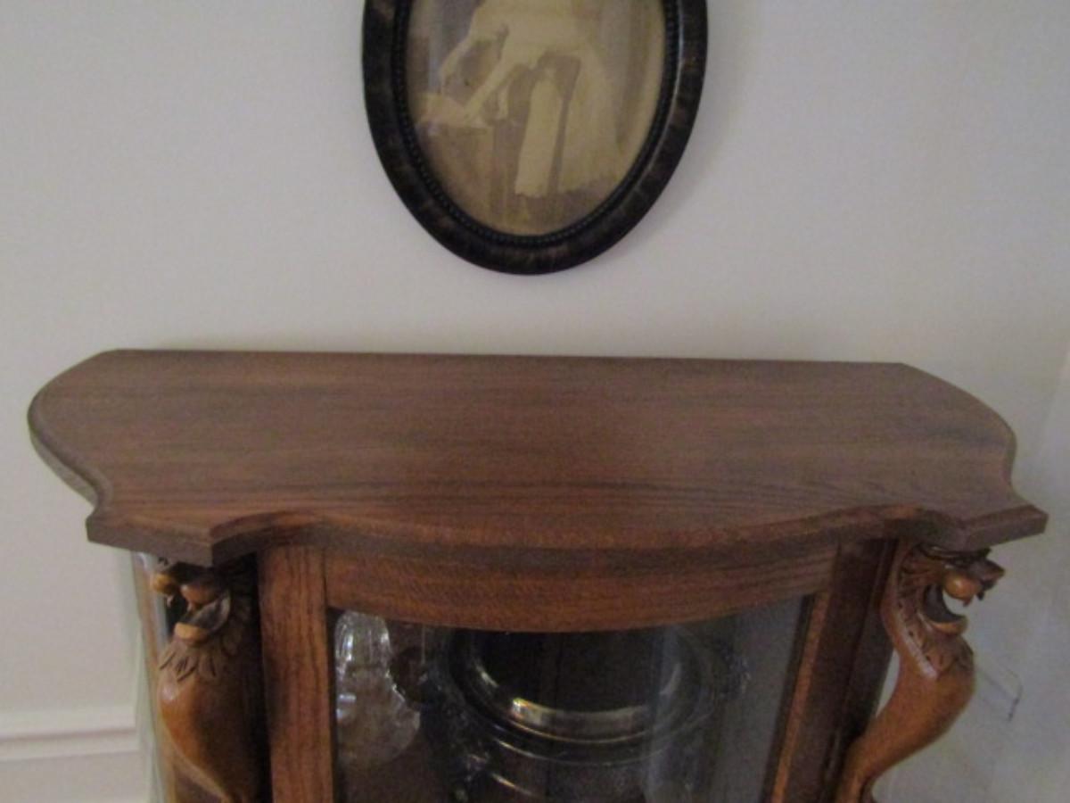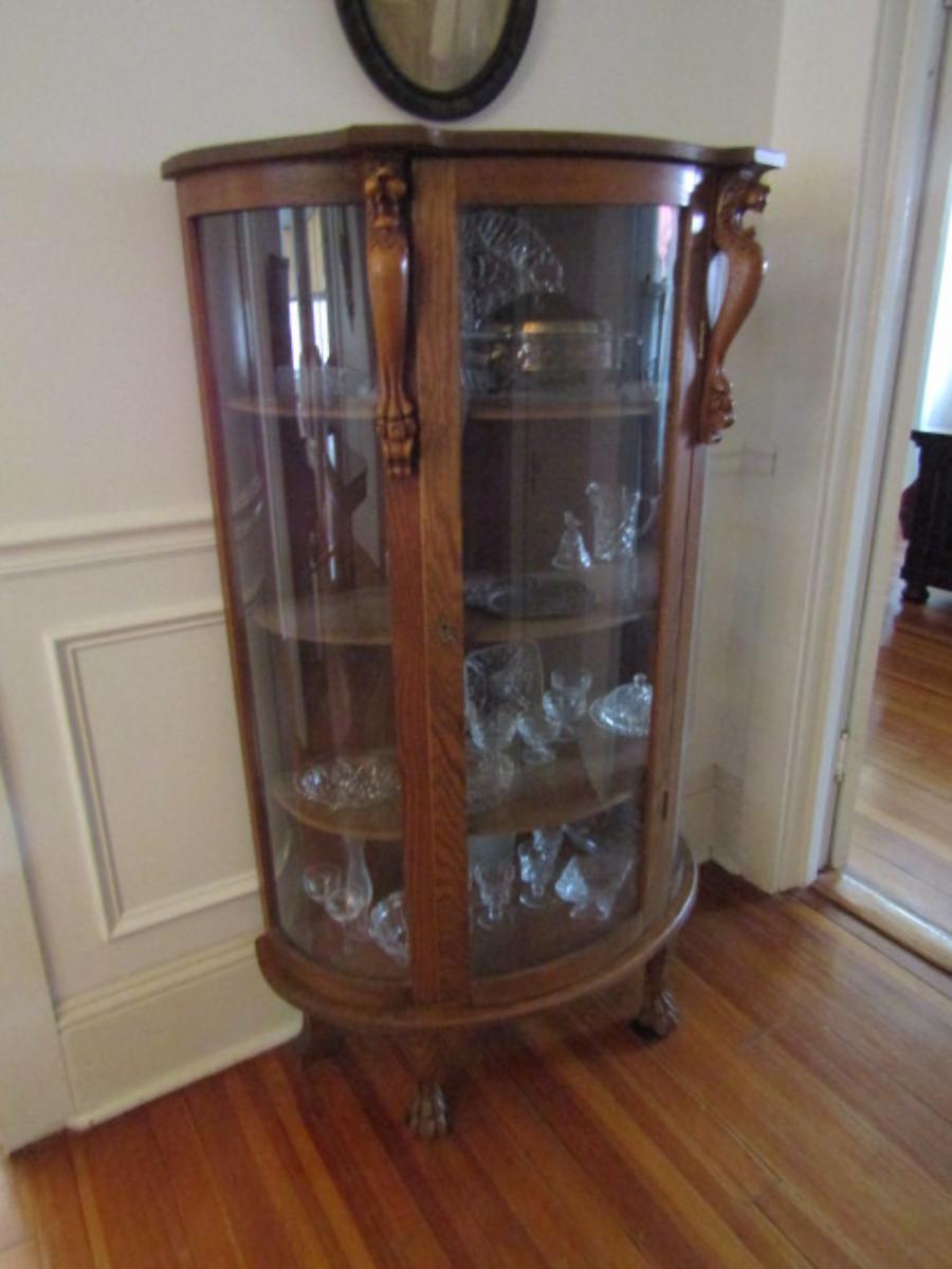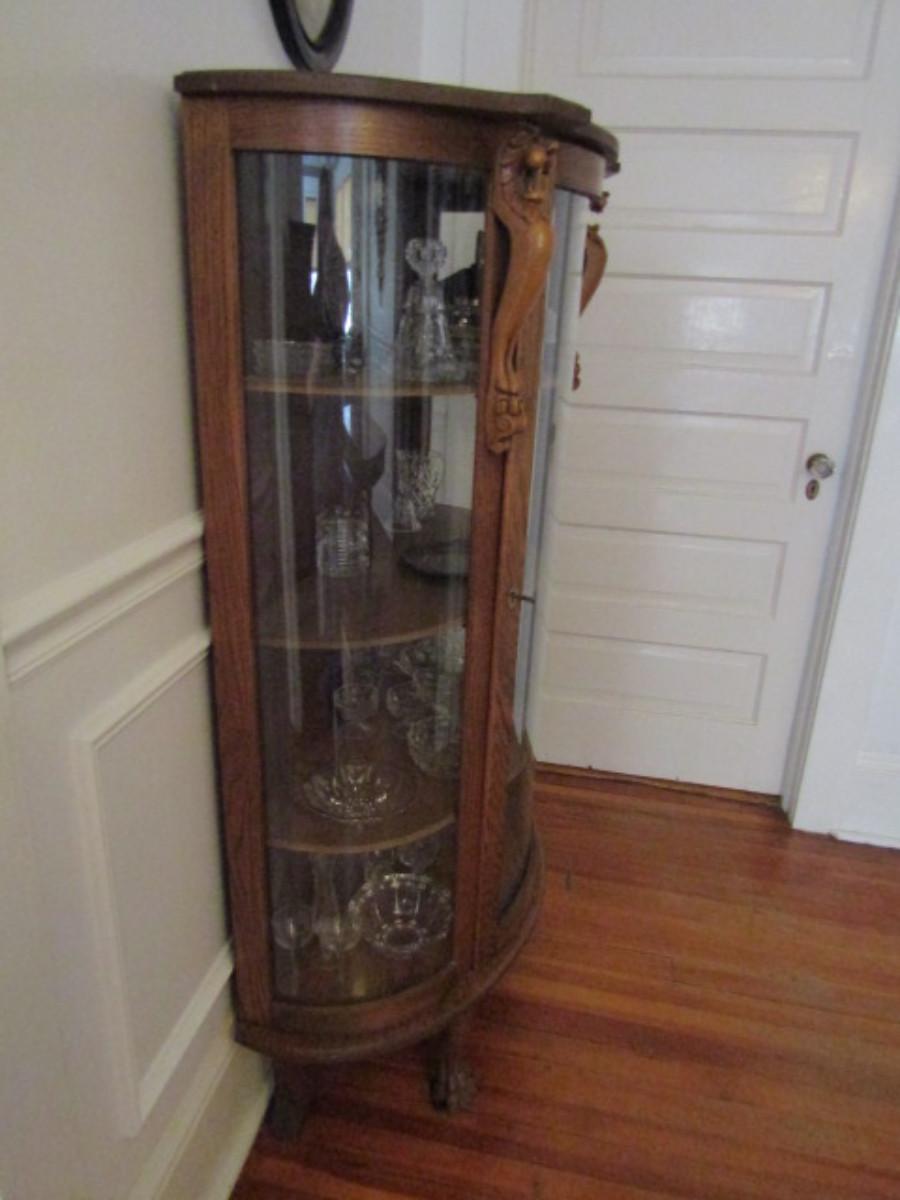 Antique Glass Bow Front Curio Cabinet with Paw Feet and Lion Accents (No Contents)