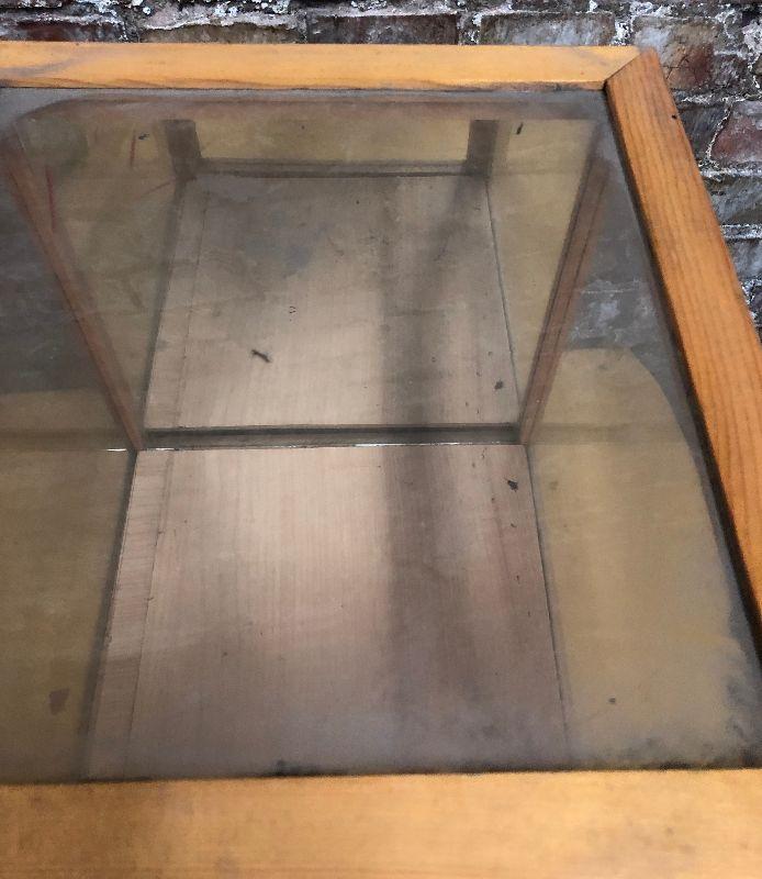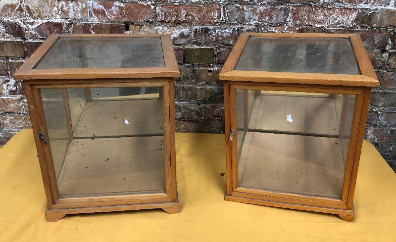 Here are two old glass and wood display cabinets..These cubes are 13 x 13 x 13"...Mirrored backs...One needs a small leg....minor repair...