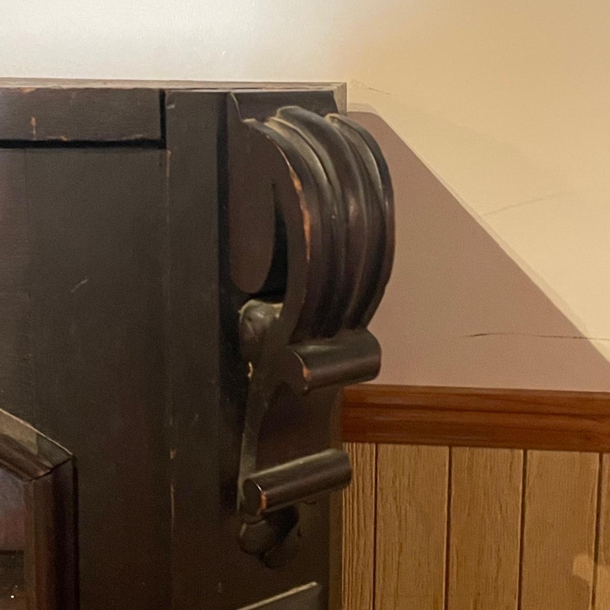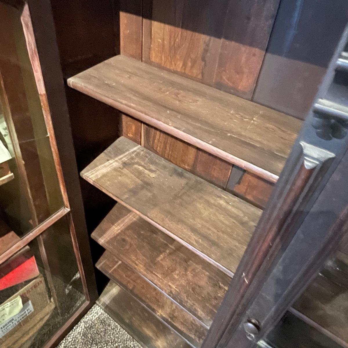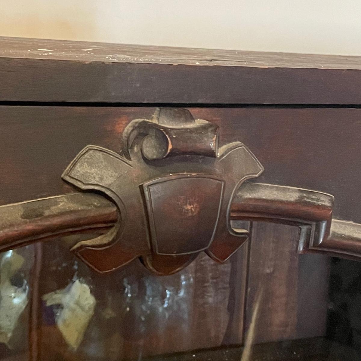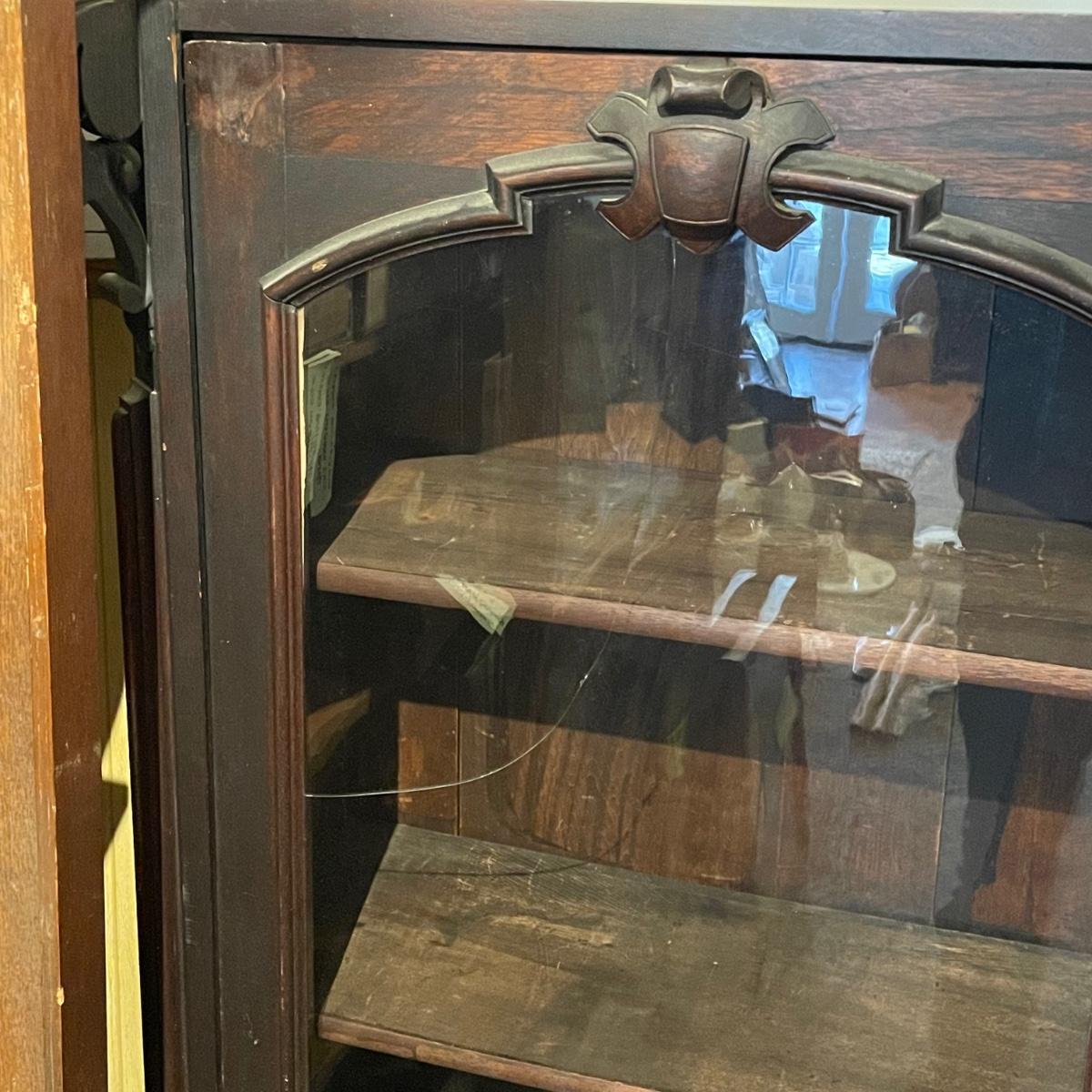 This antique cabinet has four shelves on either side that rest in notches and can be adjusted. The doors have beautifully crafted carvings and it even comes with the original key. This dark wood cabinet does have a crack in the glass door and a small cut in the wood of the door, see later images.