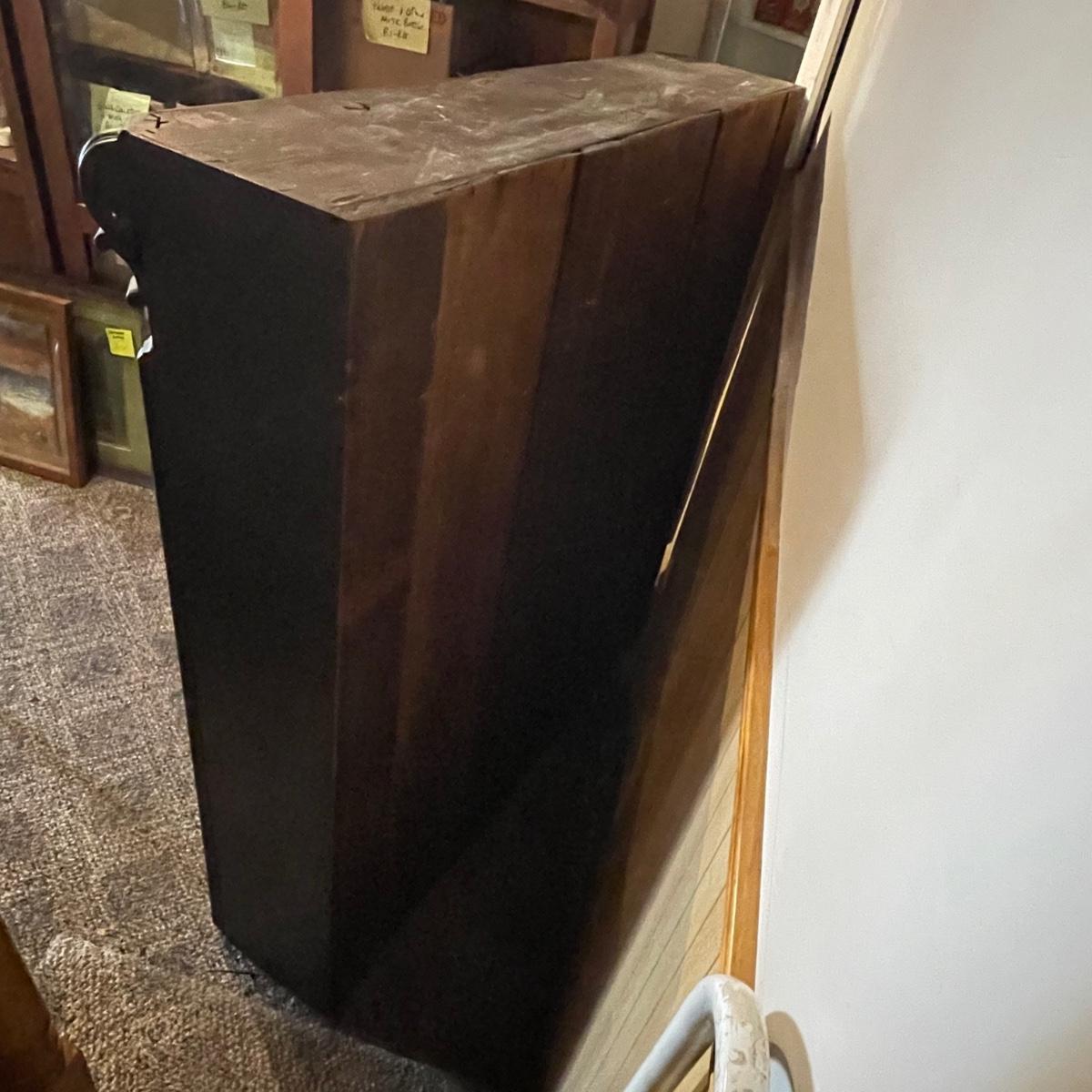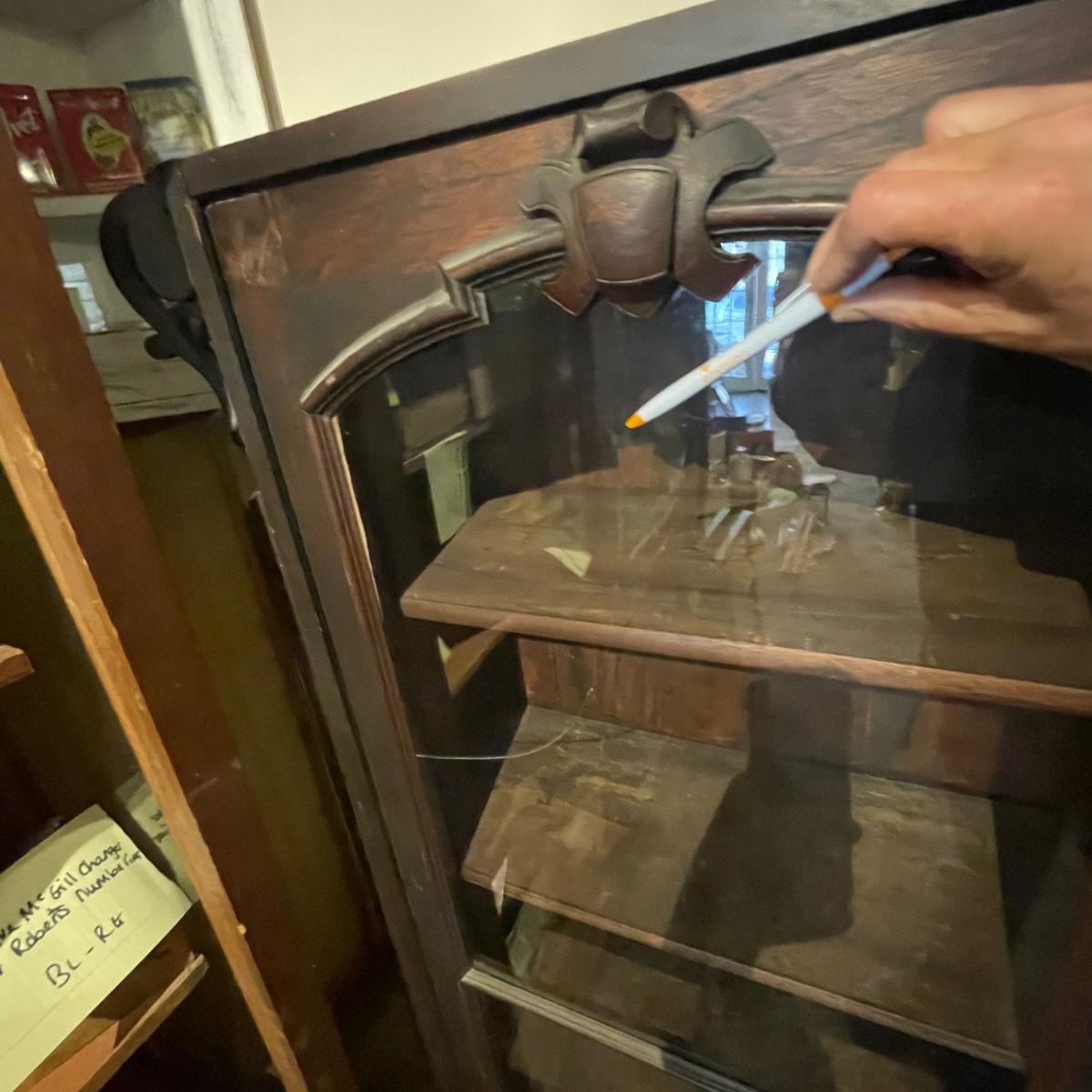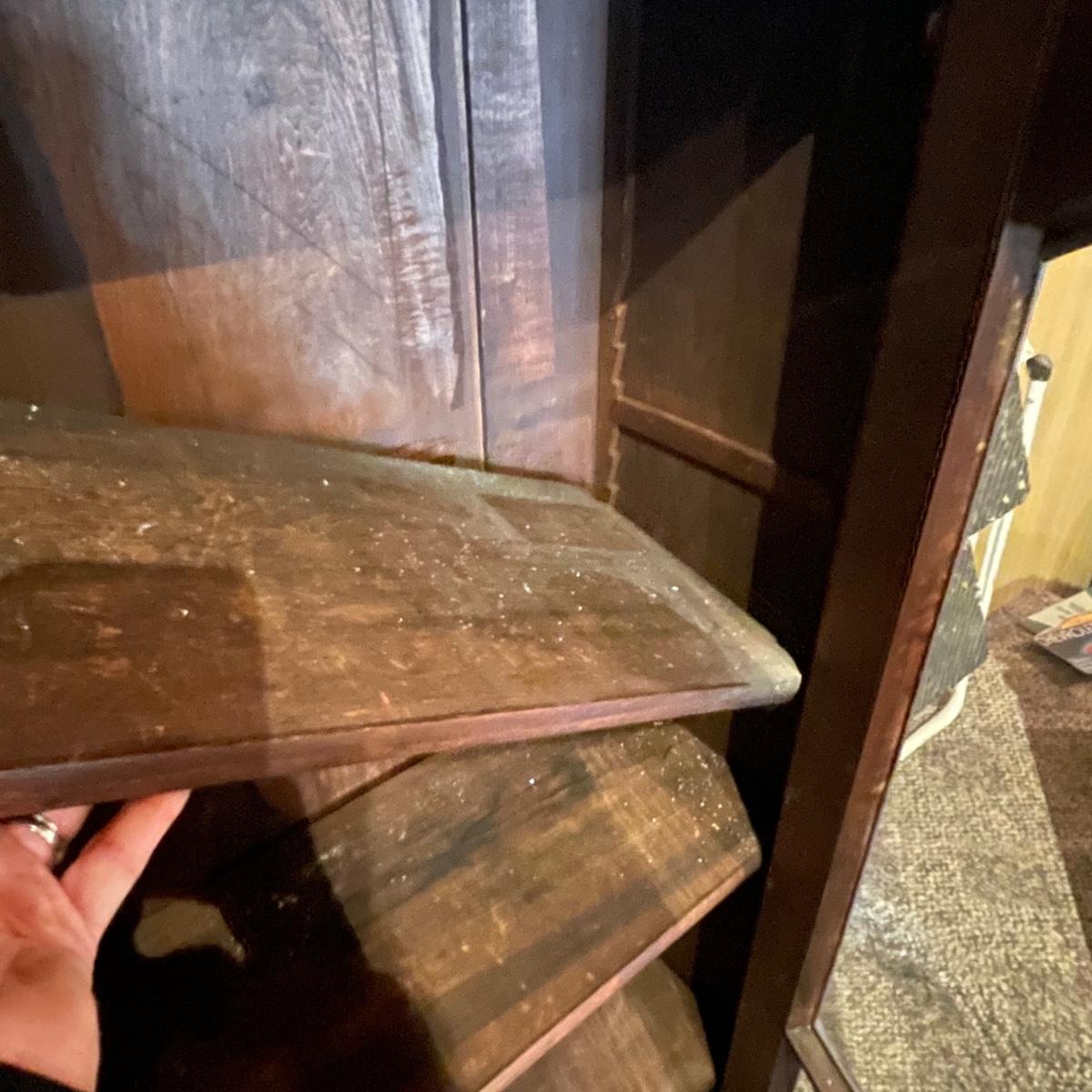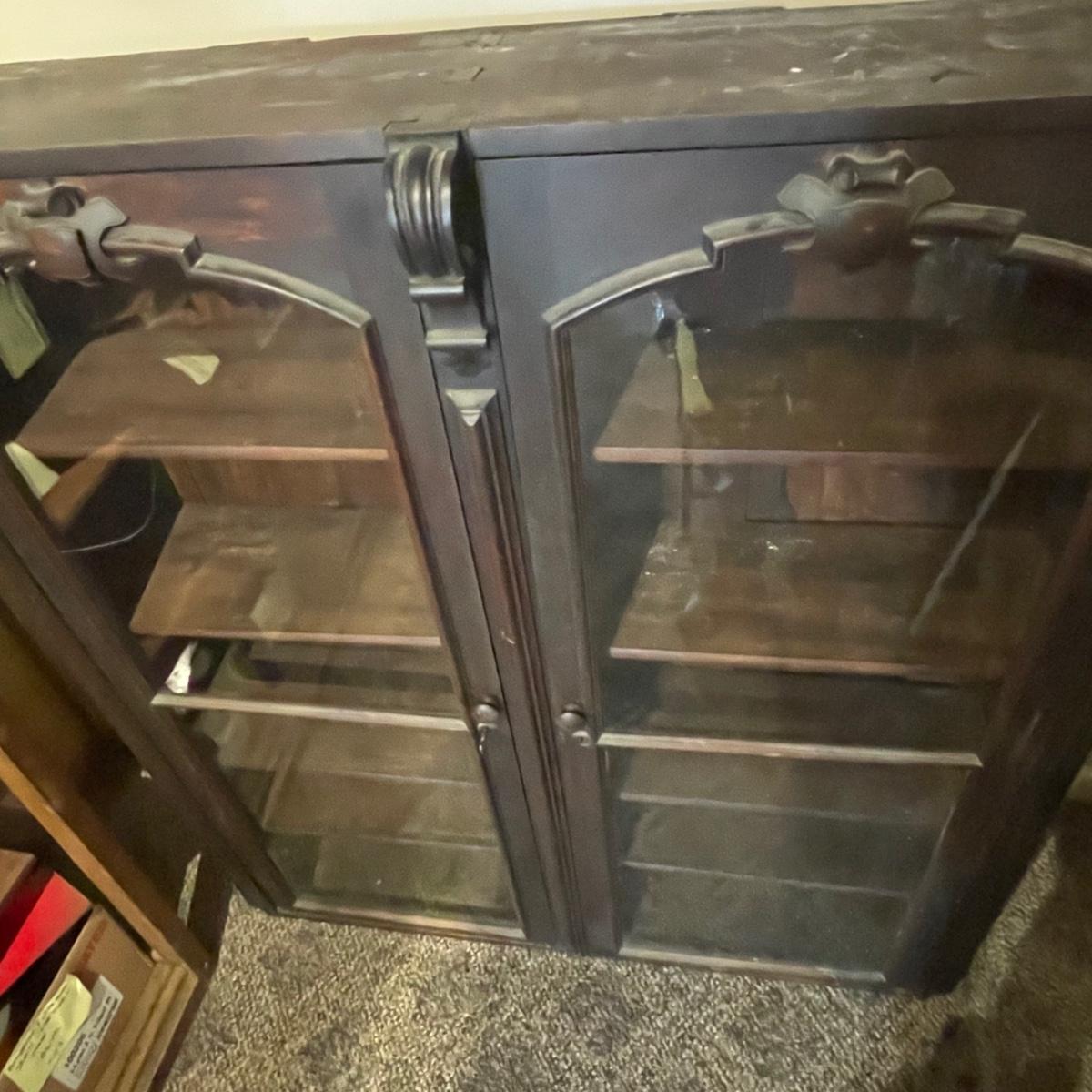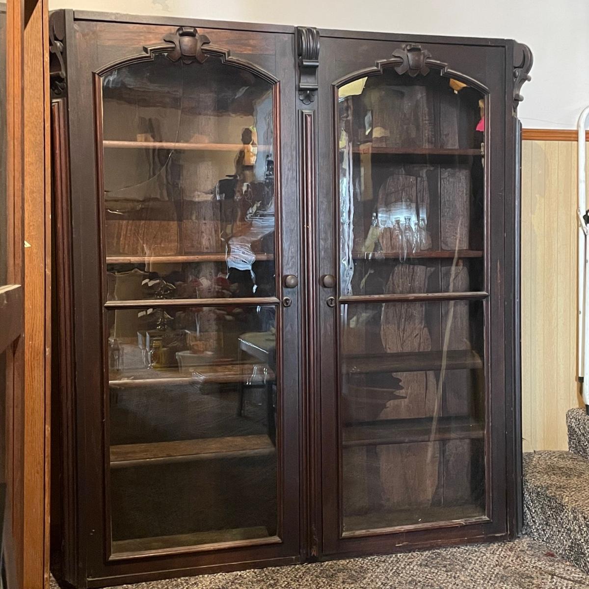 This antique cabinet has four shelves on either side that rest in notches and can be adjusted. The doors have beautifully crafted carvings and it even comes with the original key. This dark wood cabinet does have a crack in the glass door and a small cut in the wood of the door, see later images.