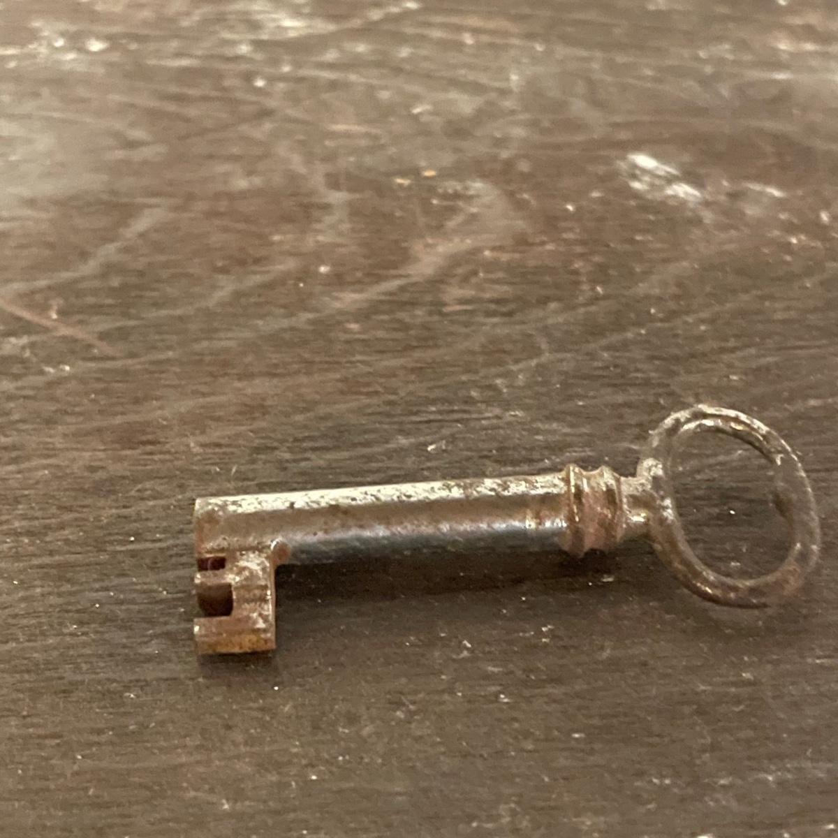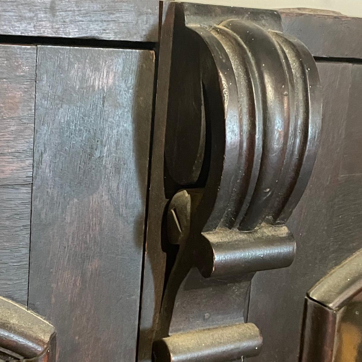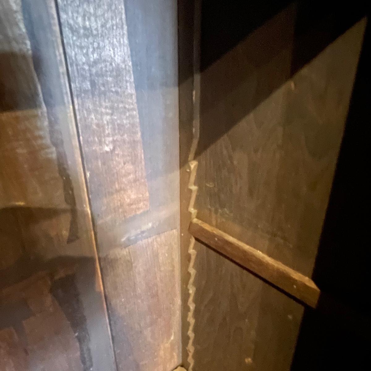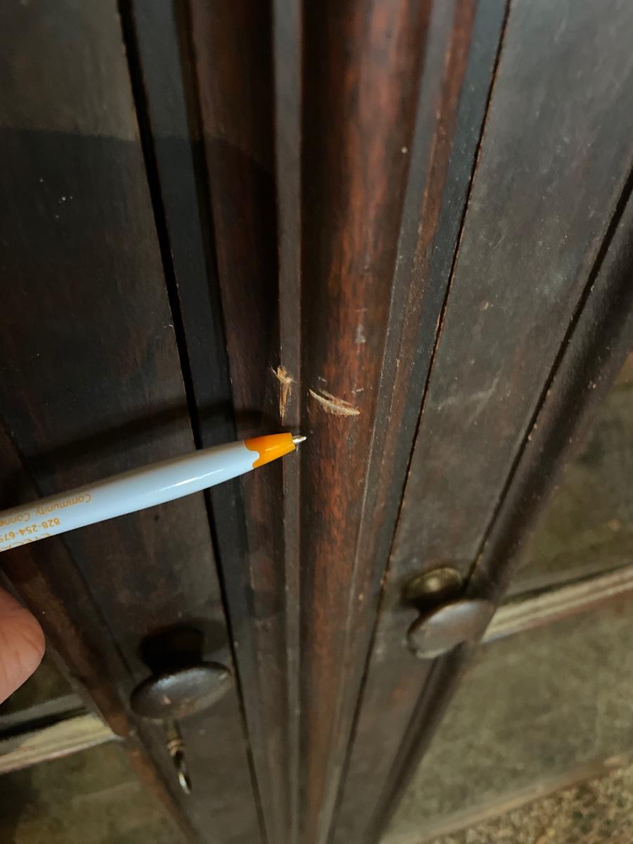 This antique cabinet has four shelves on either side that rest in notches and can be adjusted. The doors have beautifully crafted carvings and it even comes with the original key. This dark wood cabinet does have a crack in the glass door and a small cut in the wood of the door, see later images.