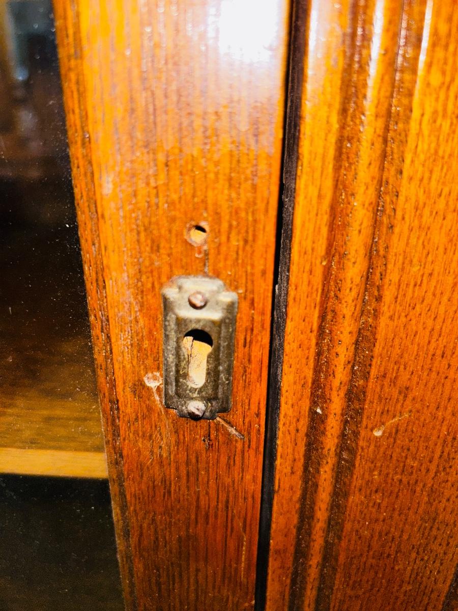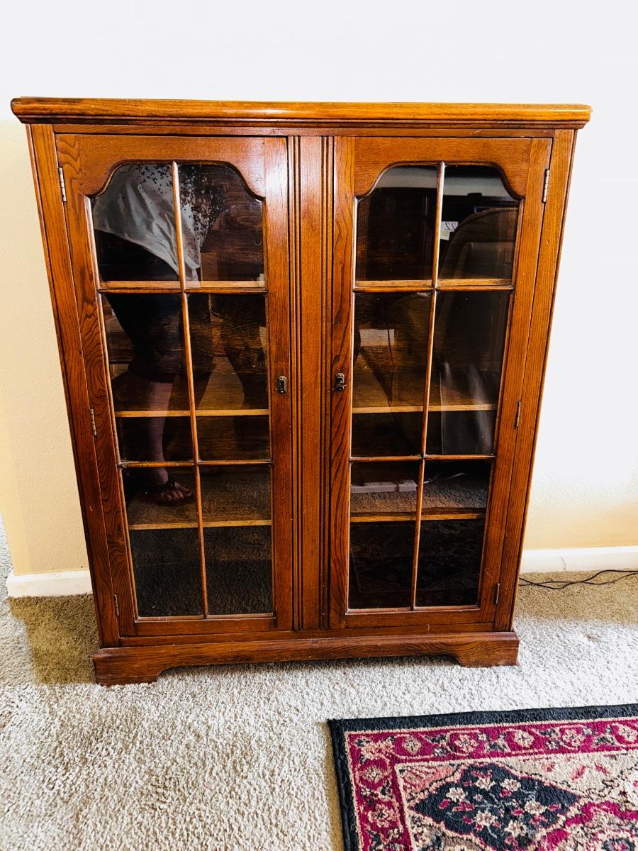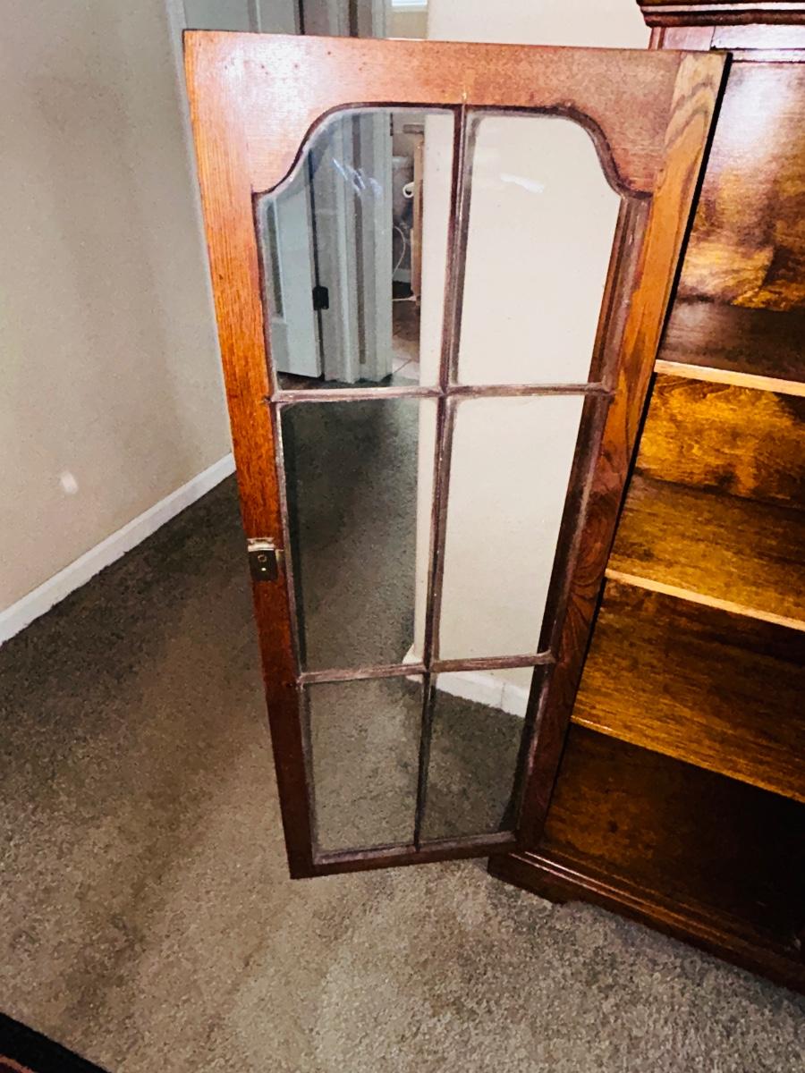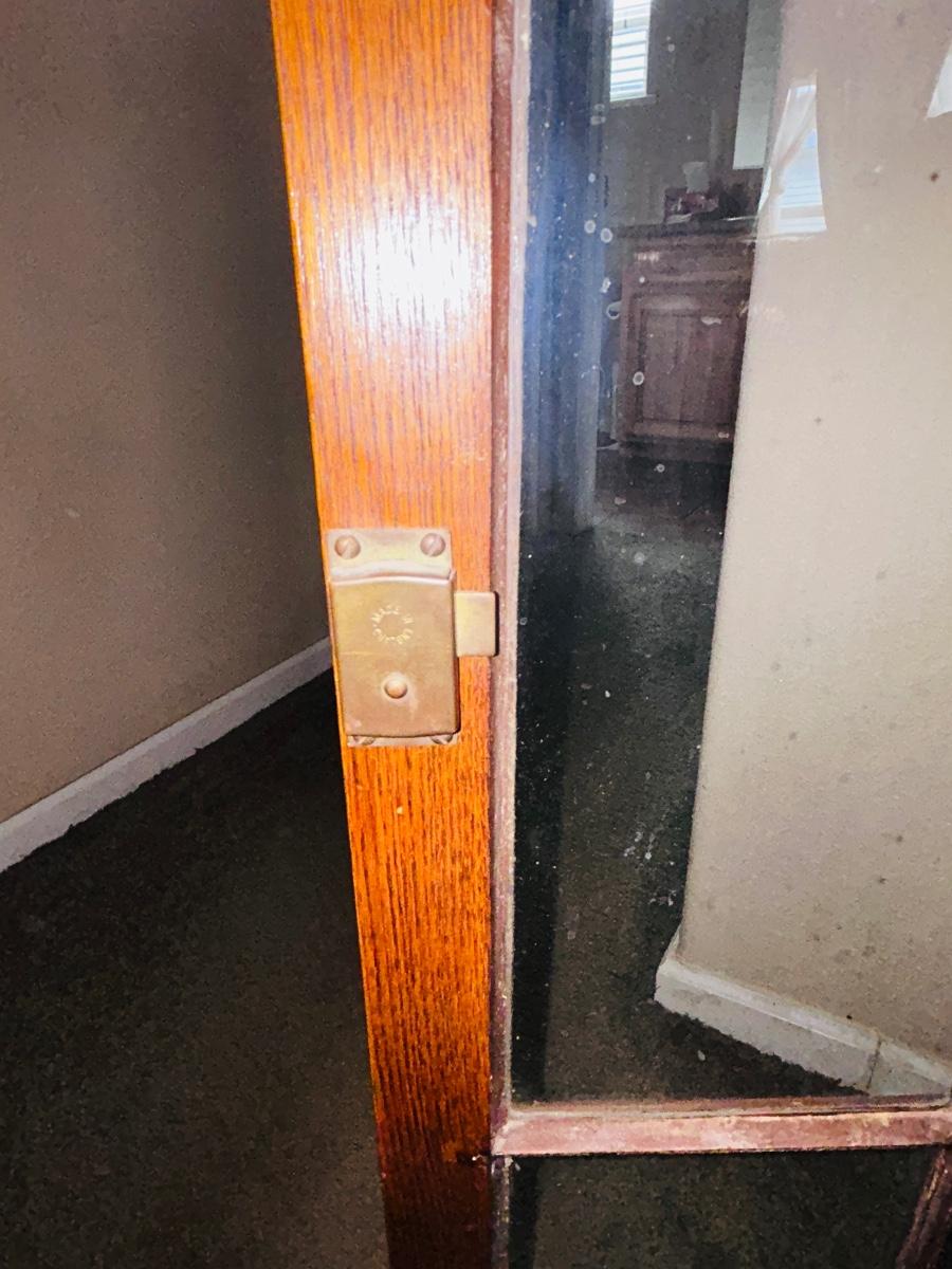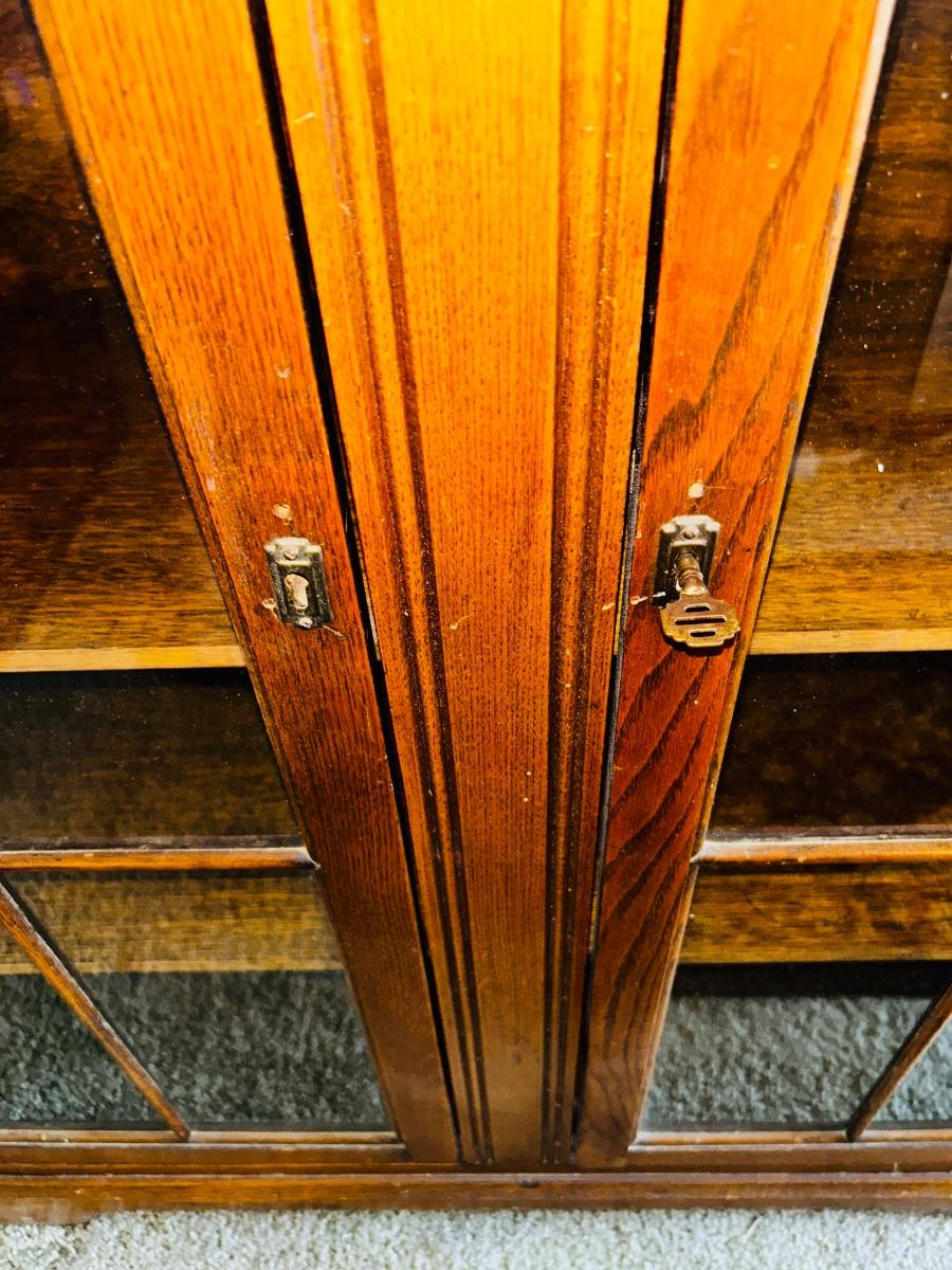 ANTIQUE GLASS DOUBLE DOOR SKELETON KEY LOCKING CABINET
