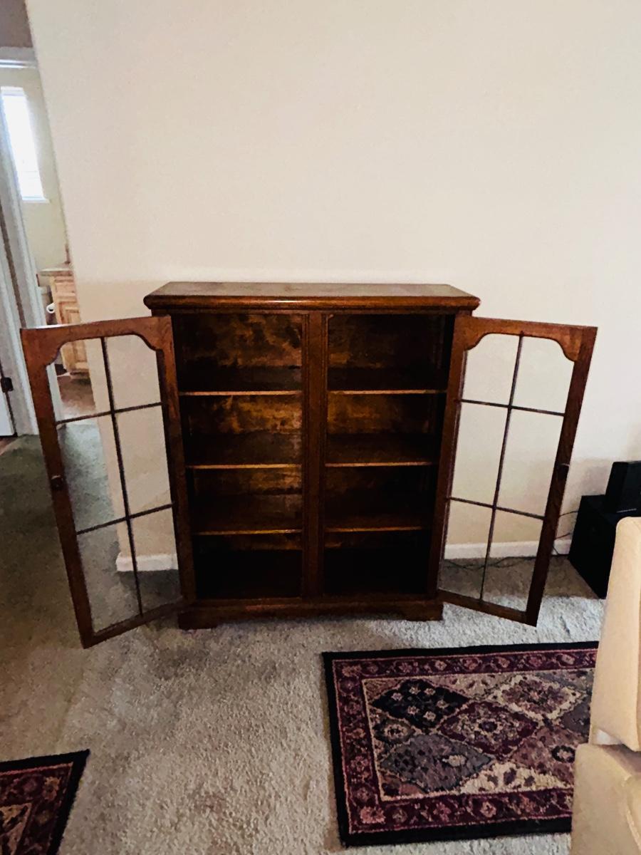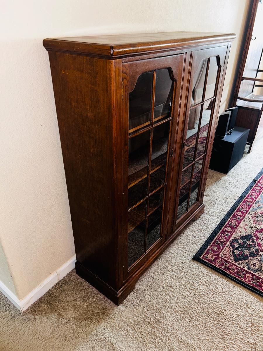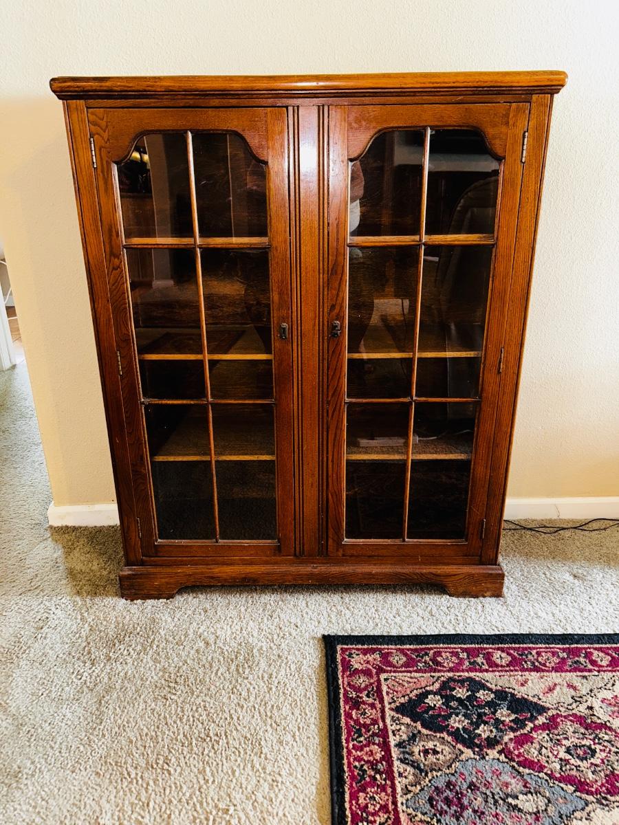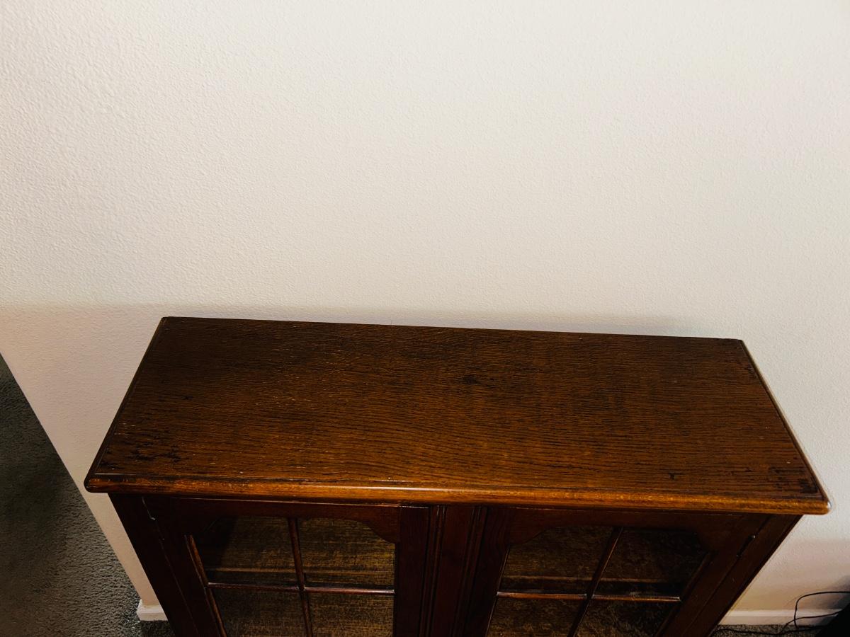 ANTIQUE GLASS DOUBLE DOOR SKELETON KEY LOCKING CABINET