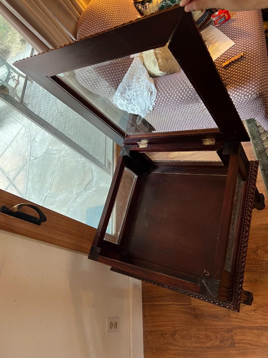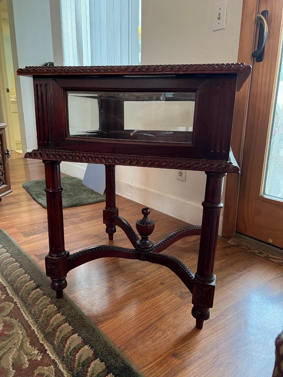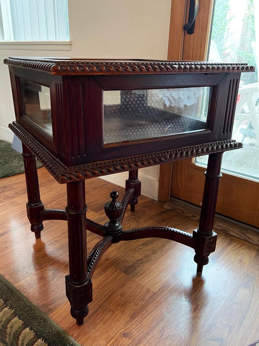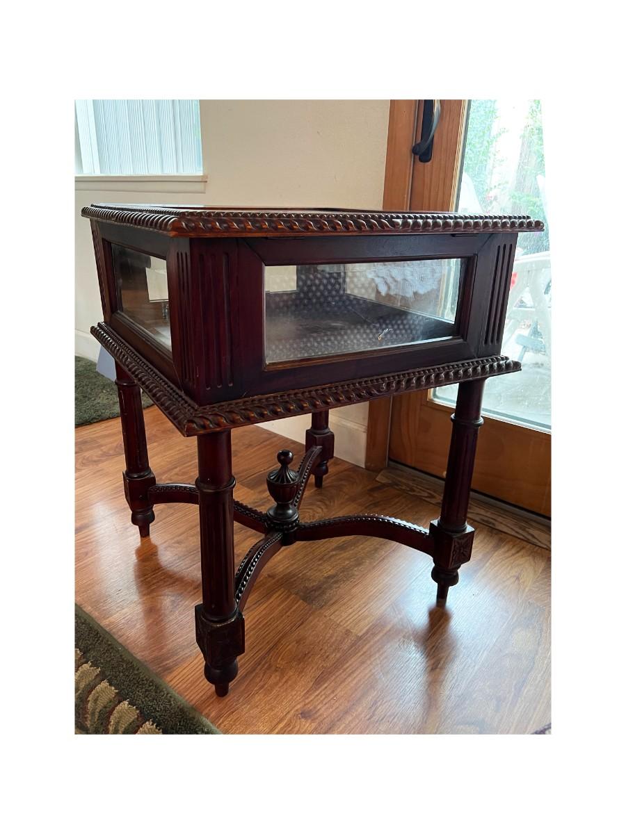 Antique curio display side table. Glass sides and hinged lid glass tabletop. In good condition. Light wear from age. Stands about 29" tall. Curio depth is about 6". About 24" square. ITEM LOCATED IN ORANGE; pickup will be coordinated within two weeks of auction close, no date for pickup set.
