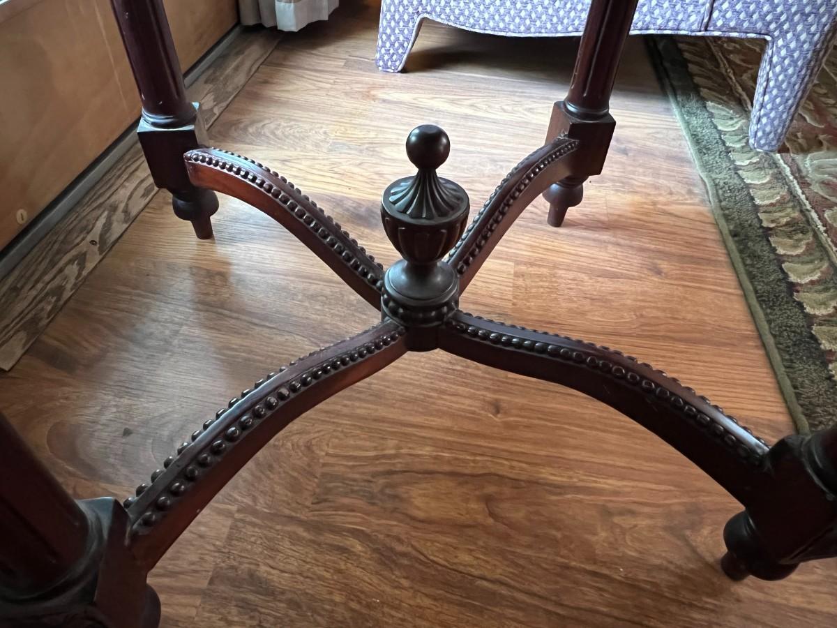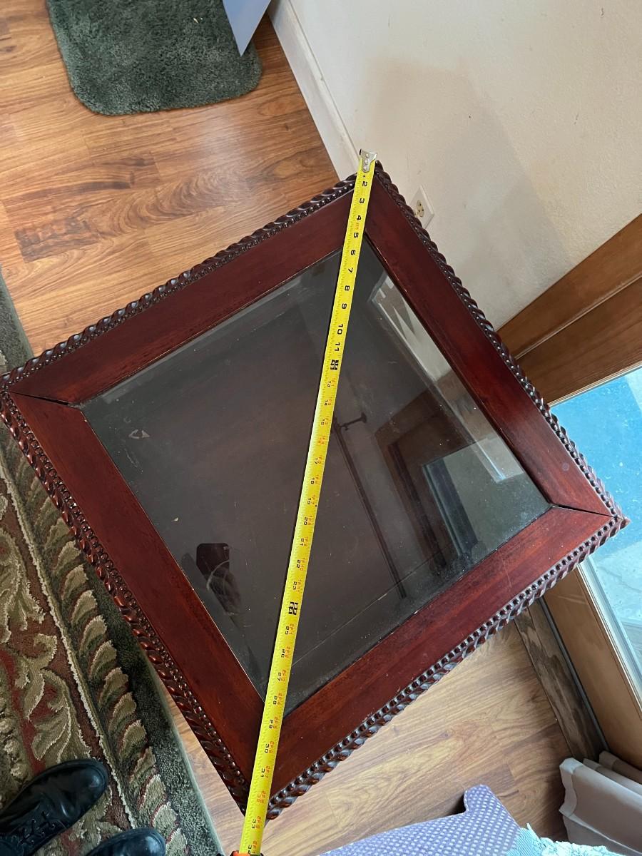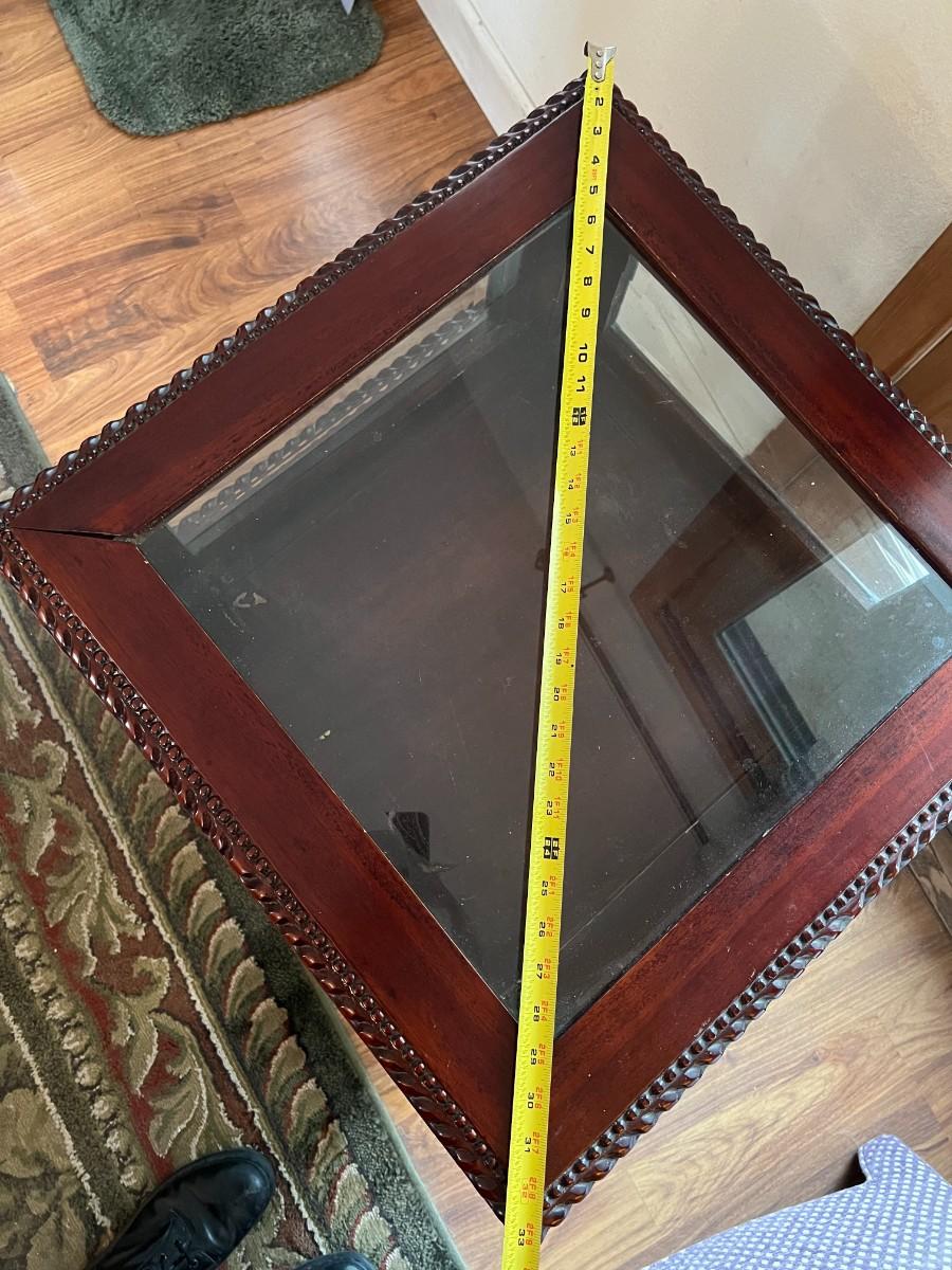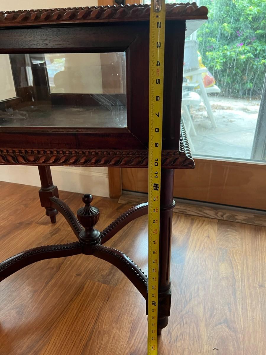 Antique curio display side table. Glass sides and hinged lid glass tabletop. In good condition. Light wear from age. Stands about 29" tall. Curio depth is about 6". About 24" square. ITEM LOCATED IN ORANGE; pickup will be coordinated within two weeks of auction close, no date for pickup set.