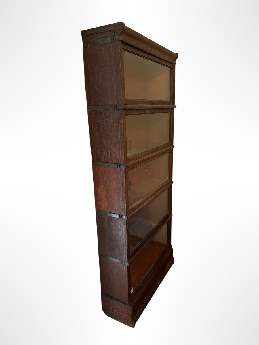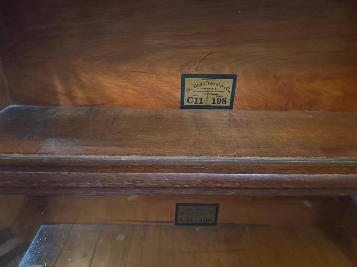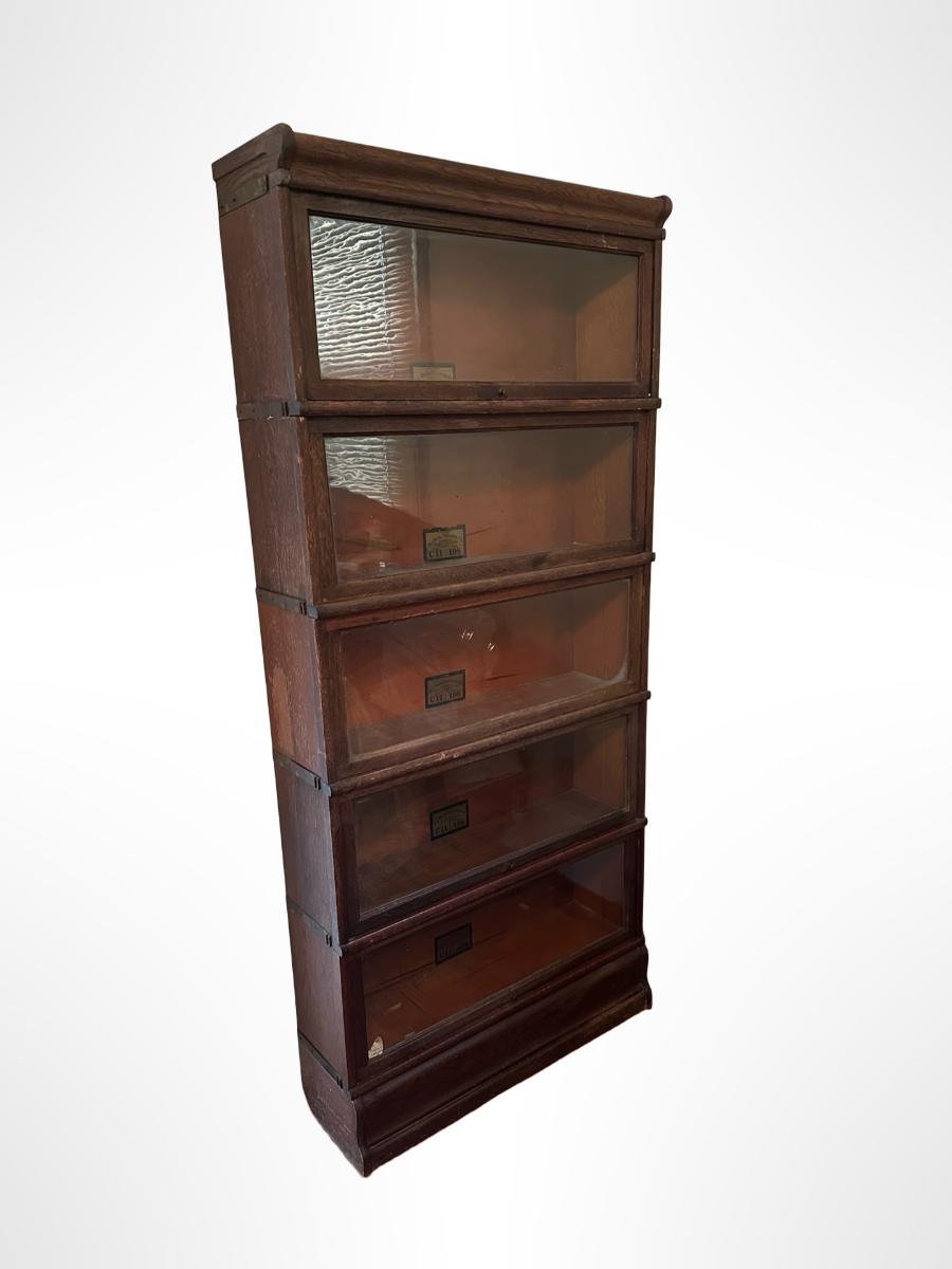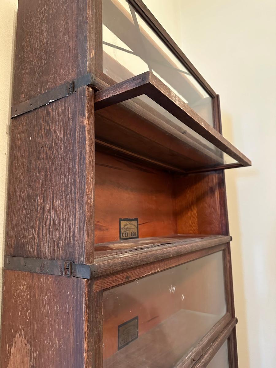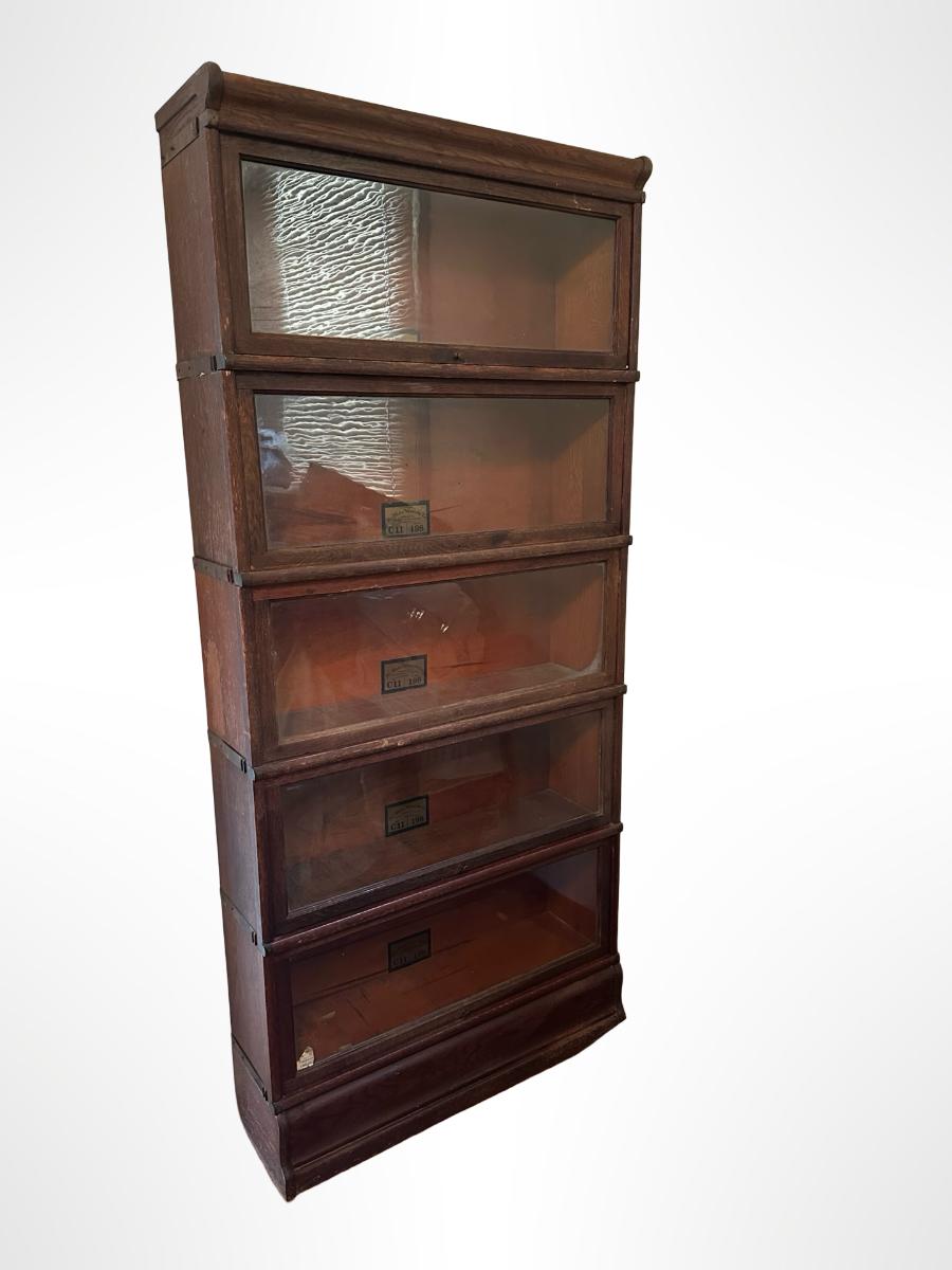 Globe-Wernicke barrister bookcase featuring five stacking sections with original glass-front doors that lift and slide back, on gets stuck and does not fully slide back. Globe-Wernicke labels inside each unit (Size C11, Grade 198).