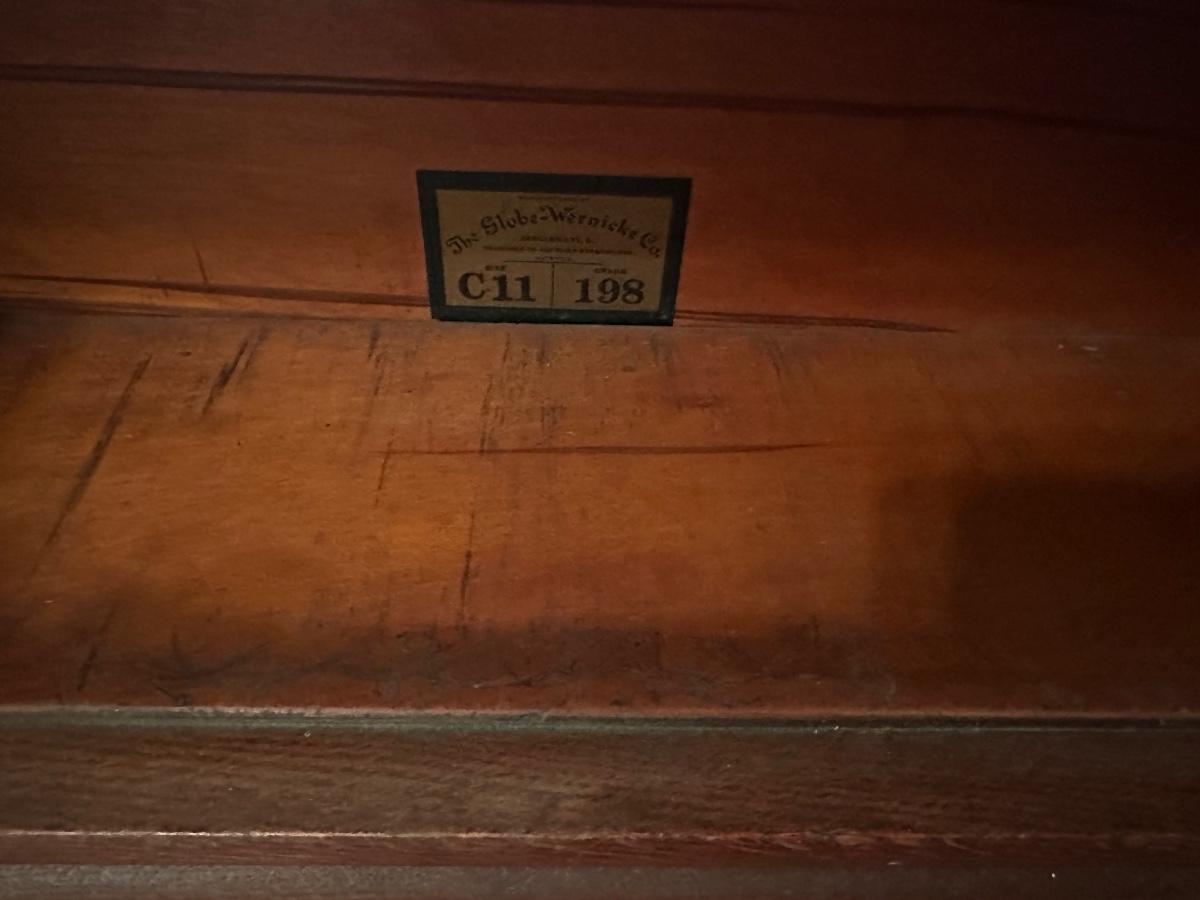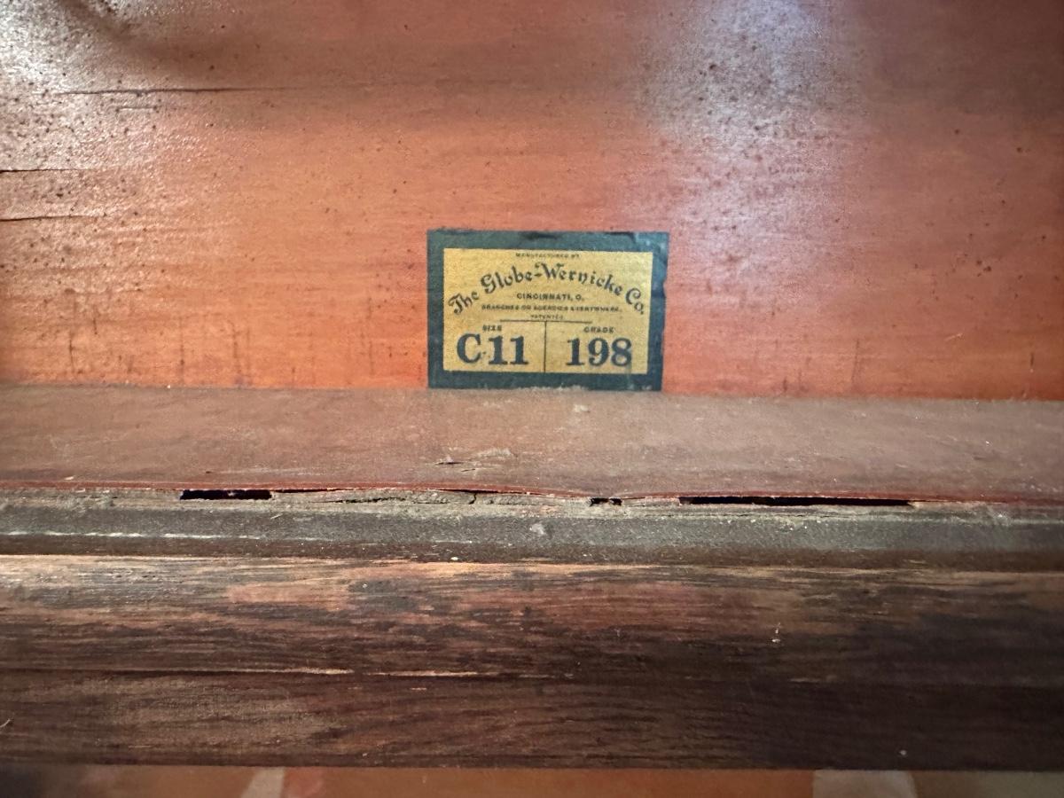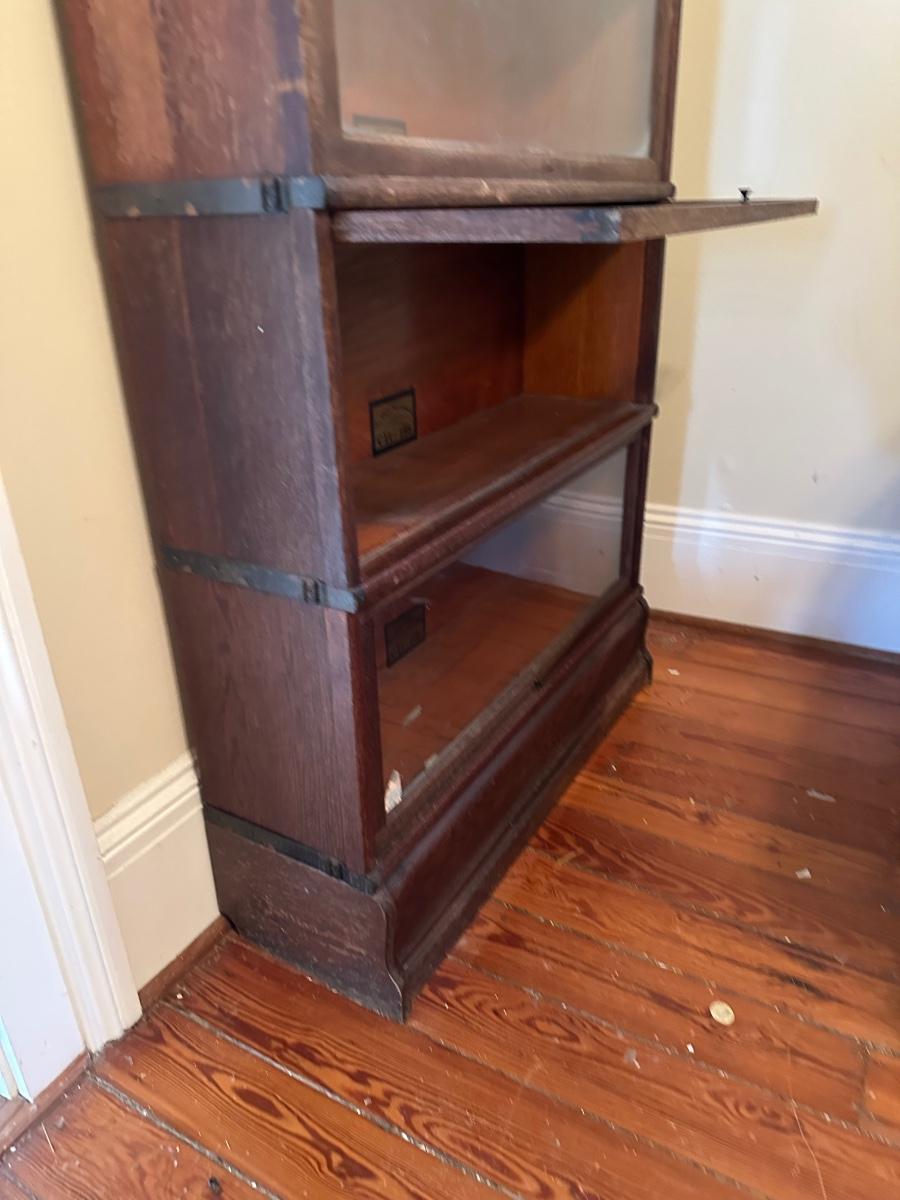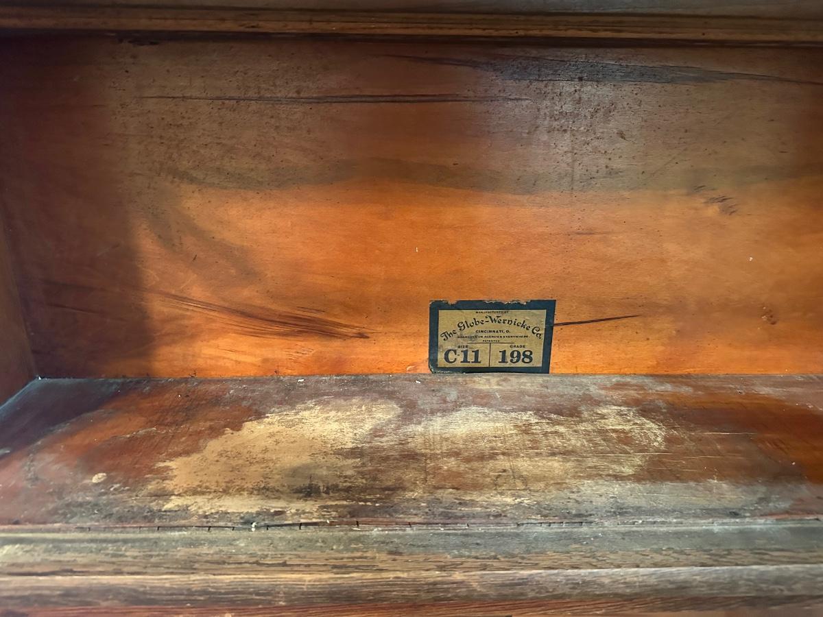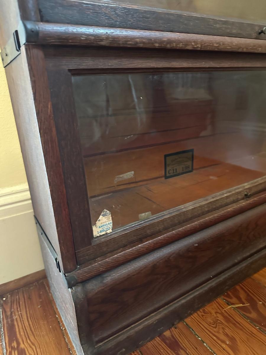Globe-Wernicke barrister bookcase featuring five stacking sections with original glass-front doors that lift and slide back, on gets stuck and does not fully slide back. Globe-Wernicke labels inside each unit (Size C11, Grade 198).