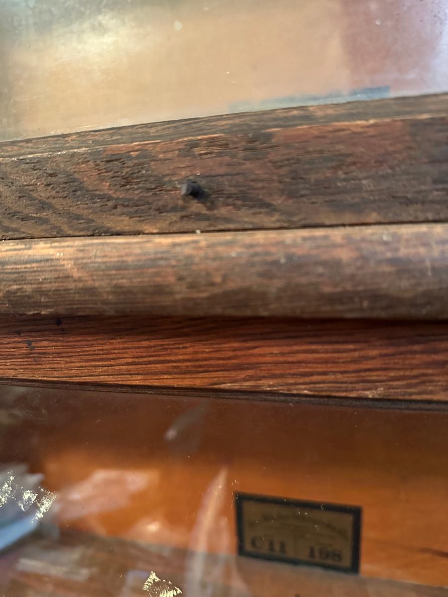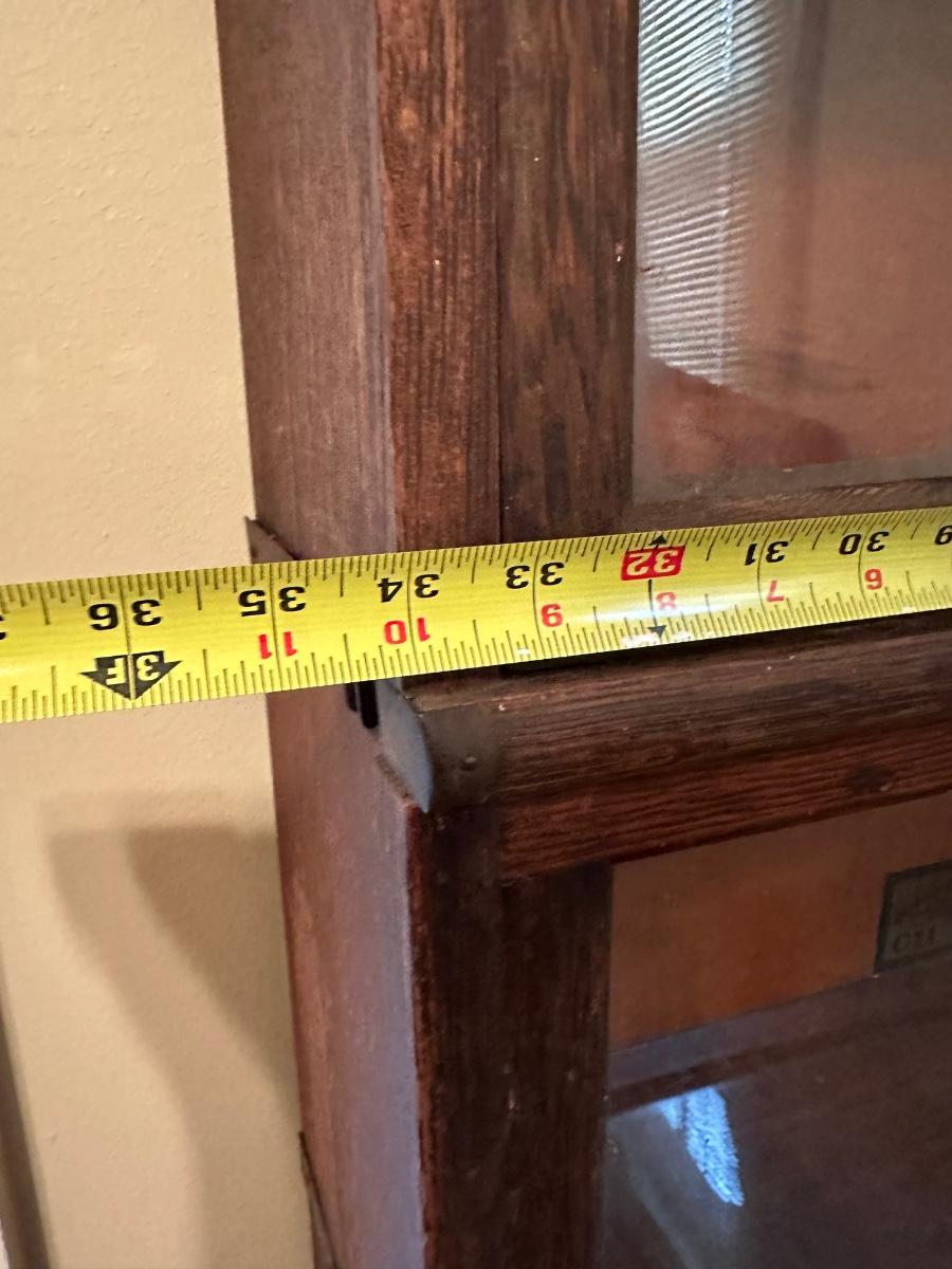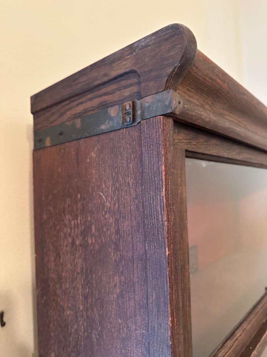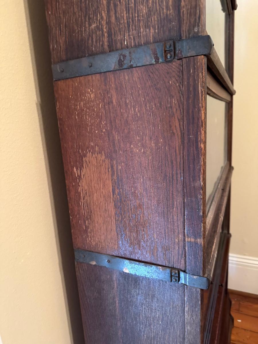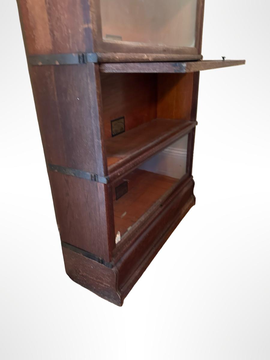 Globe-Wernicke barrister bookcase featuring five stacking sections with original glass-front doors that lift and slide back, on gets stuck and does not fully slide back. Globe-Wernicke labels inside each unit (Size C11, Grade 198).