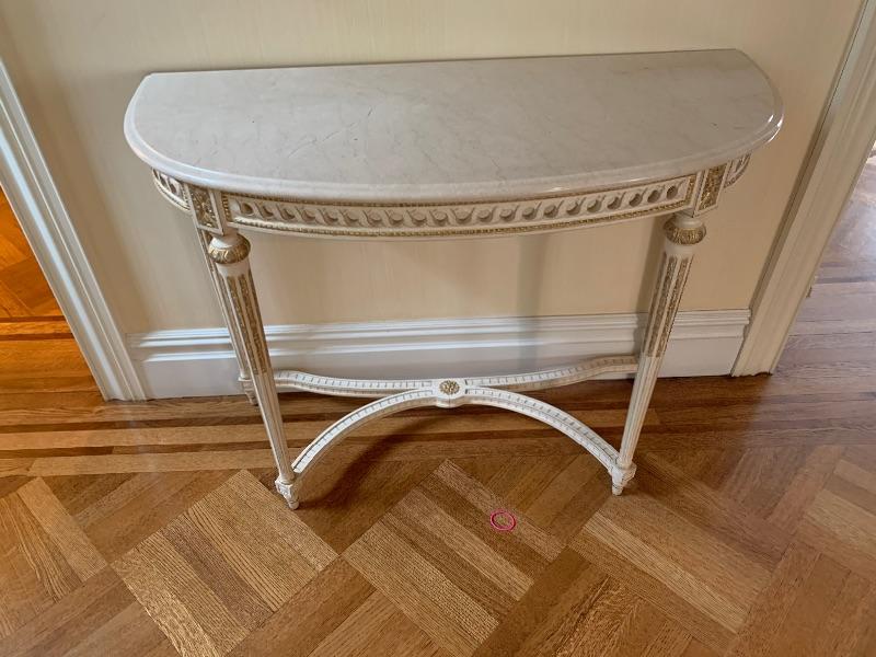 LOUIS XVI Console Semi Circle Table / Gold Leaf Accents Solid Wood Base/ Cream Marble Top:
