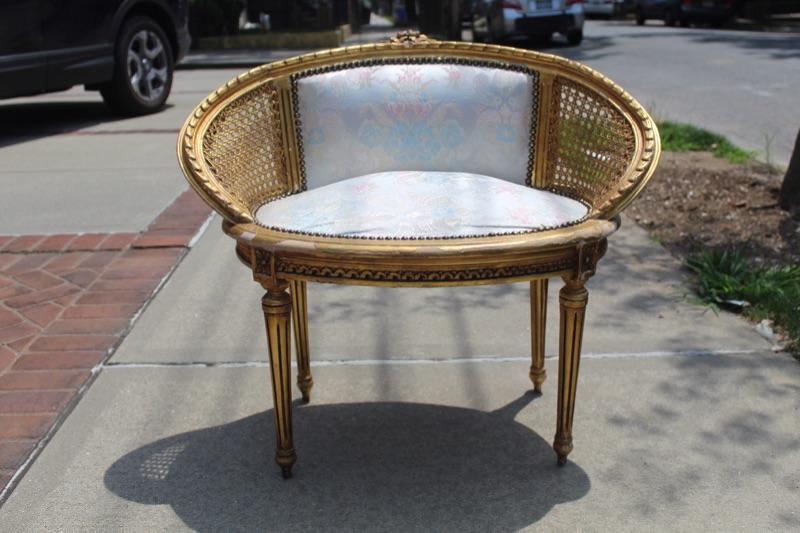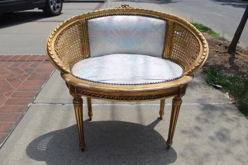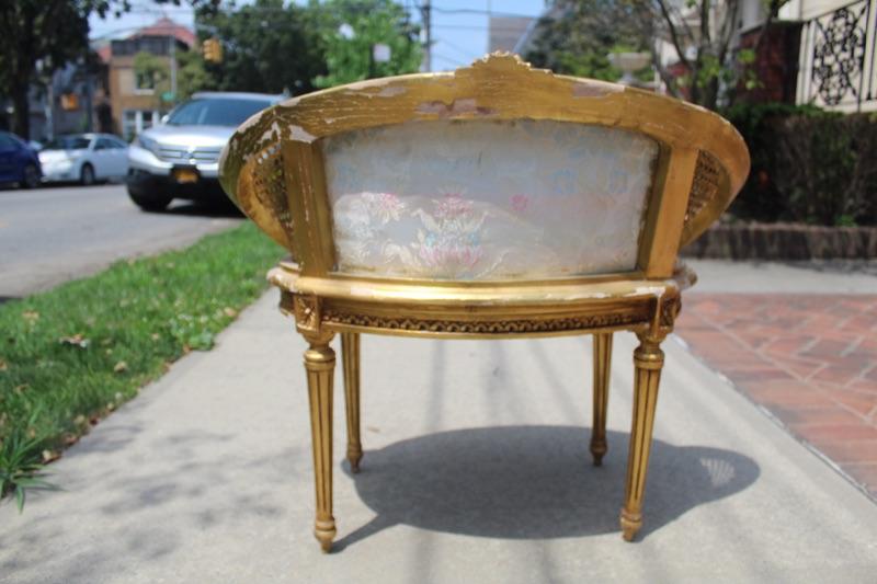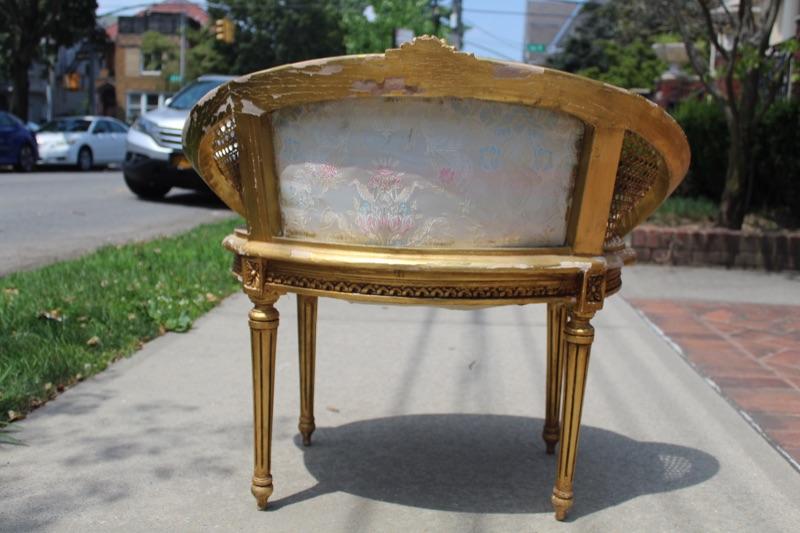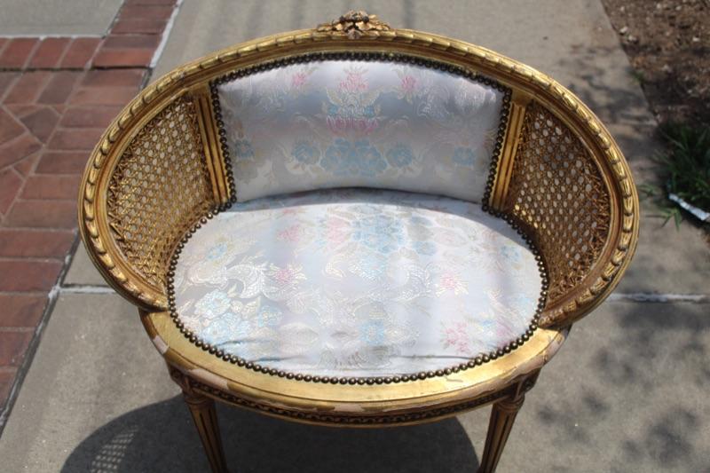 Good overall condition, as shown. Please note the gold paint loss in some areas. Settee measures 31”w x 18”d x 27.5”h.
