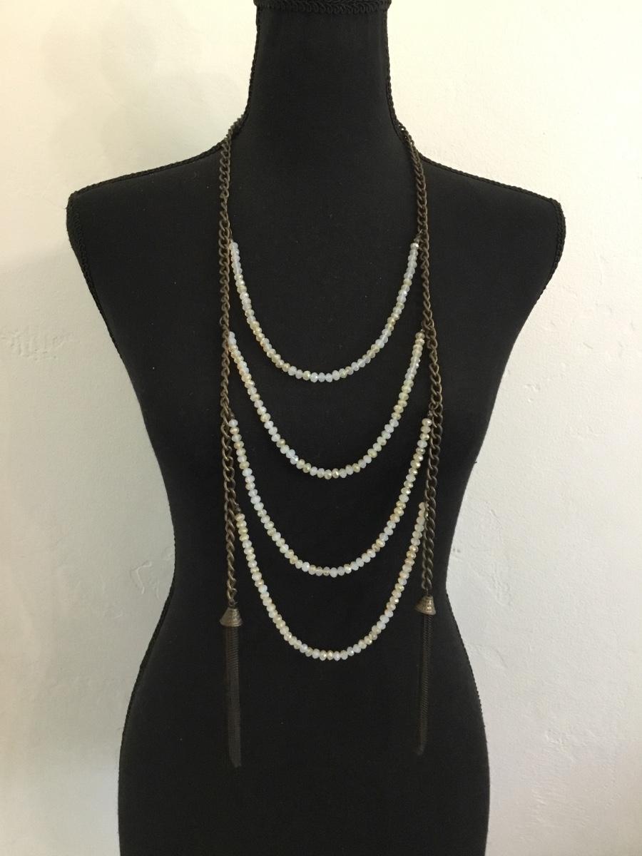 Antique, gold, toned, opal, light glass beaded bib, tassel, necklace