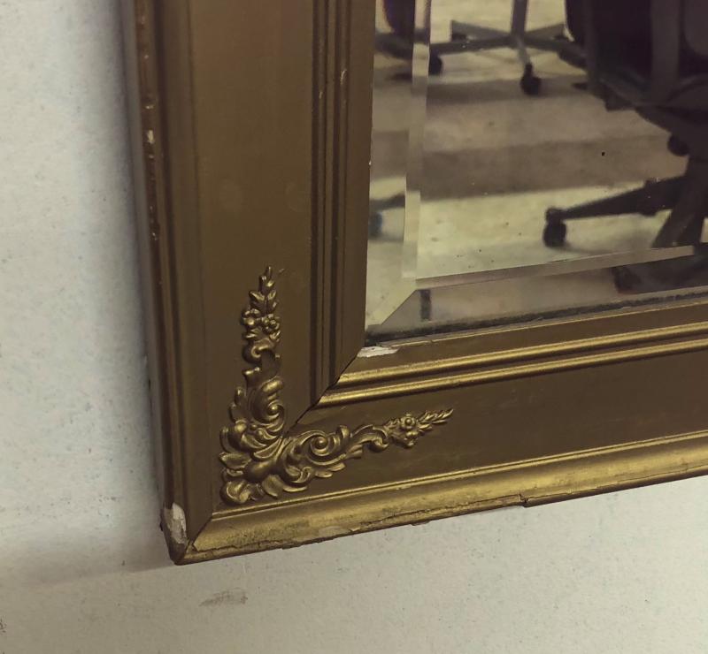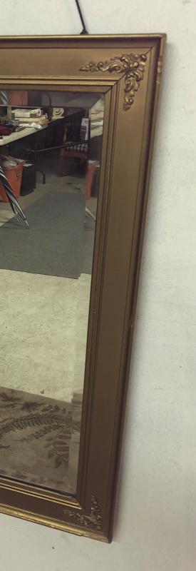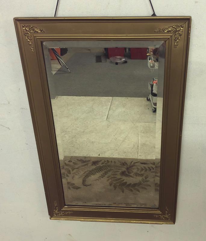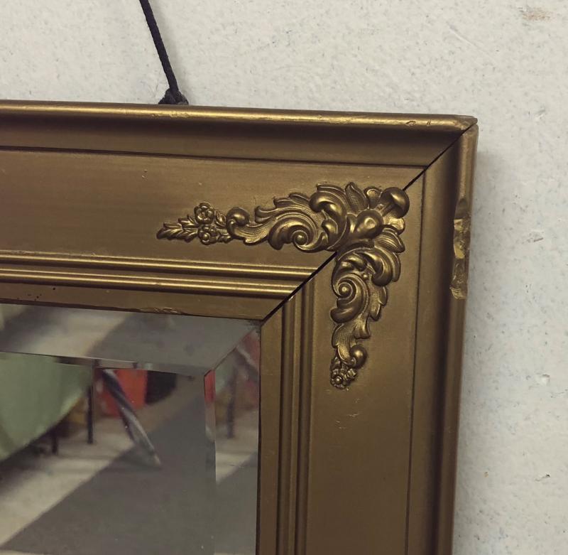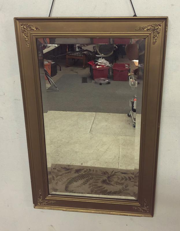 Here is an antique wall mirror...beveled glass..gesso embellishments on gold border...Dimensions:28 x 18.5"...some slight edge wear and loss with time and use...excellent condition on the mirror...