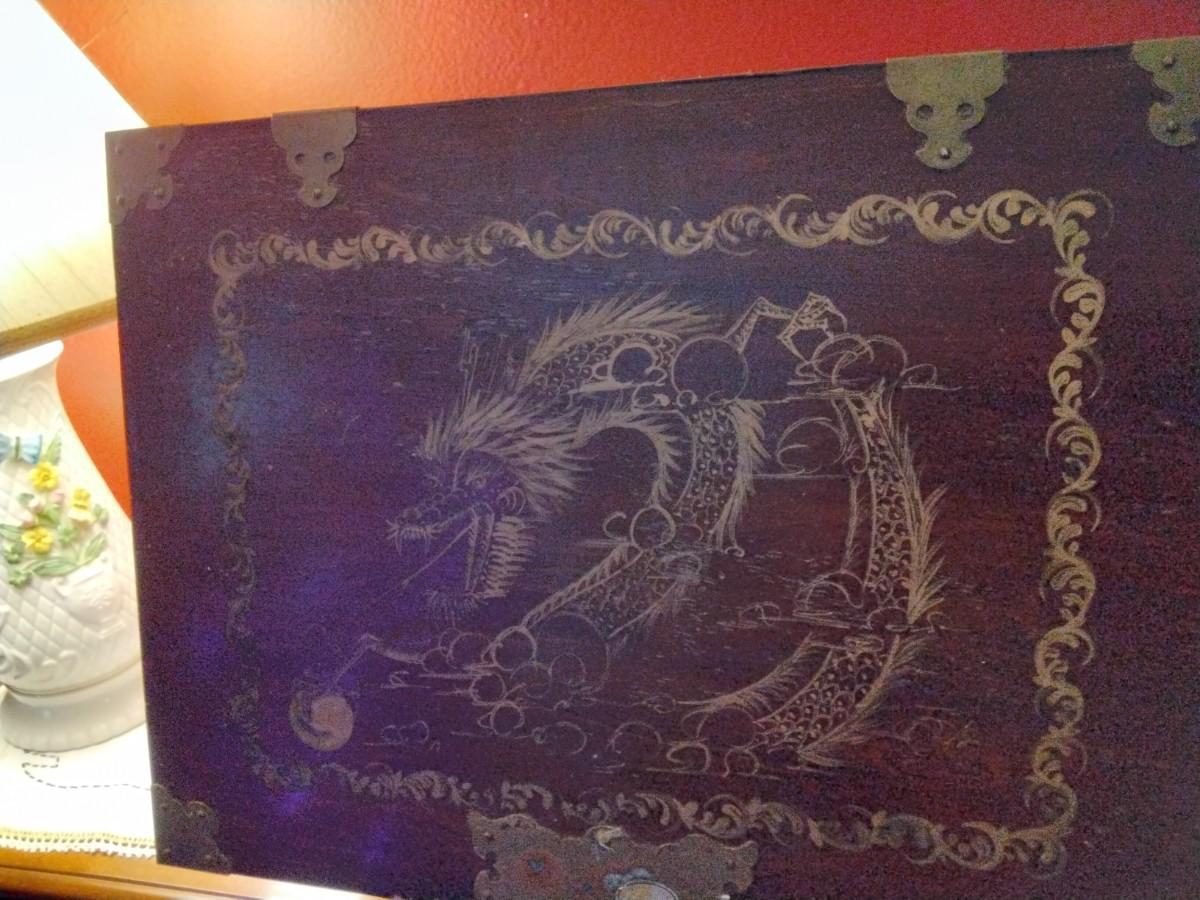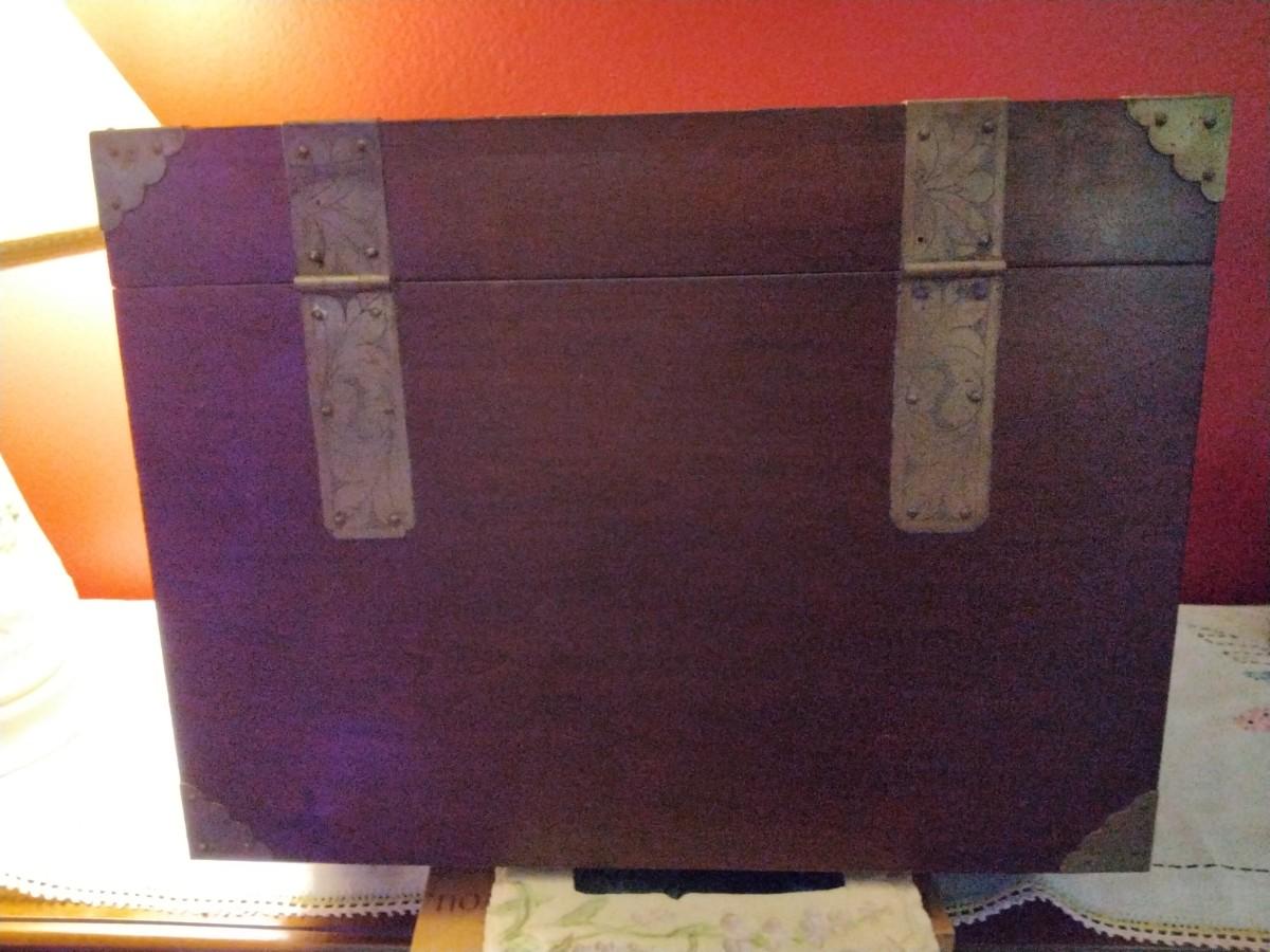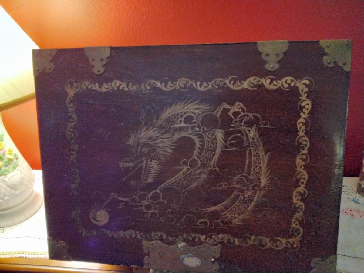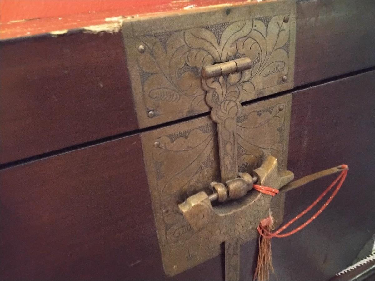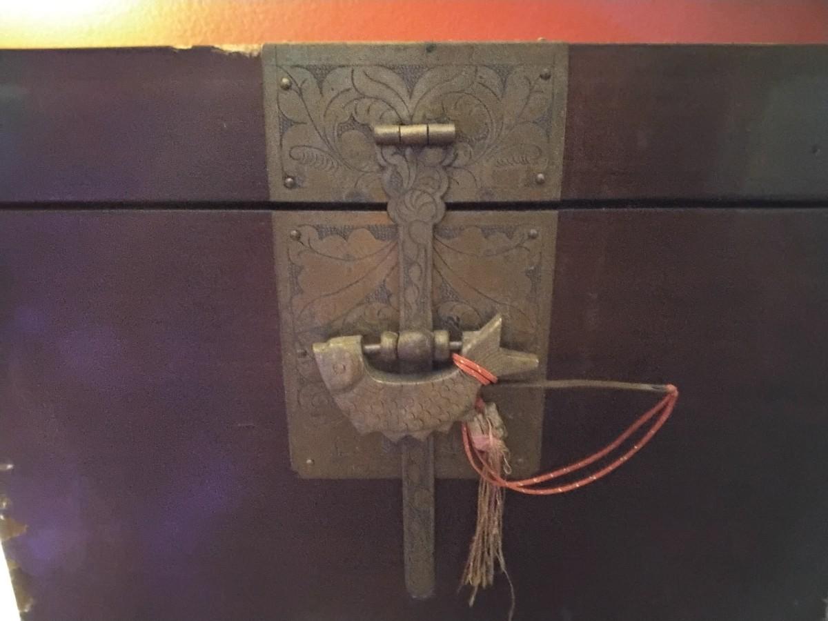 This gorgeous lock box is totally original with engraved brass fittings and working Chinese style lock still in place.. Impressive hand painted scenes in gold throughout.. All the scenes are auspicious and very well executed, framed by scrolled borders. The age is undetermined. It is a stunning piece of art and quite useful as well. Stand is included.