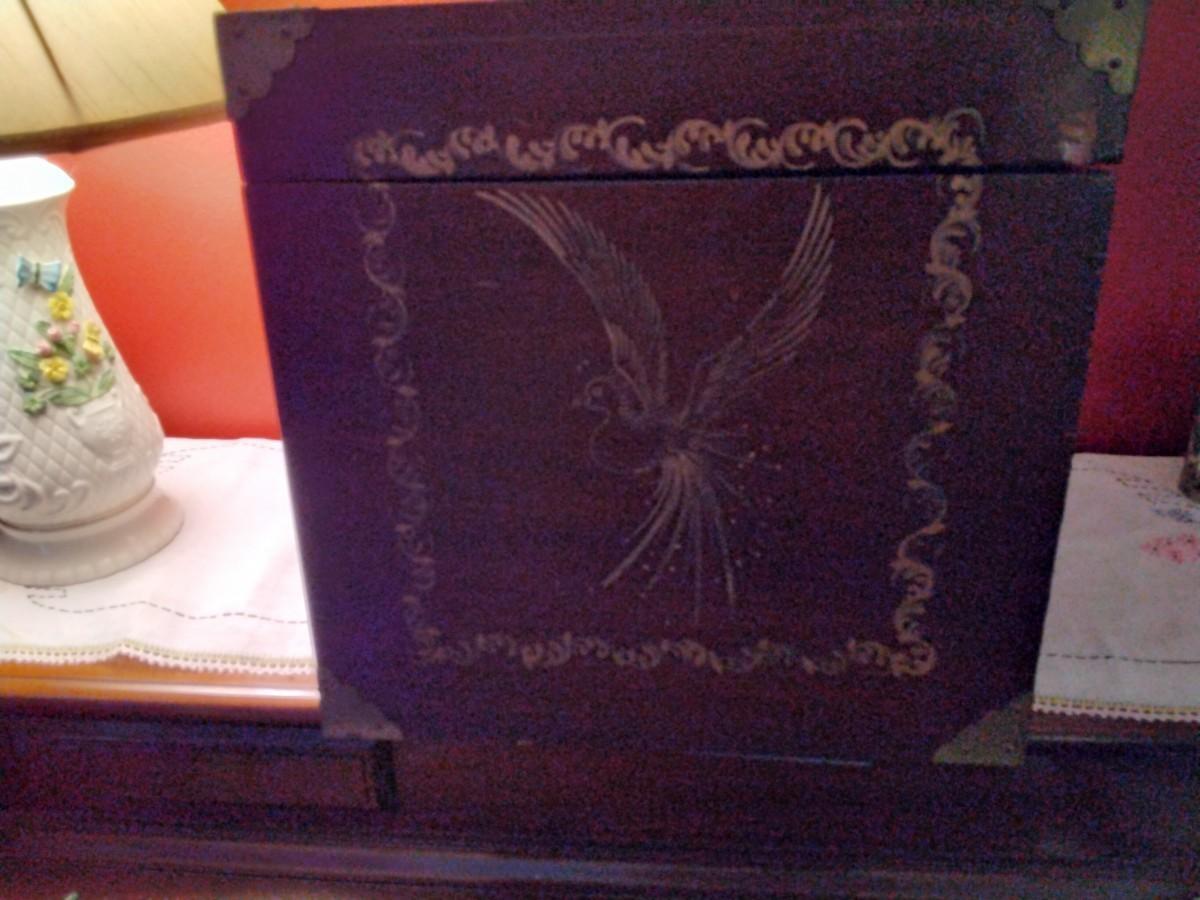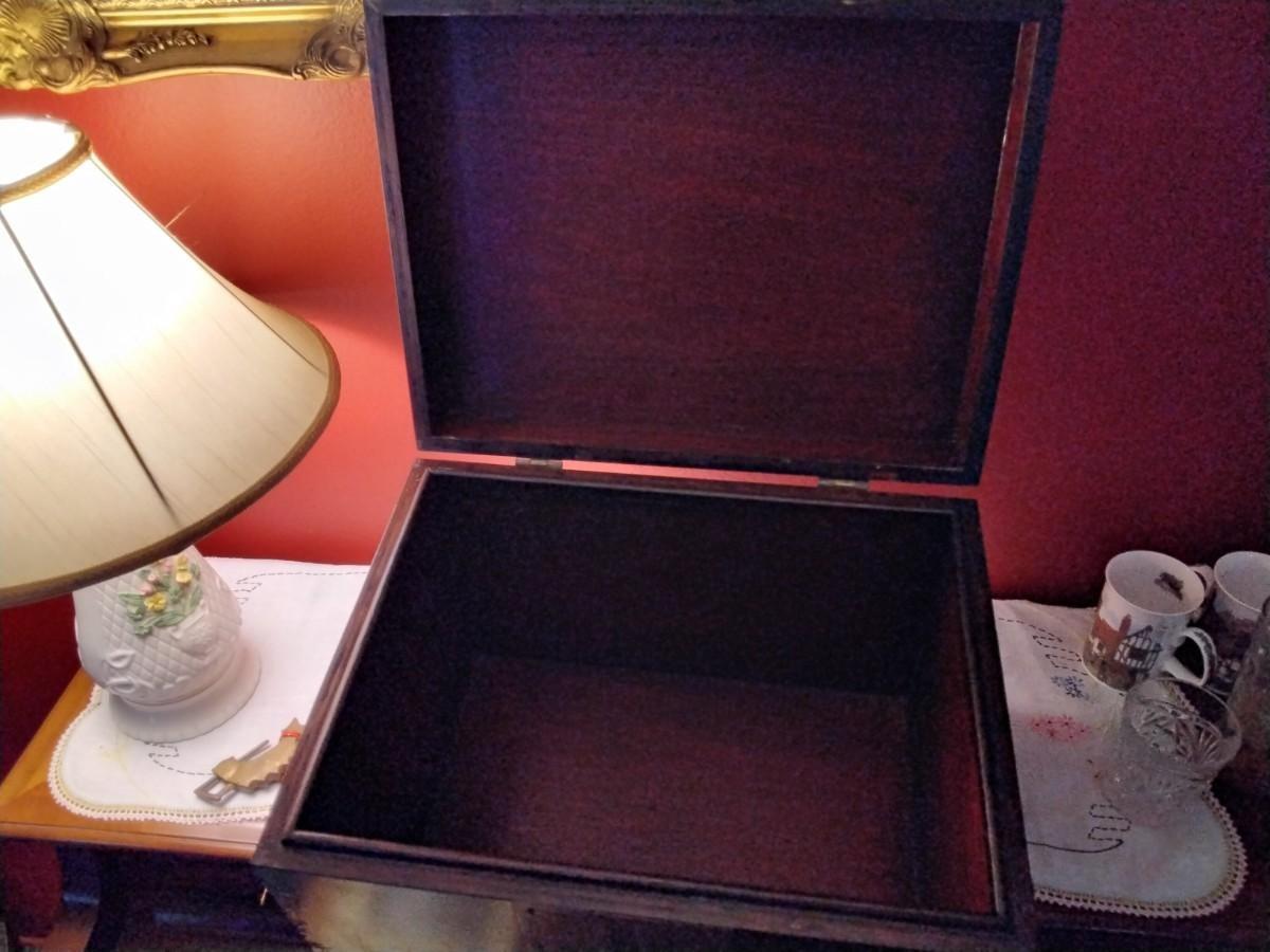 This gorgeous lock box is totally original with engraved brass fittings and working Chinese style lock still in place.. Impressive hand painted scenes in gold throughout.. All the scenes are auspicious and very well executed, framed by scrolled borders. The age is undetermined. It is a stunning piece of art and quite useful as well. Stand is included.