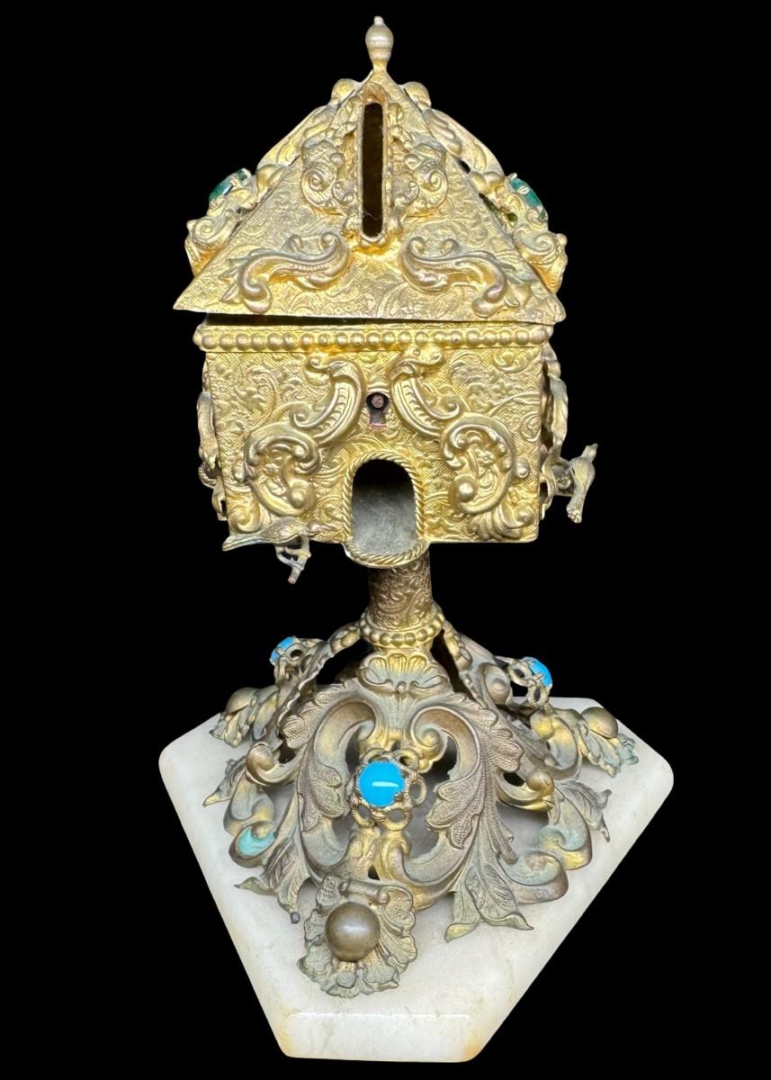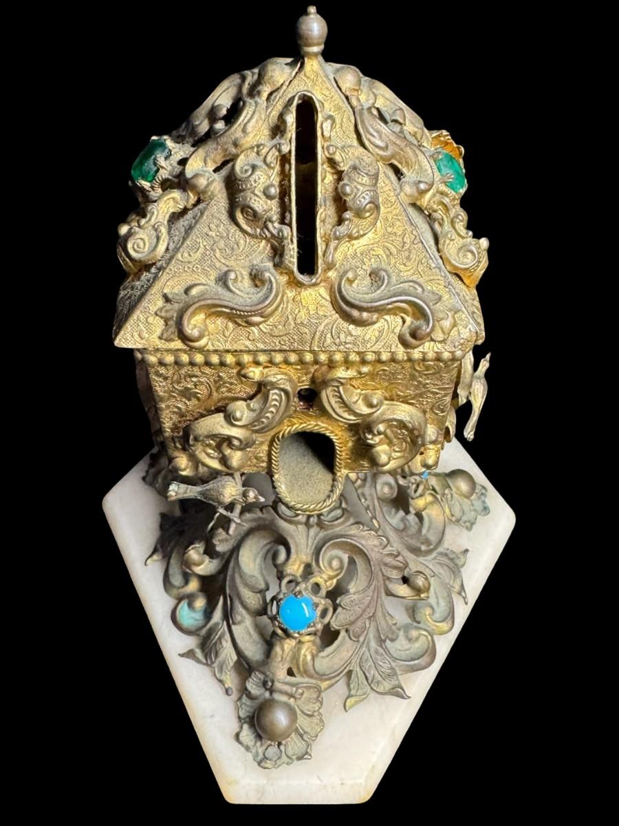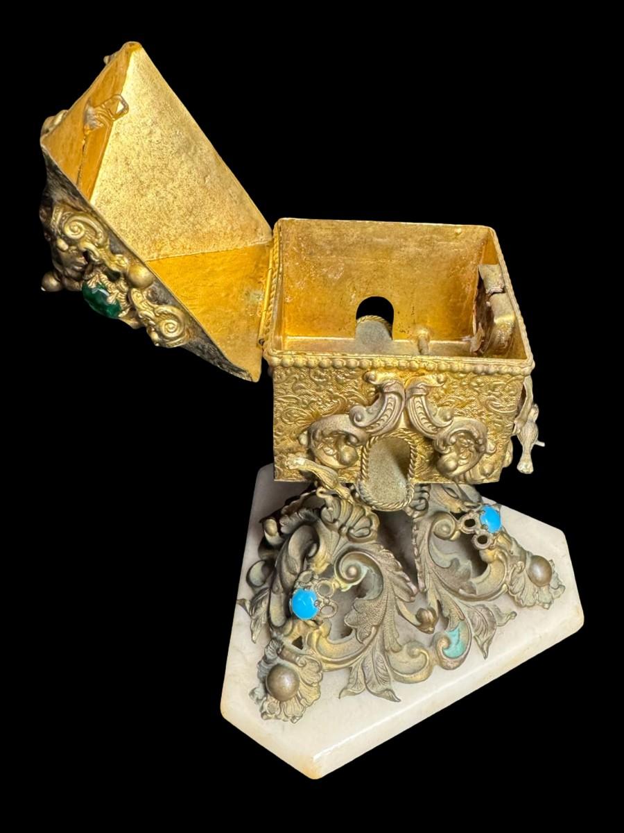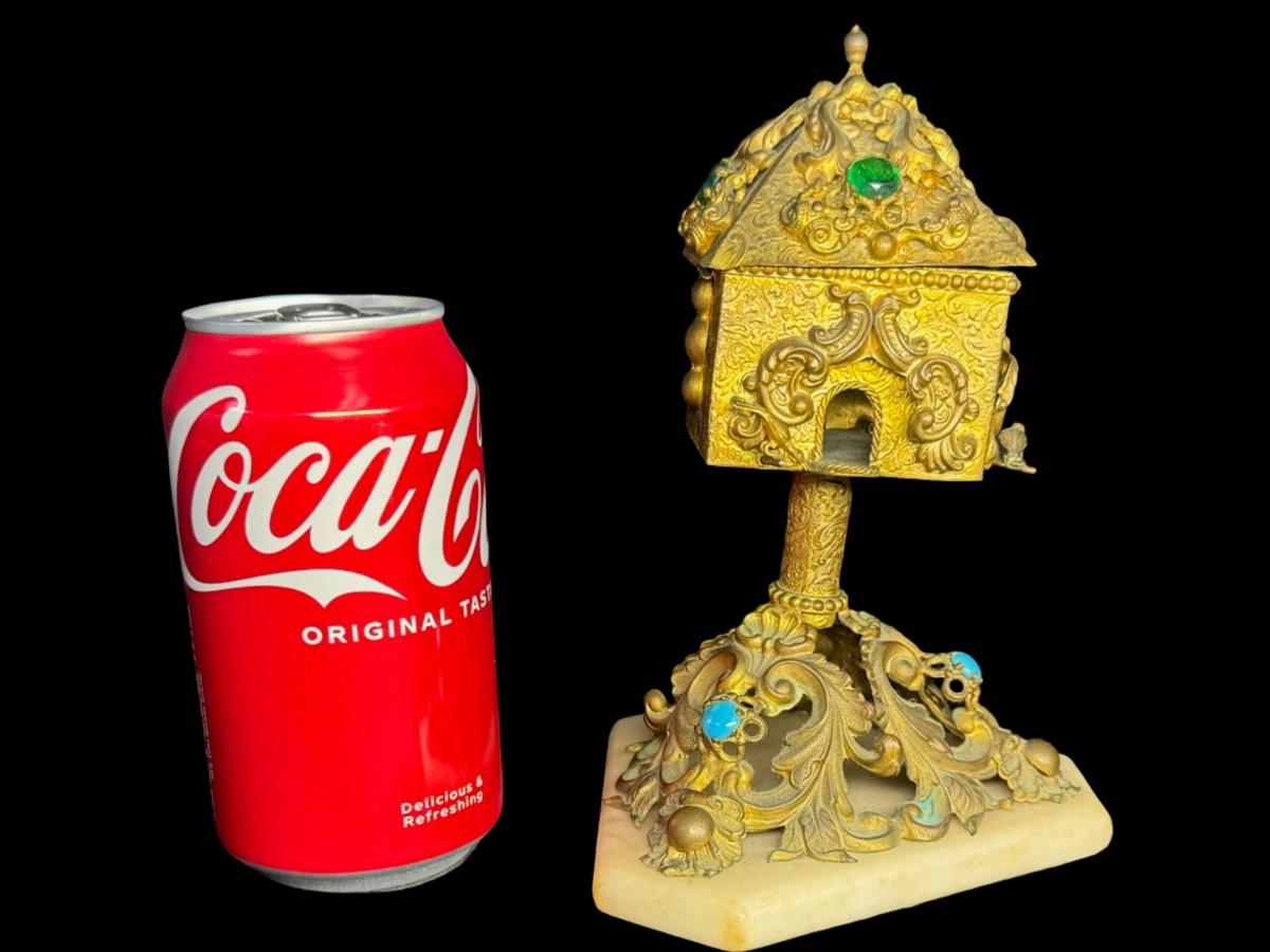 This highly decorated brass piece has a marble base with ornate brass scrollwork. It contains cabochon stones and other intricate details, such as birds. This piece resembles a bird house on a pedestal. It is missing the original key. There is patina and verdigris throughout. Measurement: 7”H x 5”W. [JP]