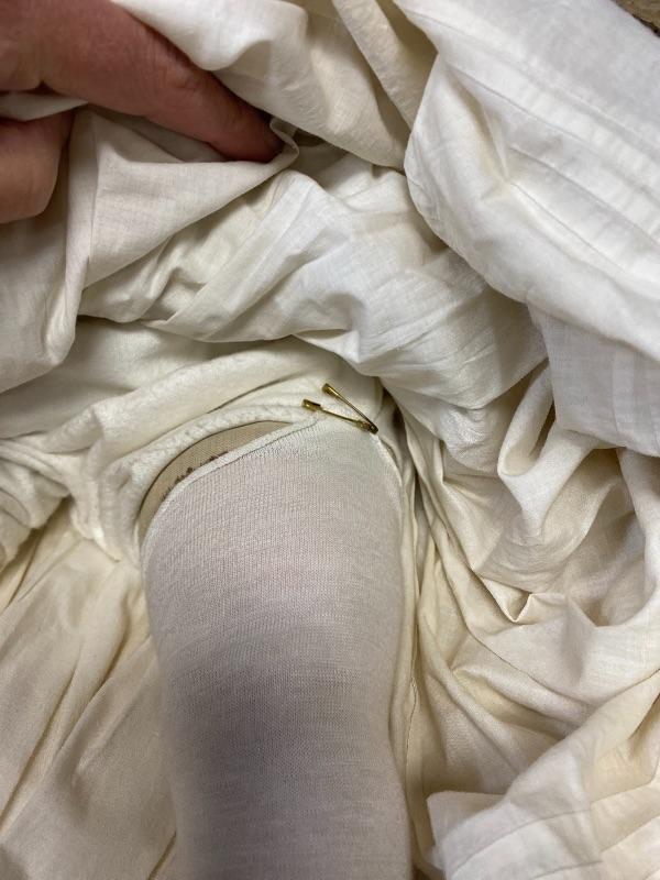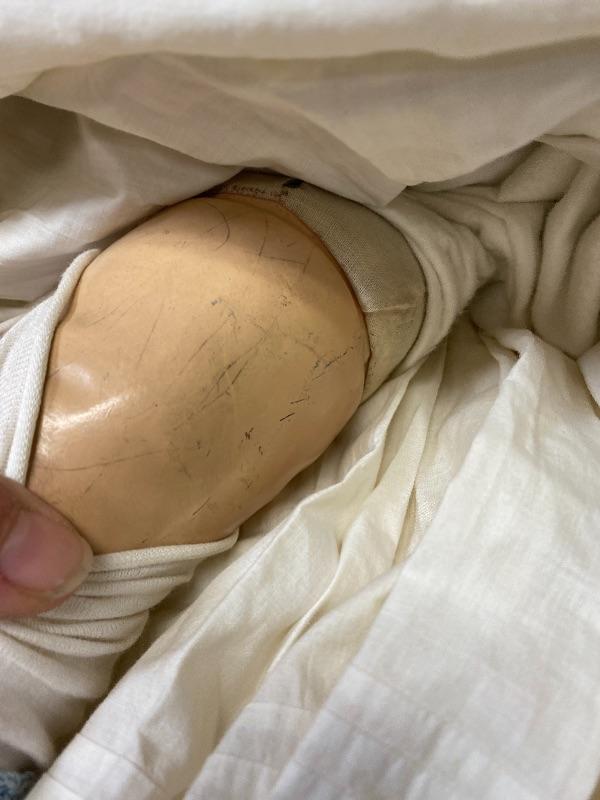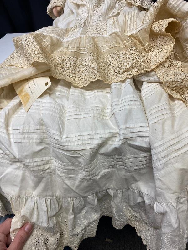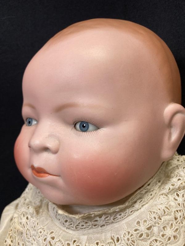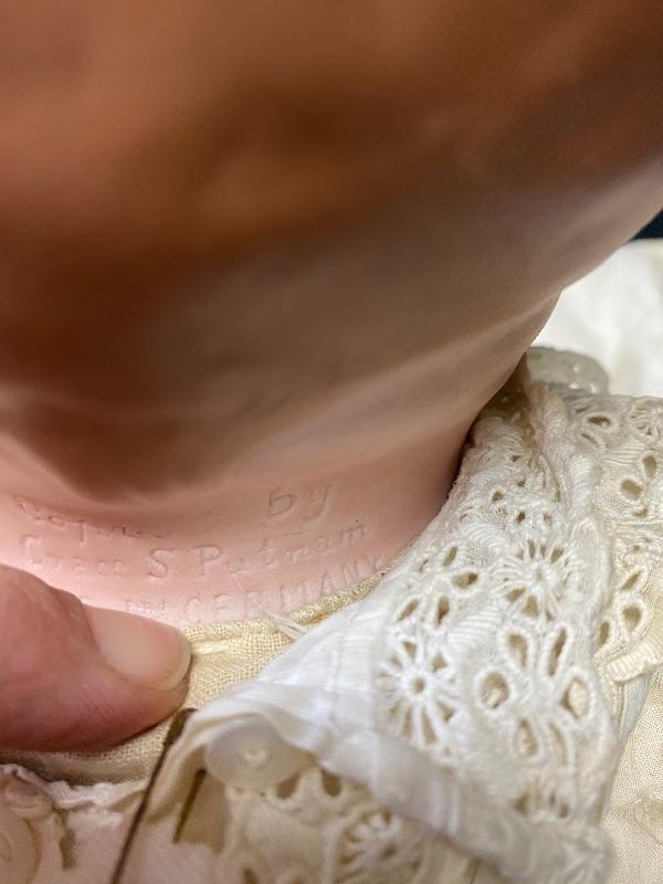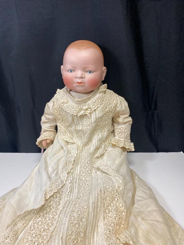 Antique chubby faced Grace Putnam Bye Lo baby doll. Large 25" doll. Porcelain head, cloth body, composite limbs. Fixed pale blue eyes, painted hair and rosy cheeks. Marked on the back of head. Made in Germany. Doll is a crier doll but no longer makes noise. Wearing an antique long Victorian gown over an underdress. Undergown has a note pinned to it in regards to a Kestner doll that must have been wearing the dress at one time. Some wear to the composite. Discolor and holes in the clothing.