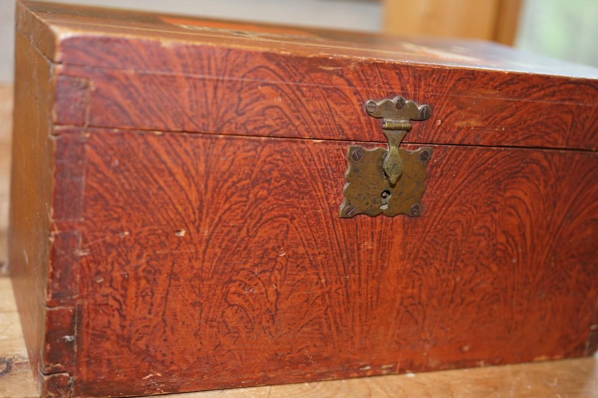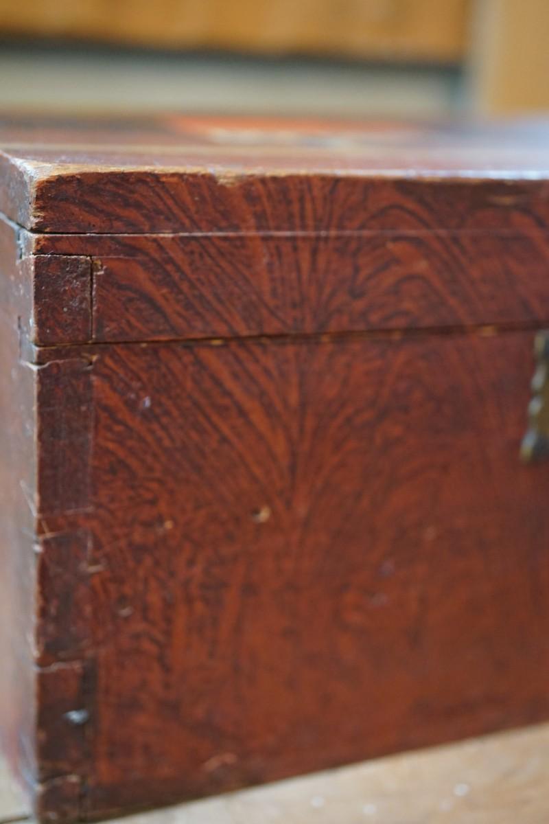 It is early grain painting on this 14" by 7" by 8" box with a early lock set. The lock doesn't work and does not have a key.