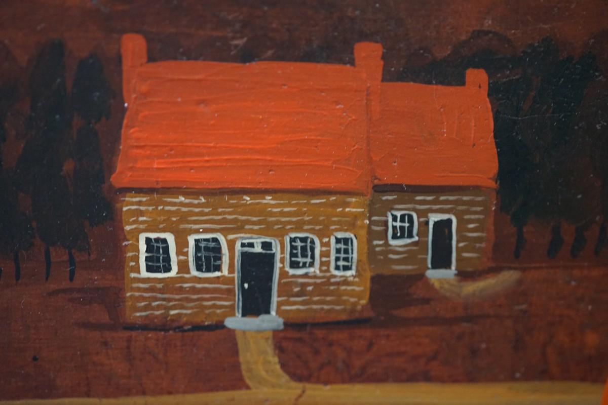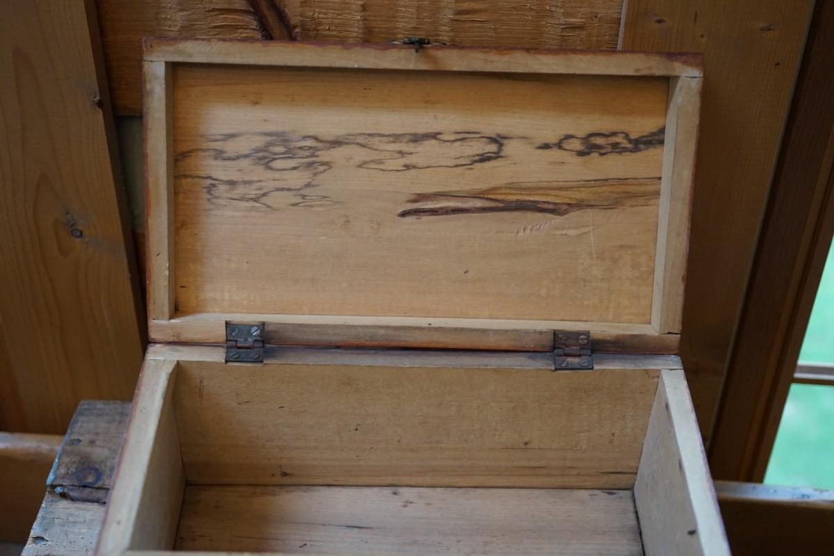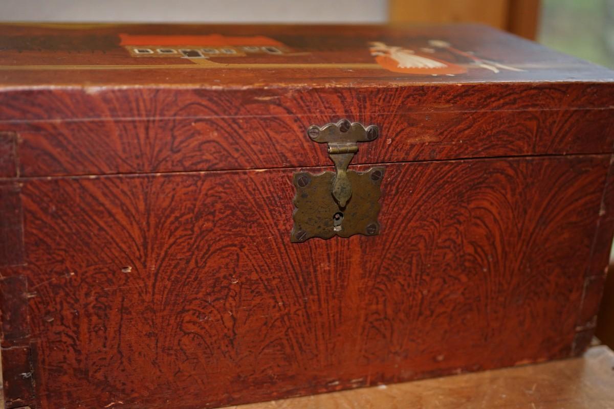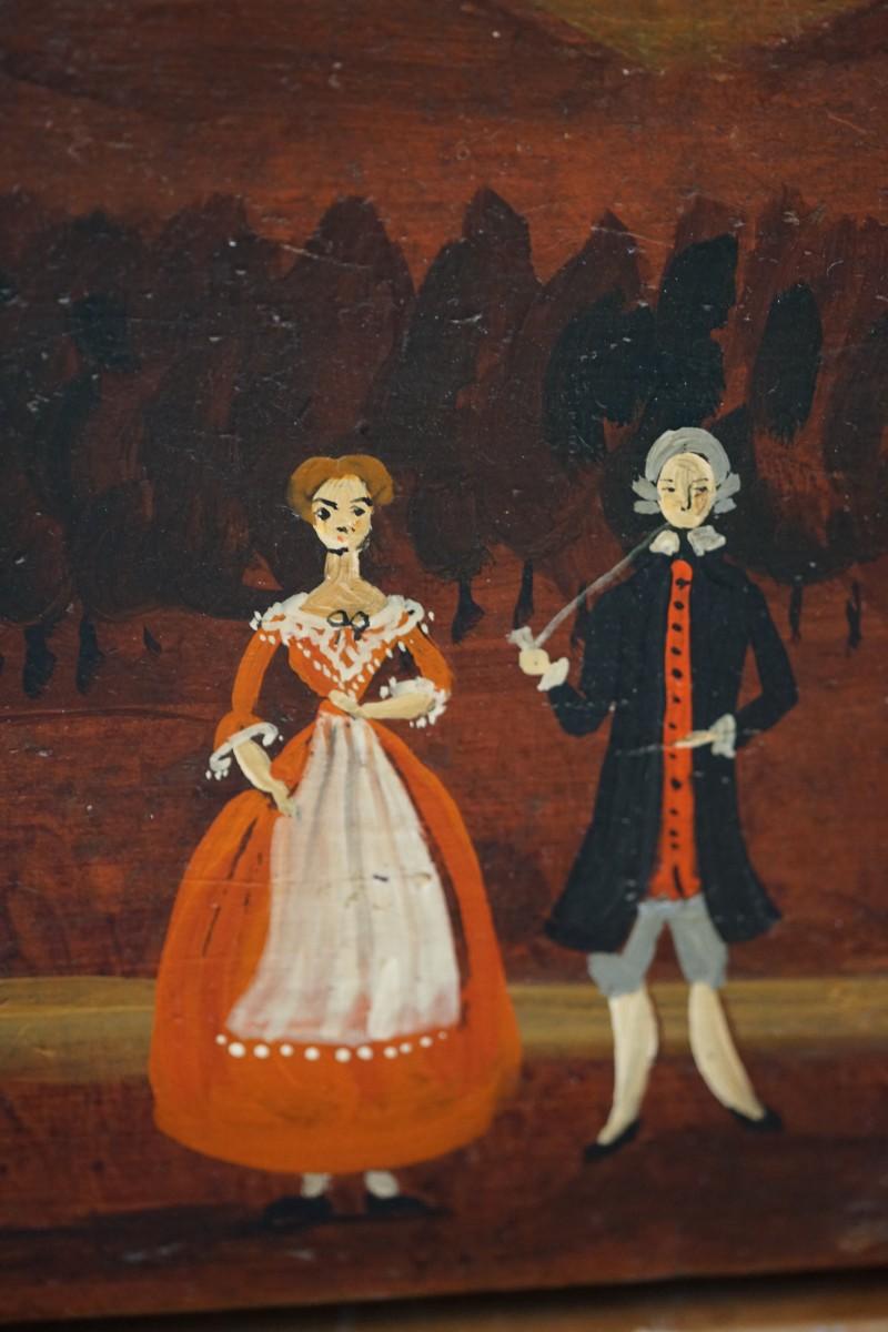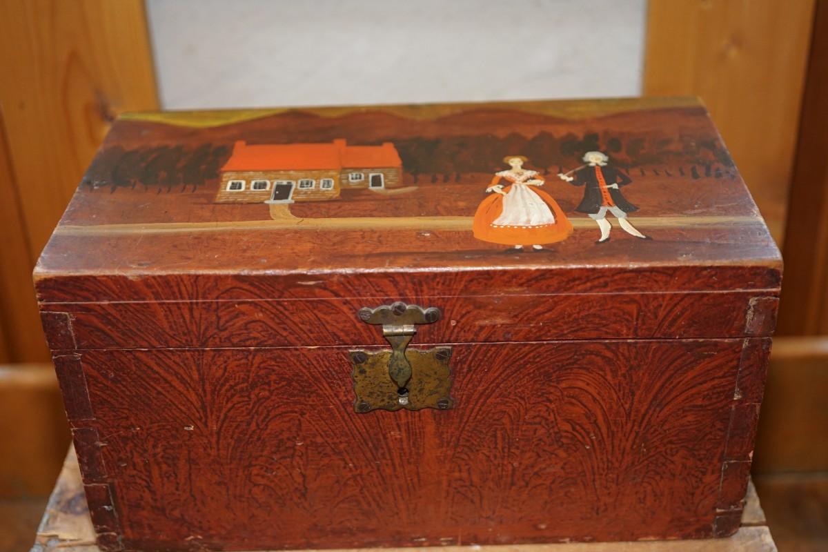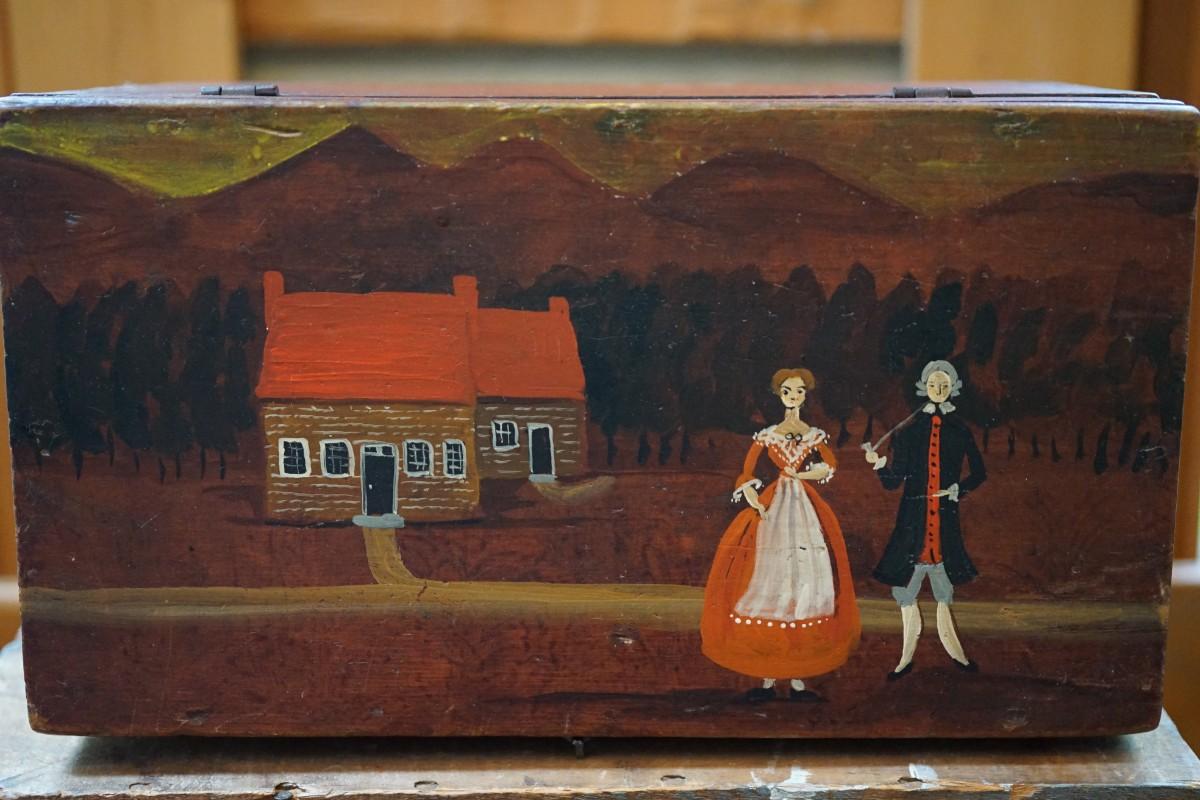 The hand painting on the top was done later but is very well done in folk art painted style. Love the little hewn log house and two folk art style figurines of lady and man. forested background.