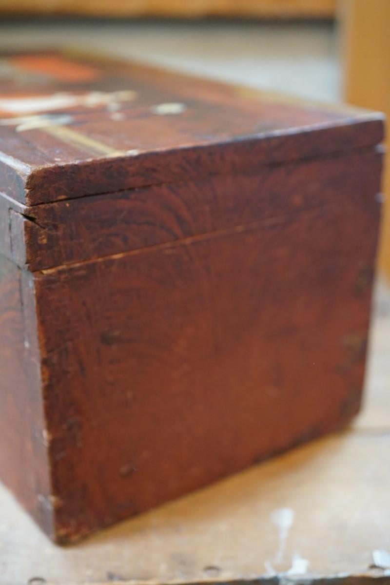 ANTIQUE GRAIN PAINTED BOX W/ FOLK ART FIGURES /LOG CABIN