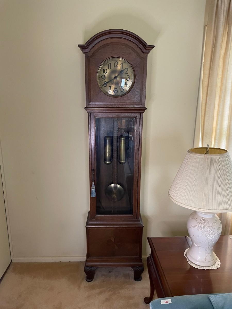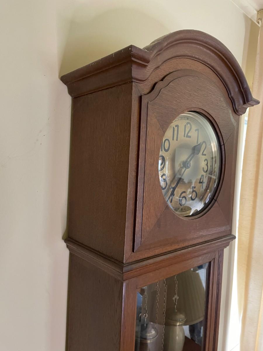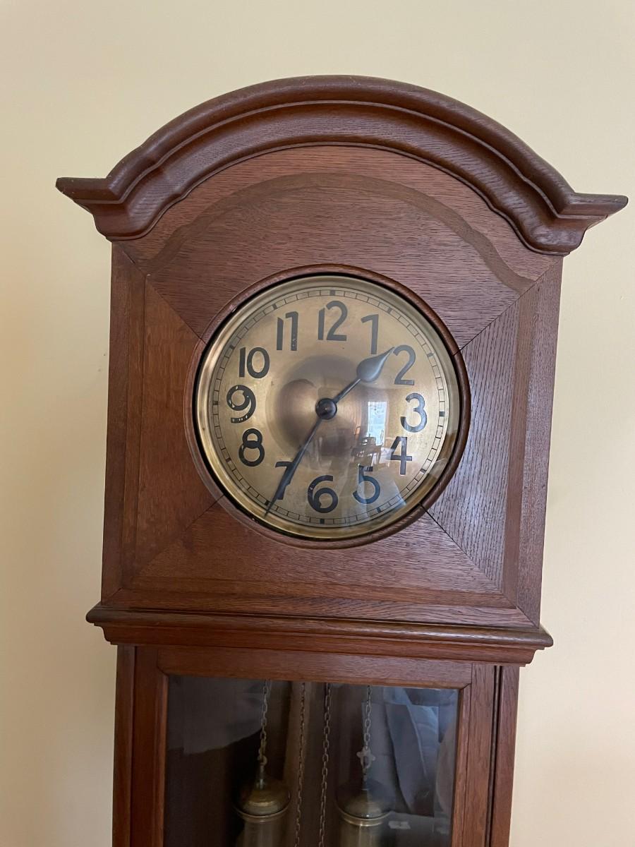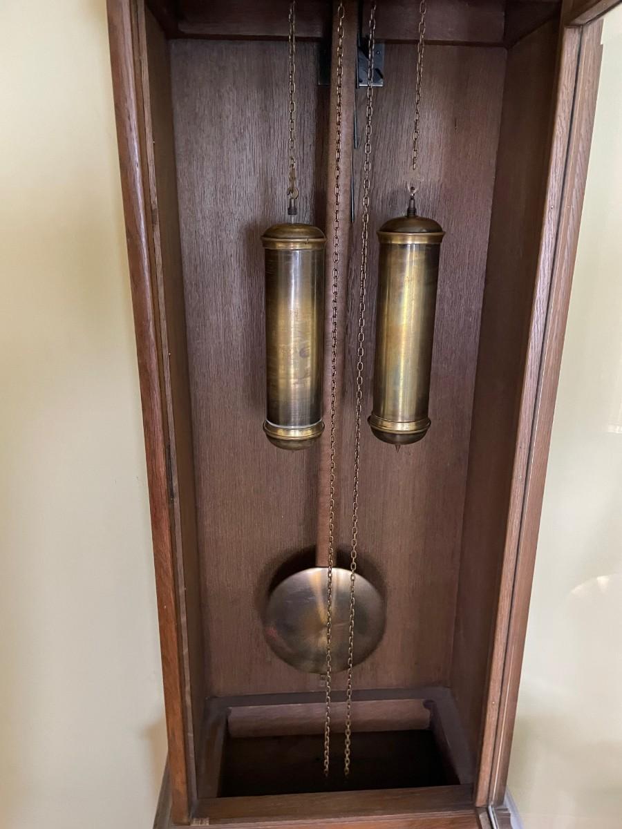 Two weights. Beautiful chime. In working order. Wood has been beautifully maintained. 19Lx 10Wx 78H