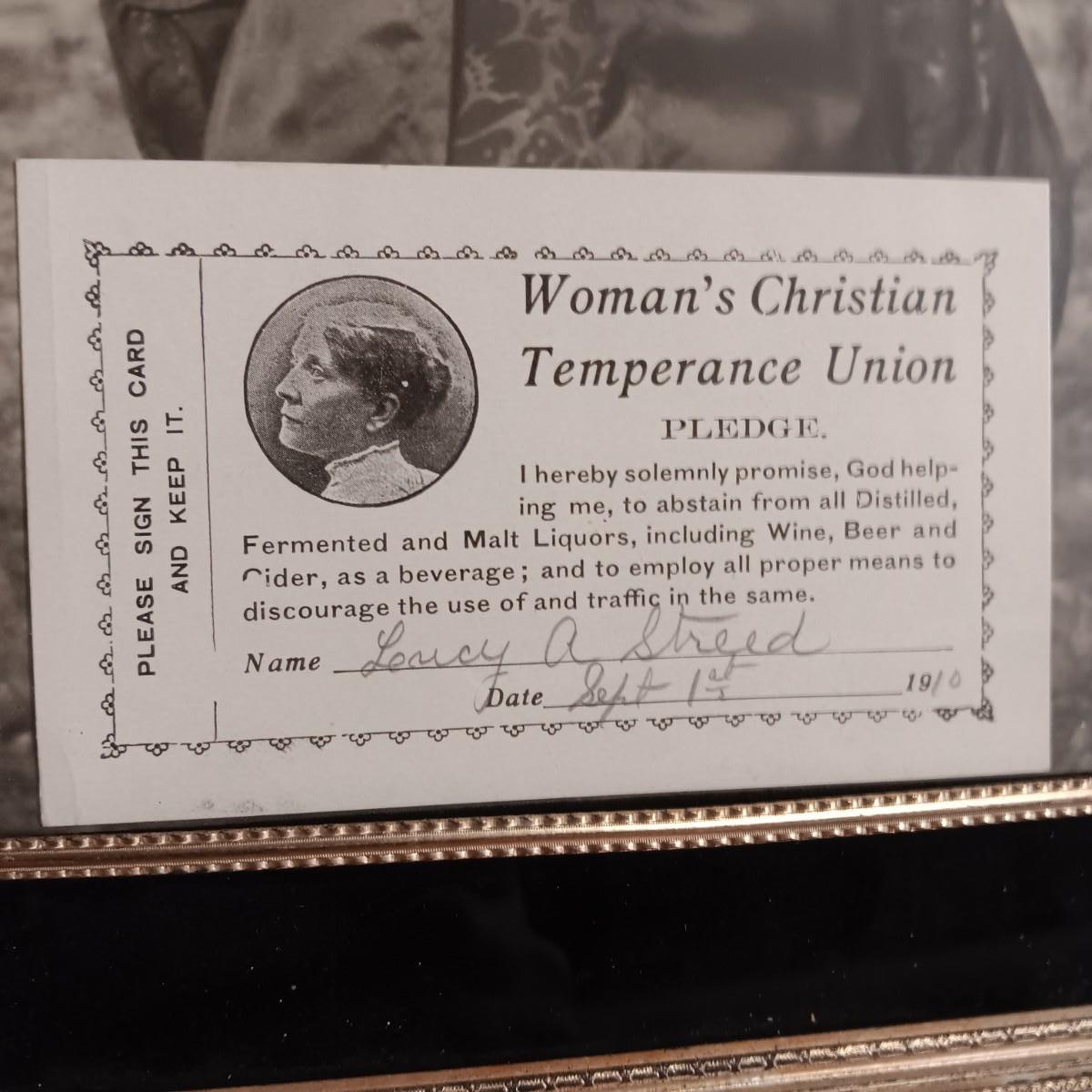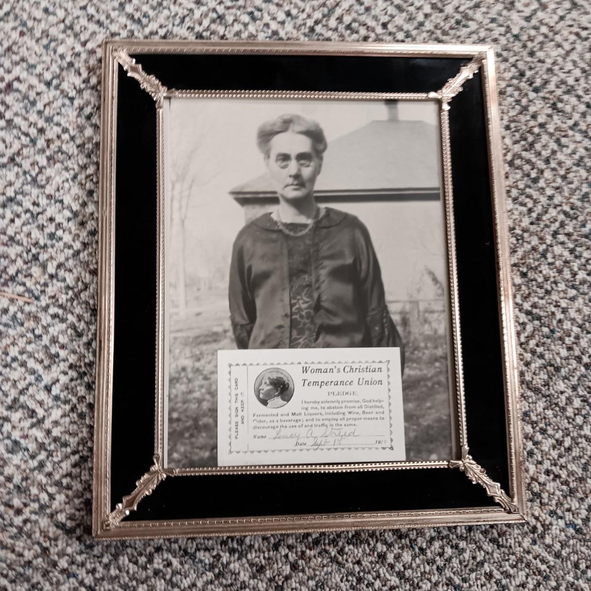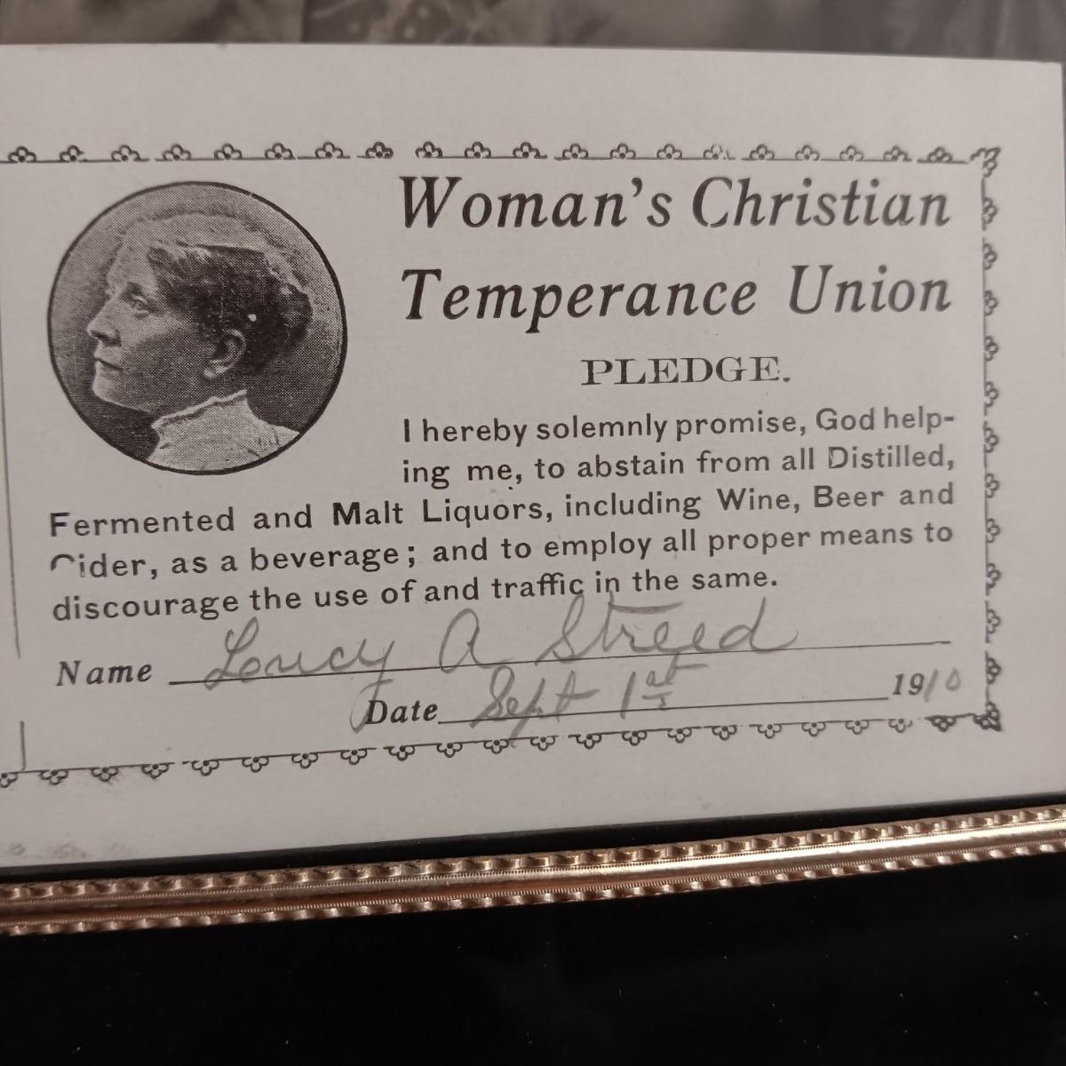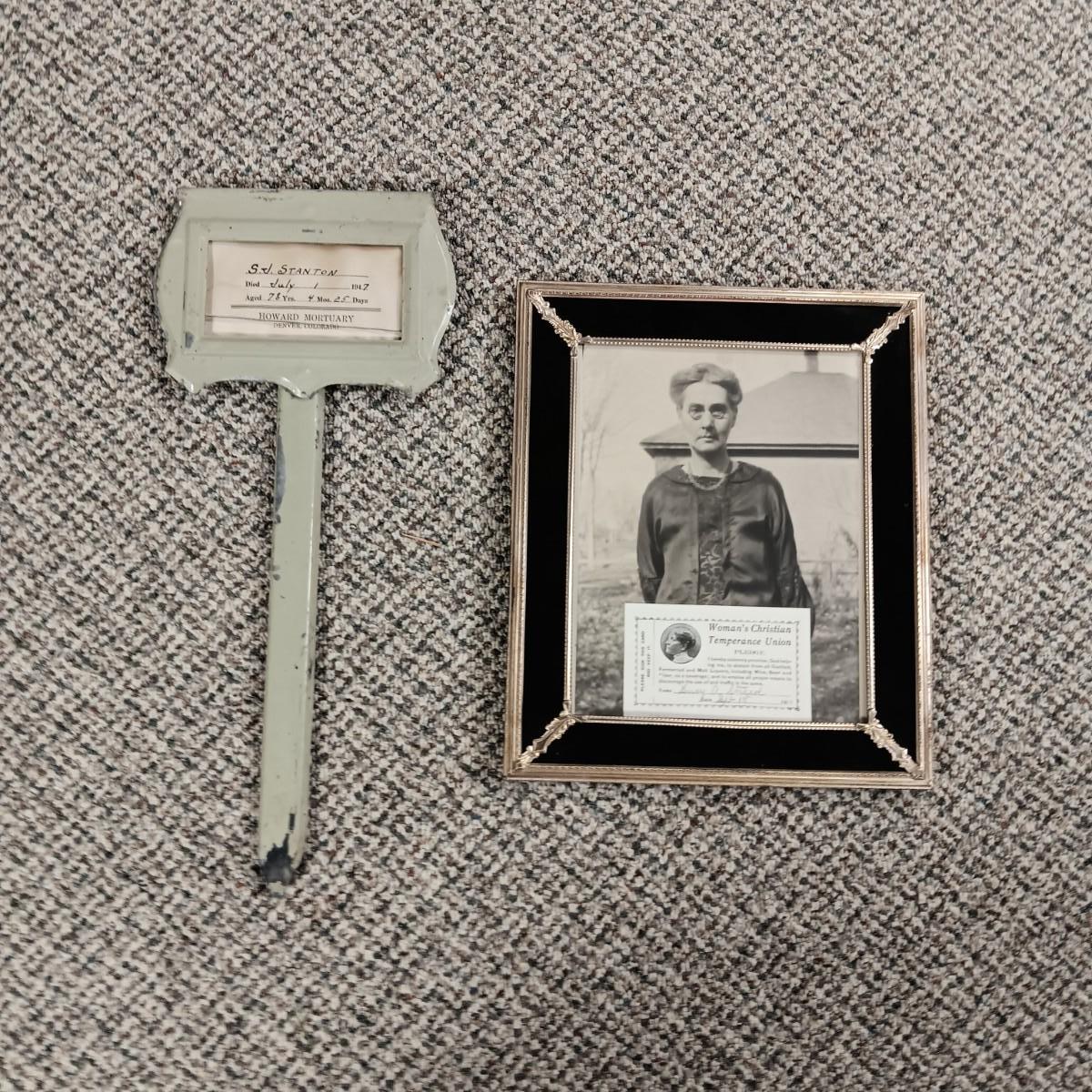 ANTIQUE GRAVE MARKER AND A MEMBER OF THE WOMAN'S CHRISTIAN TEMPERANCE UNION