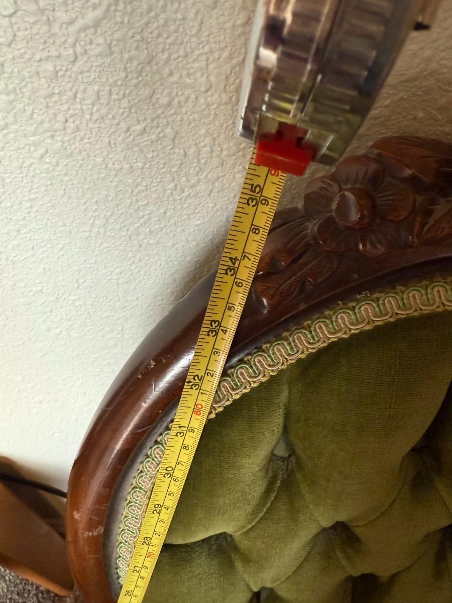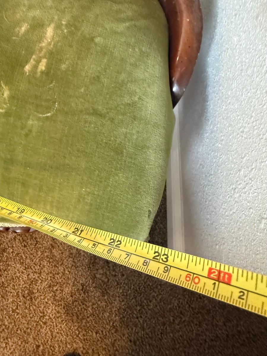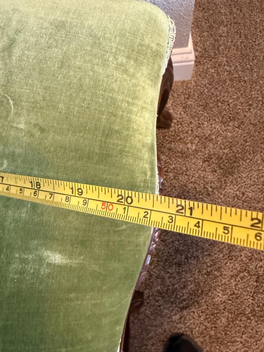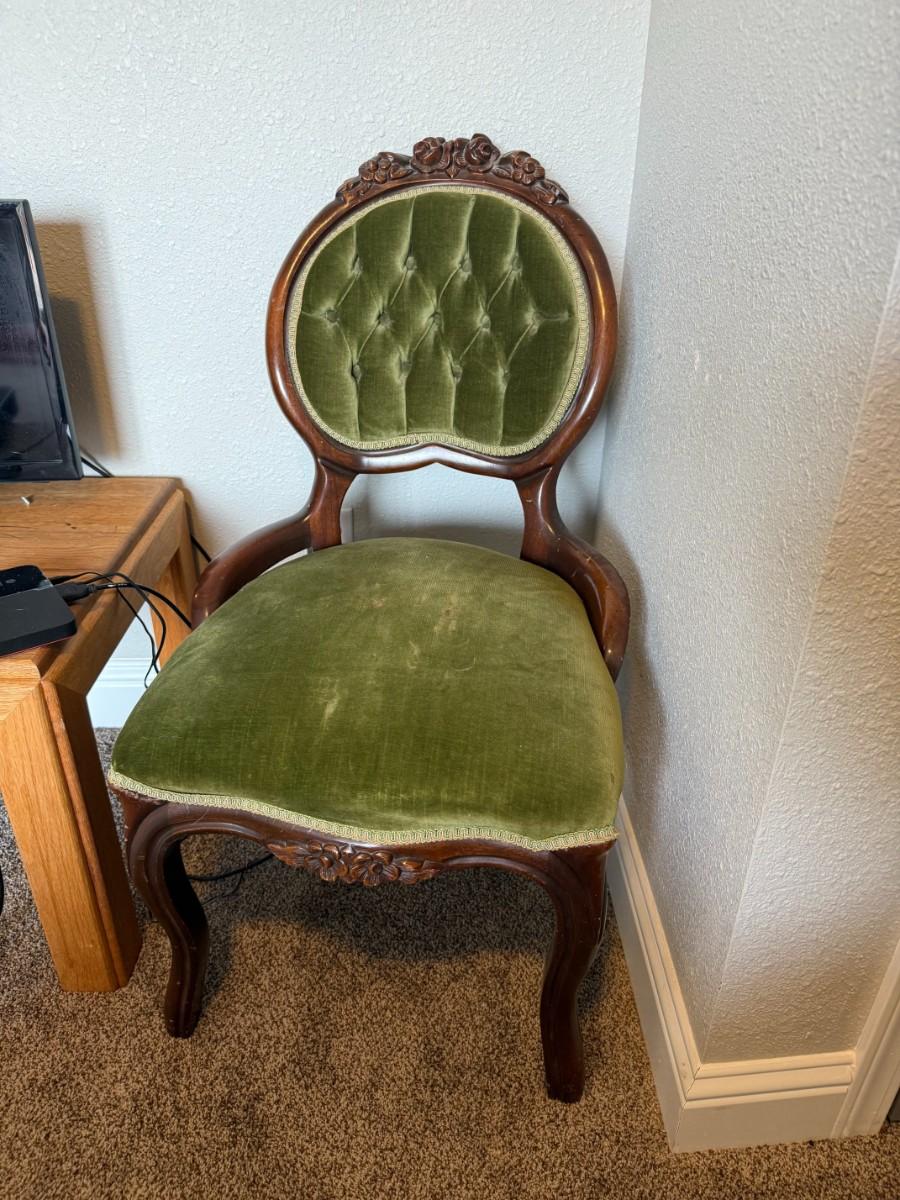 Gorgeous carved wood frame with button-tufted green velvet upholstery. Some wear on seat fabric consistent with age.