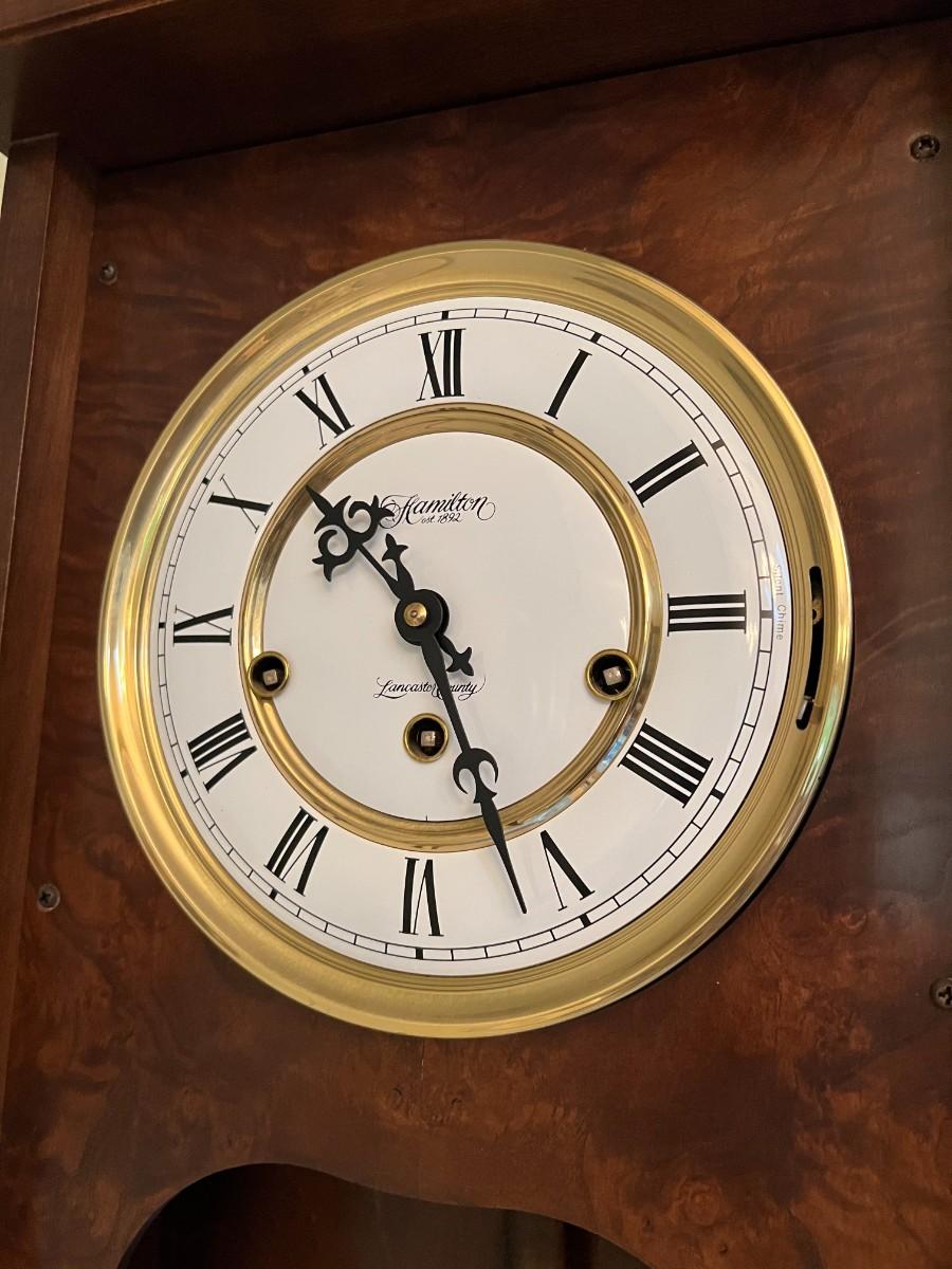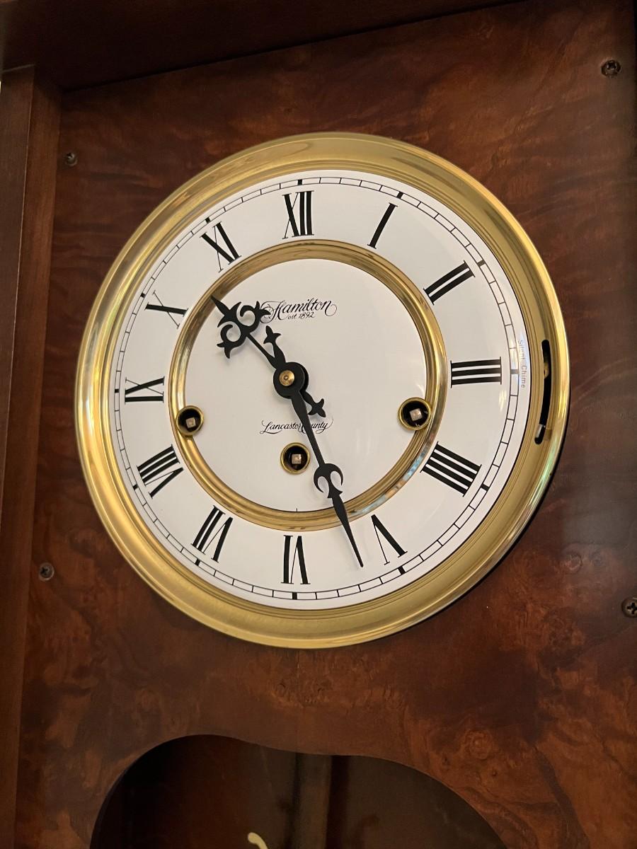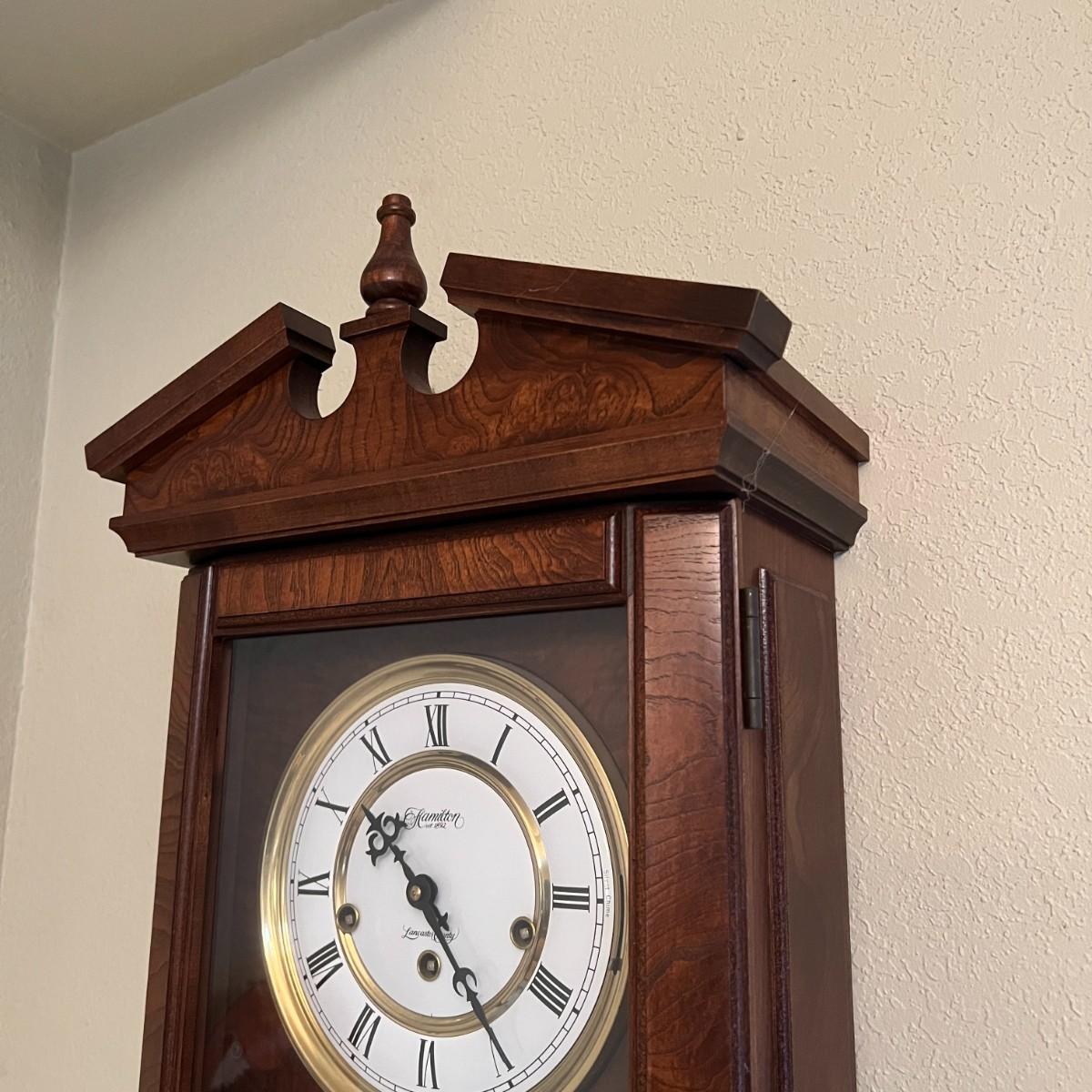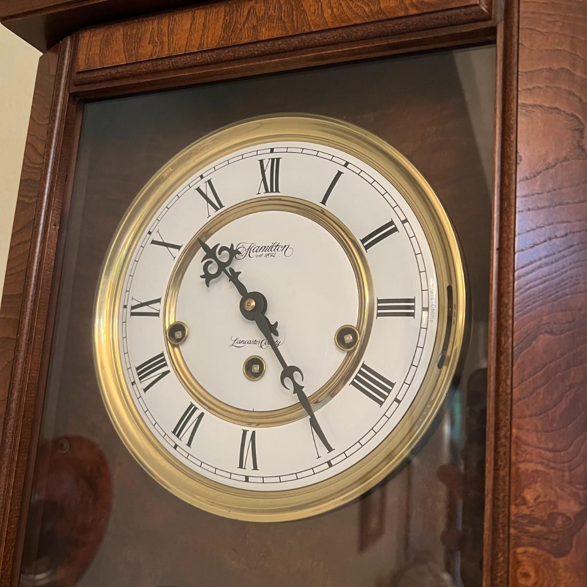 Antique Hamilton Est 1892 Lancaster County Wood (potentially a dark cherry burlwood) Wall Clock with crass metal details. In very good working condition, as shown in images, includes the winding key. Family heirloom - was grandparents clock we are told, or perhaps great grandparents. Nice sound!