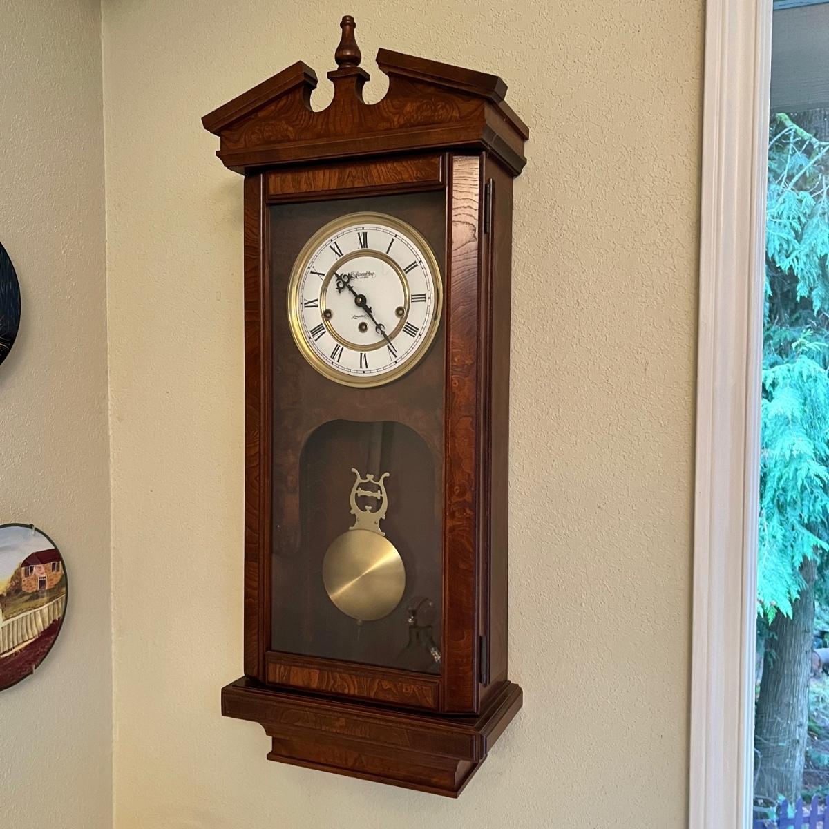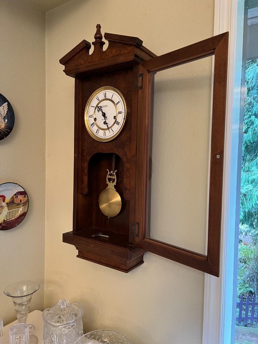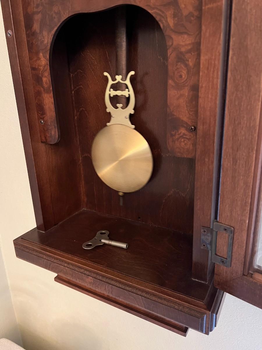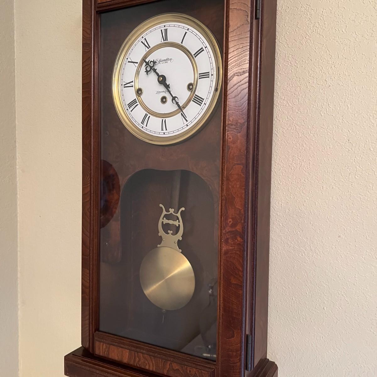 Antique Hamilton Est 1892 Lancaster County Wood (potentially a dark cherry burlwood) Wall Clock with crass metal details. In very good working condition, as shown in images, includes the winding key. Family heirloom - was grandparents clock we are told, or perhaps great grandparents. Nice sound!