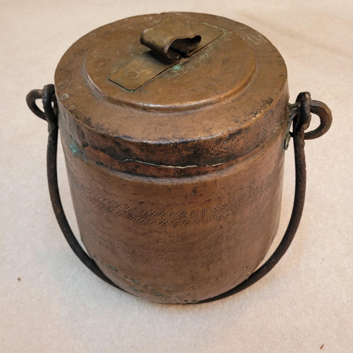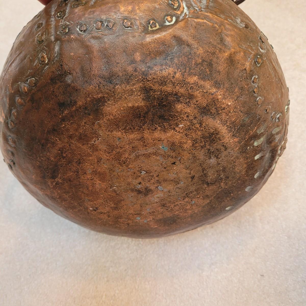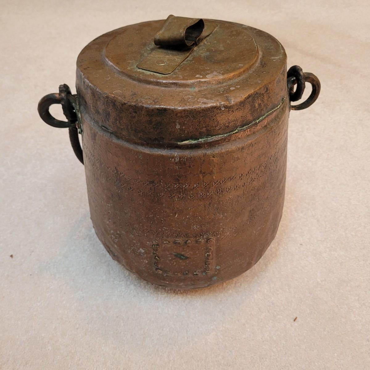 This is an antique-style hammered copper pot, likely a bean pot or cauldron, with a lid and handle. Made from copper and appears to be hand-hammered. Features a lid with handle and larger carrying handle. Has some signs of age. Pot measures approximately 14" x 10" x 13"H.