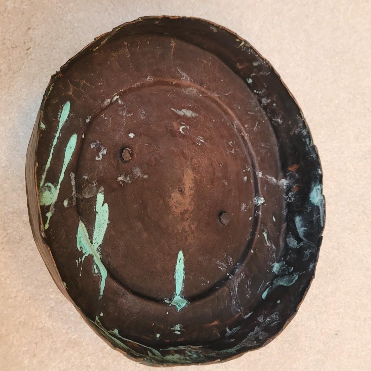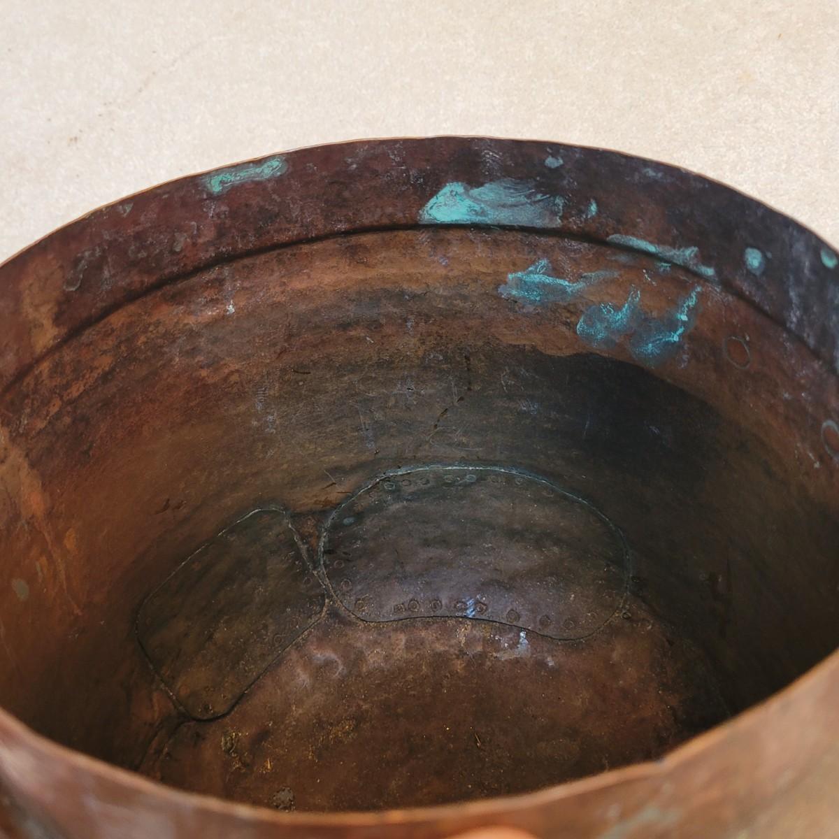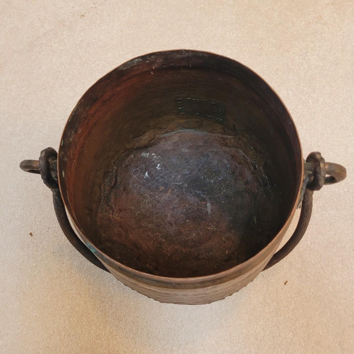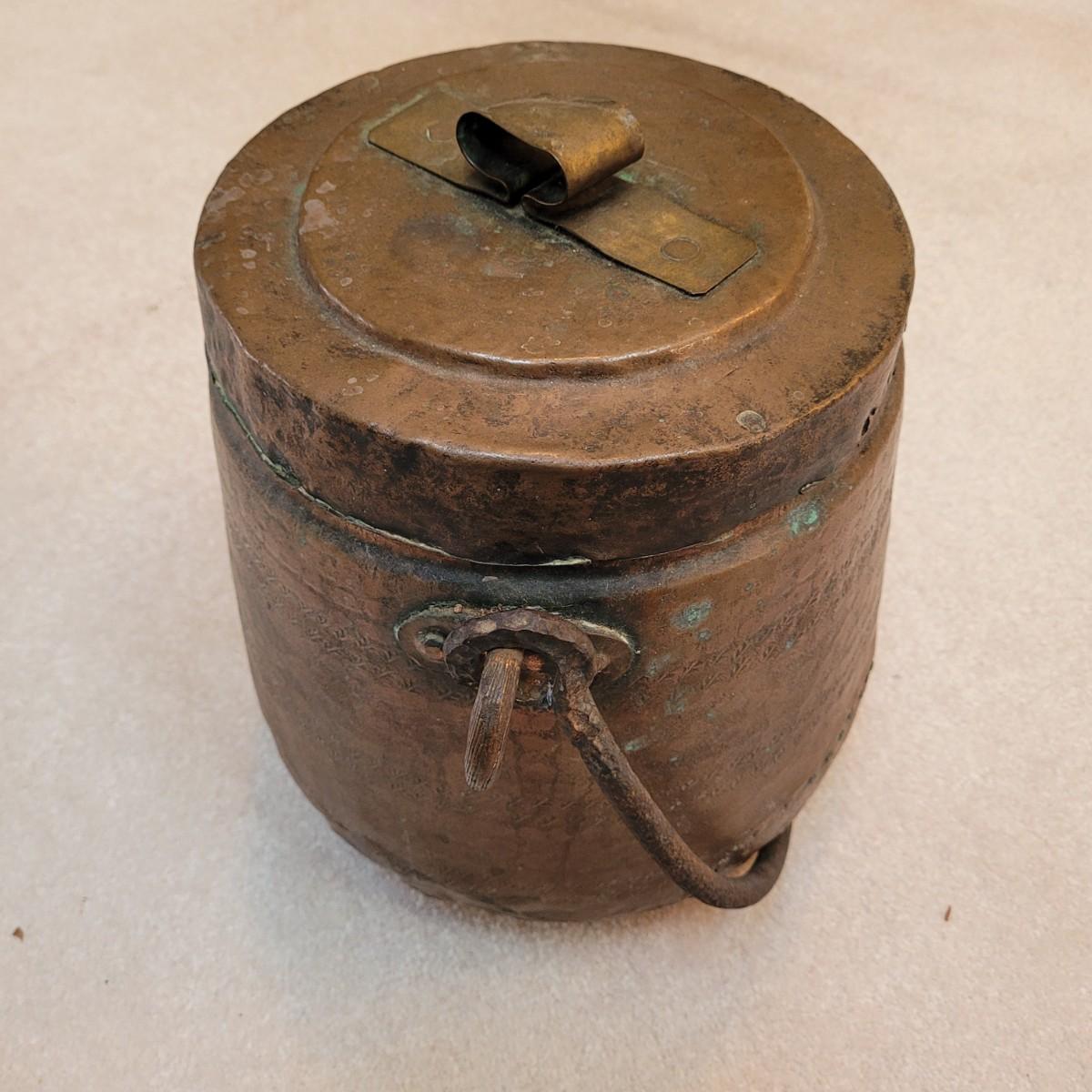 This is an antique-style hammered copper pot, likely a bean pot or cauldron, with a lid and handle. Made from copper and appears to be hand-hammered. Features a lid with handle and larger carrying handle. Has some signs of age. Pot measures approximately 14" x 10" x 13"H.