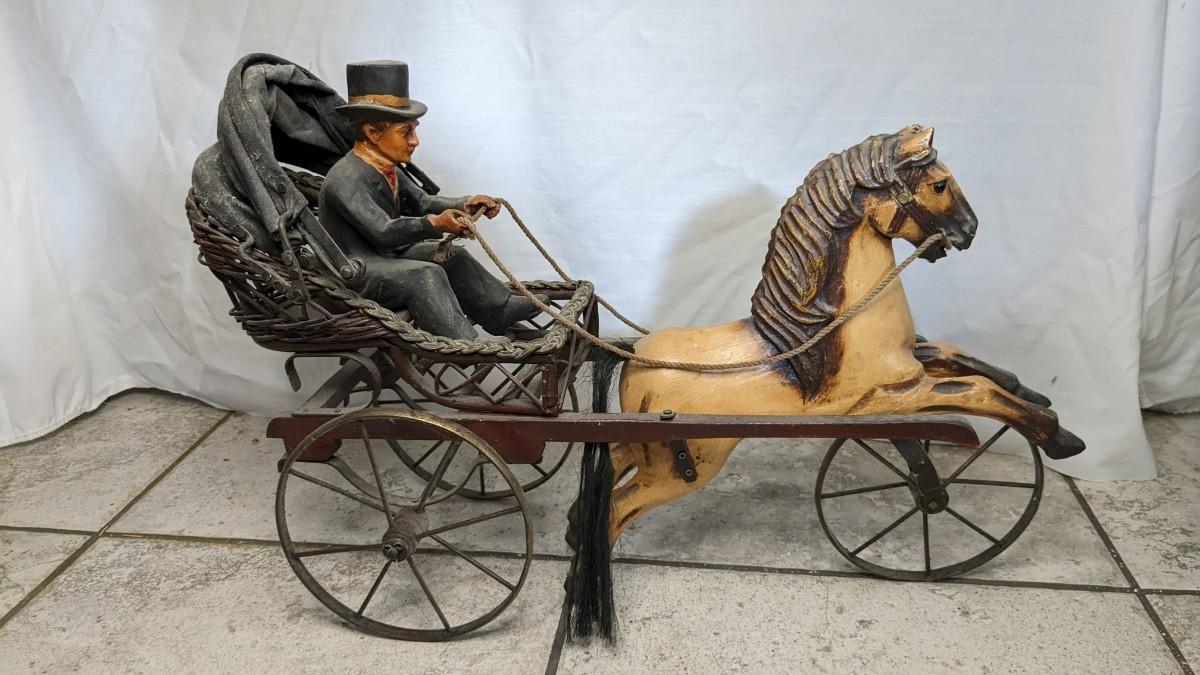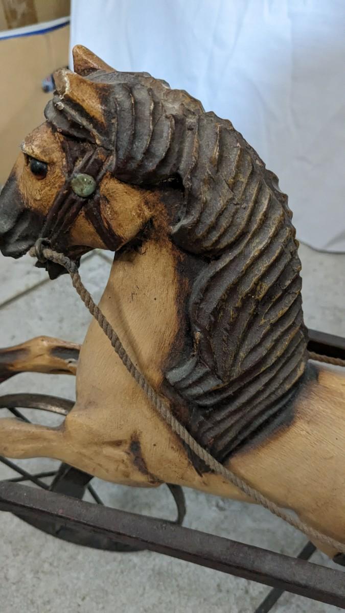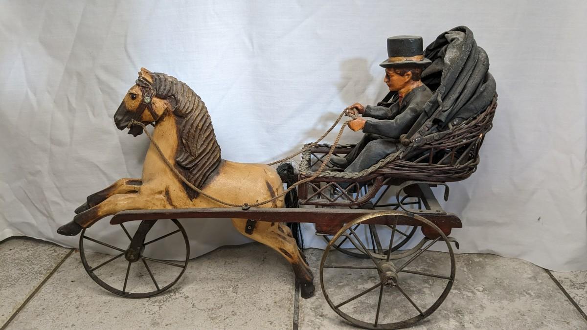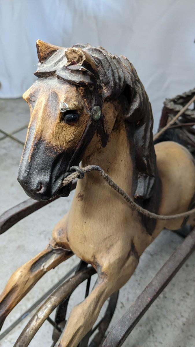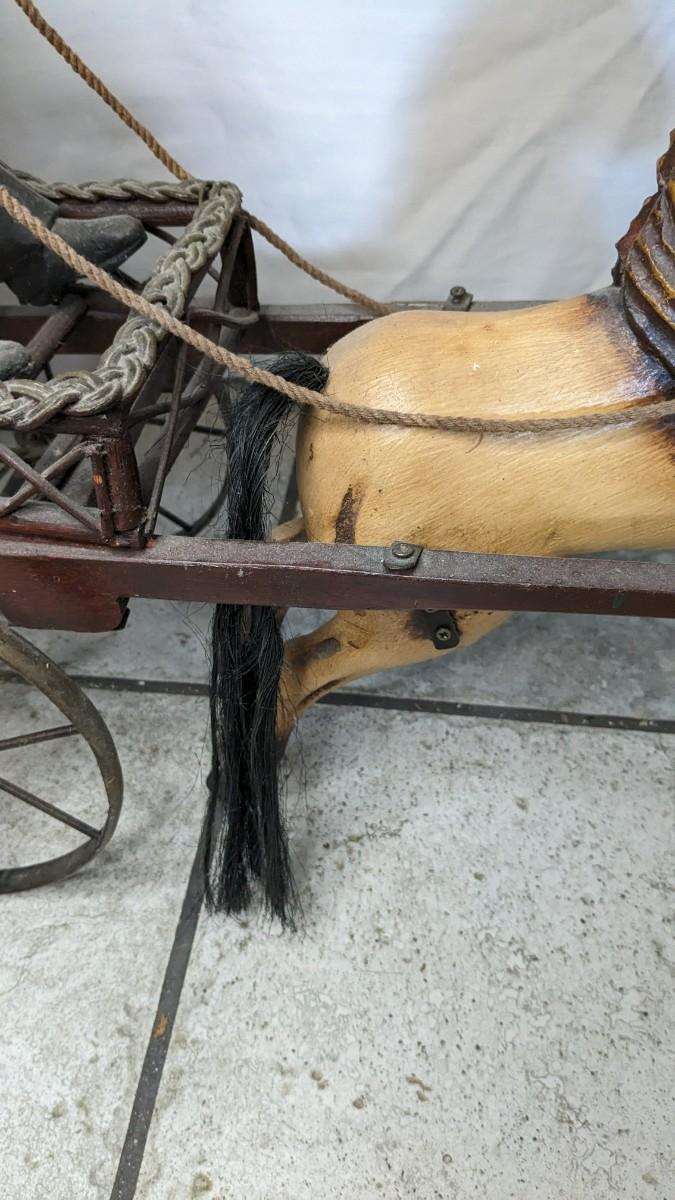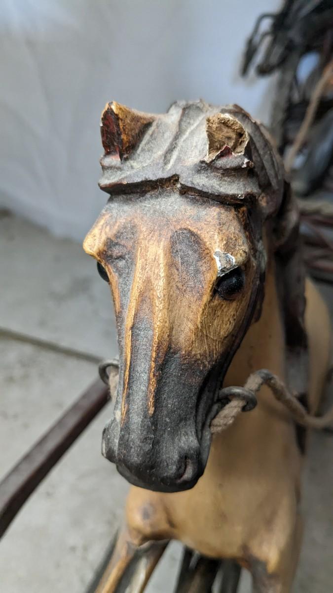24"x 9.5"x17" tall. A stunning display piece handcrafted from wood, wicker, paper mache, and brass. horse tail features real hair. Front arm was previously broken and has been repaired, this is the only flaw noted. Extra handling fees will apply.